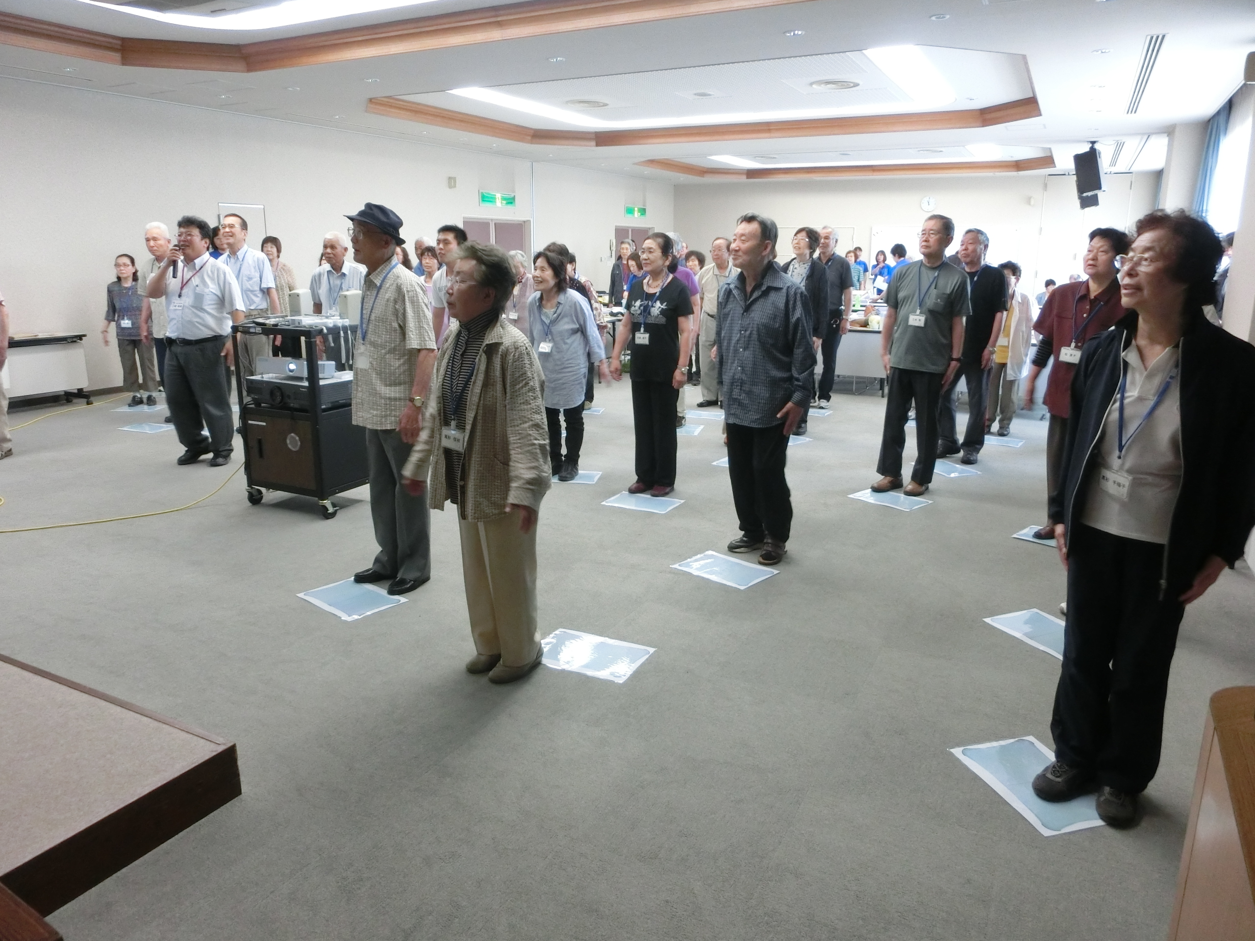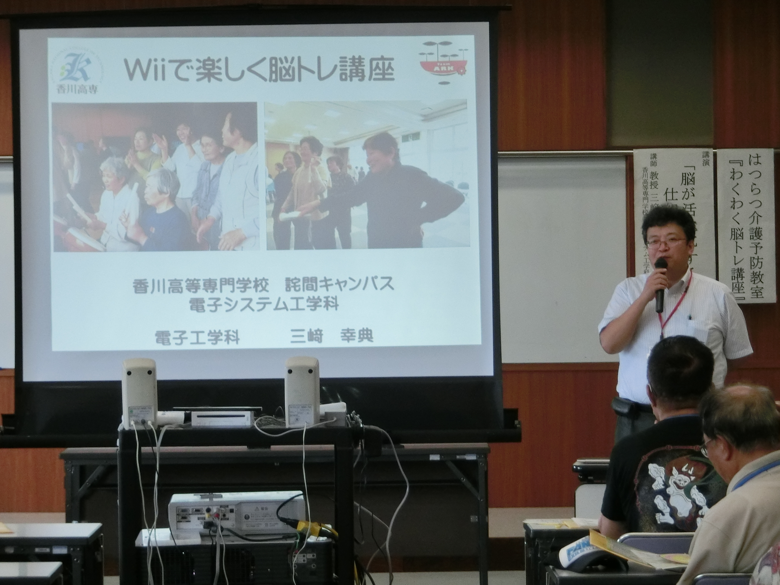 第1回目となった今回は、「脳」が活性化するしくみについて本校電子システム工学科三崎教員によるプレゼンテーションを行いました。その後、家庭用ゲーム機「Wii」を用いたリズム運動のやり方を学生がデモンストレーションし、参加者全員で画面のリズムに合わせた運動を行いました。最初は緊張して動きが固かった方も、少し続けるうちに自然と笑顔がこぼれ、動きを楽しむ余裕が出てきました。