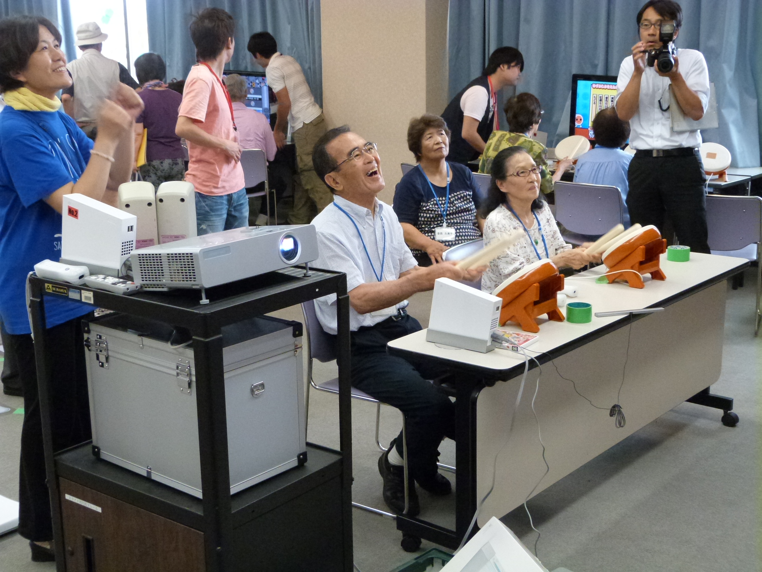 第2回目の今回は、家庭用ゲーム機Wiiを使い音楽に合わせて太鼓を叩く太鼓の達人、Wiiボードを使った有酸素運動、バランス運動などを用意しました。ゲームの順番を待つ間に後ろで練習をしたり、失敗して大きな声で笑ったりしながら、意欲的にゲームを体験いただきました。