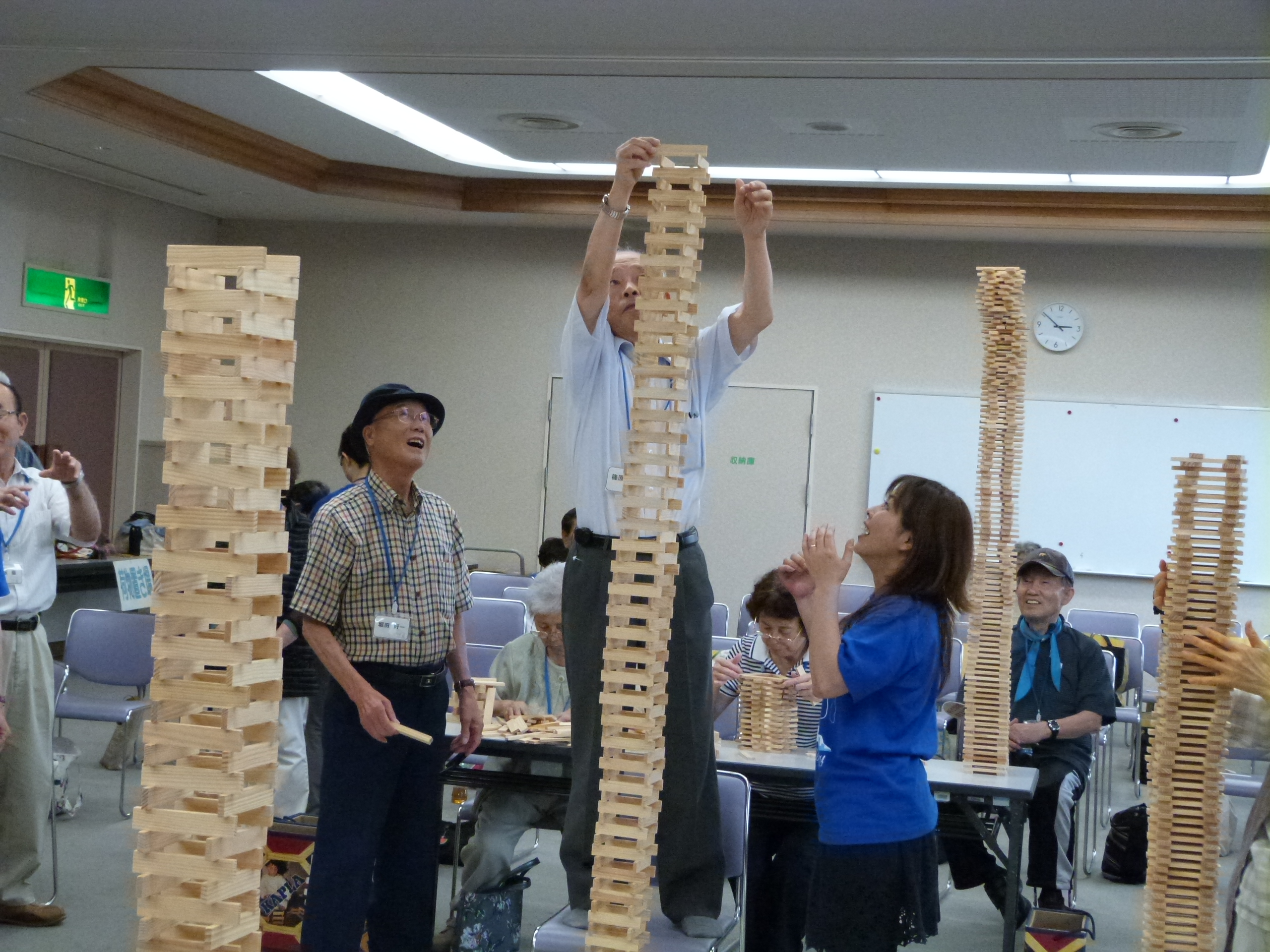 また、造形ブロック「カプラ」にも挑戦していただきました。小さな積み木を根気よく参加者が協力したり、アドバイスしながら積み上げ、最後は椅子に登ったり背伸びをして積み上げる高さになり、周囲から応援の声や歓声が上がっていました。