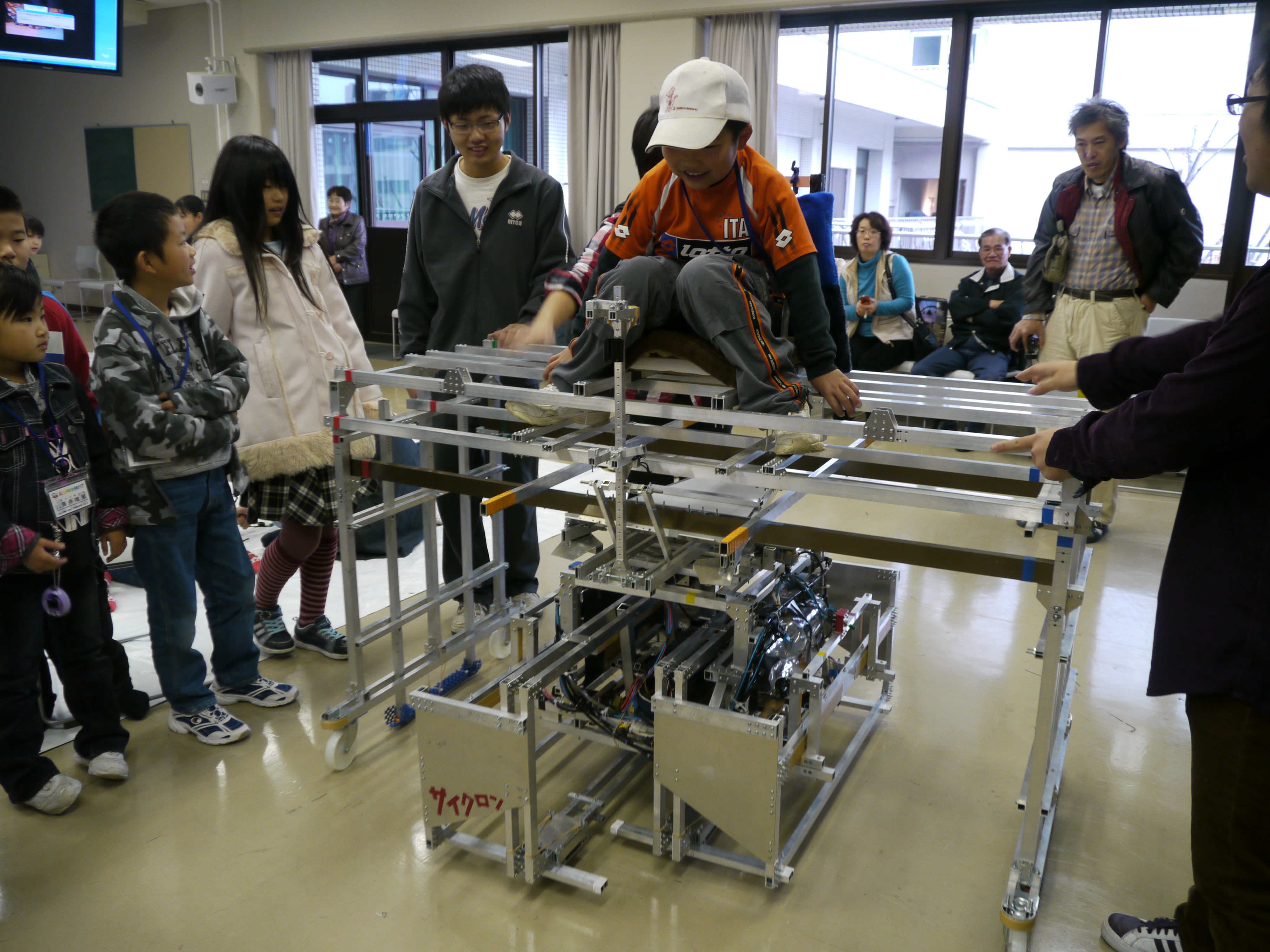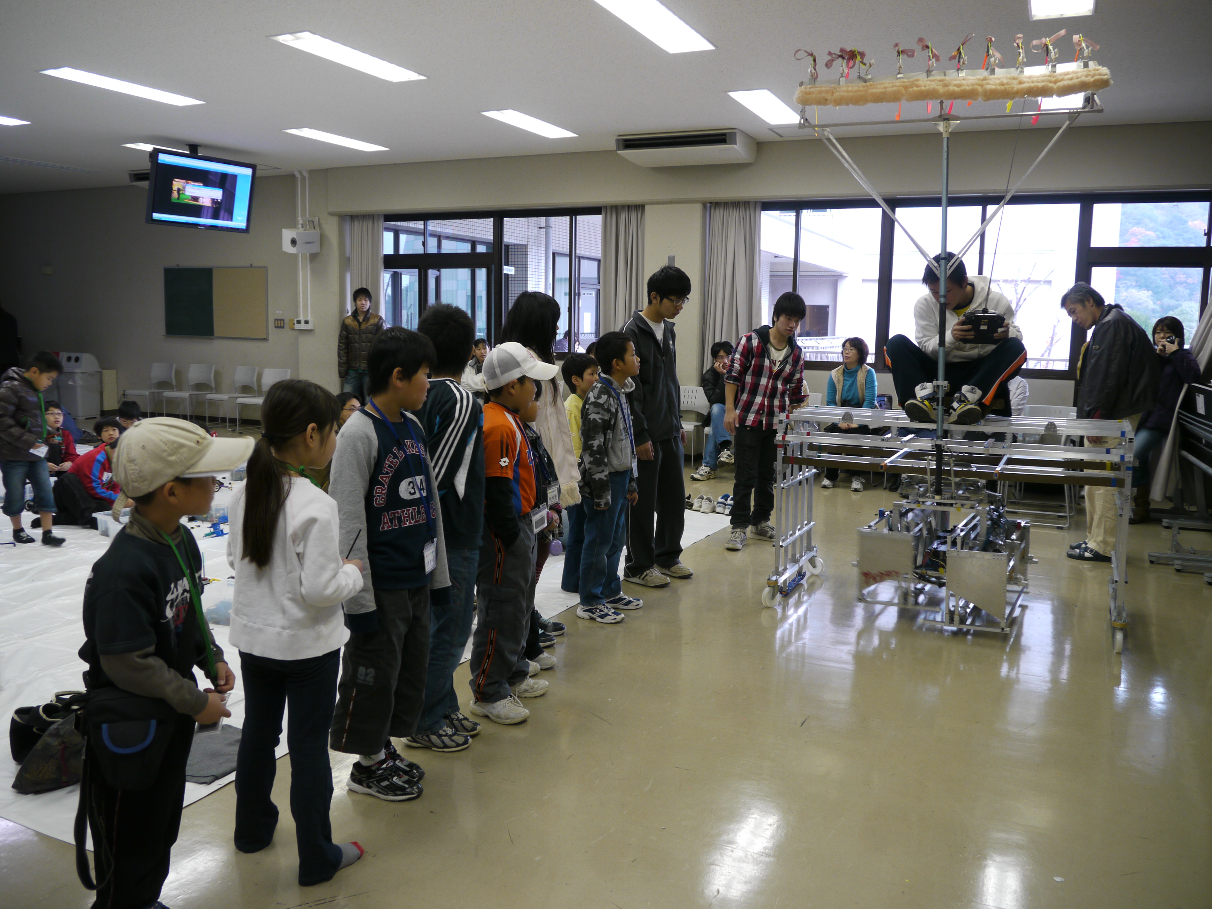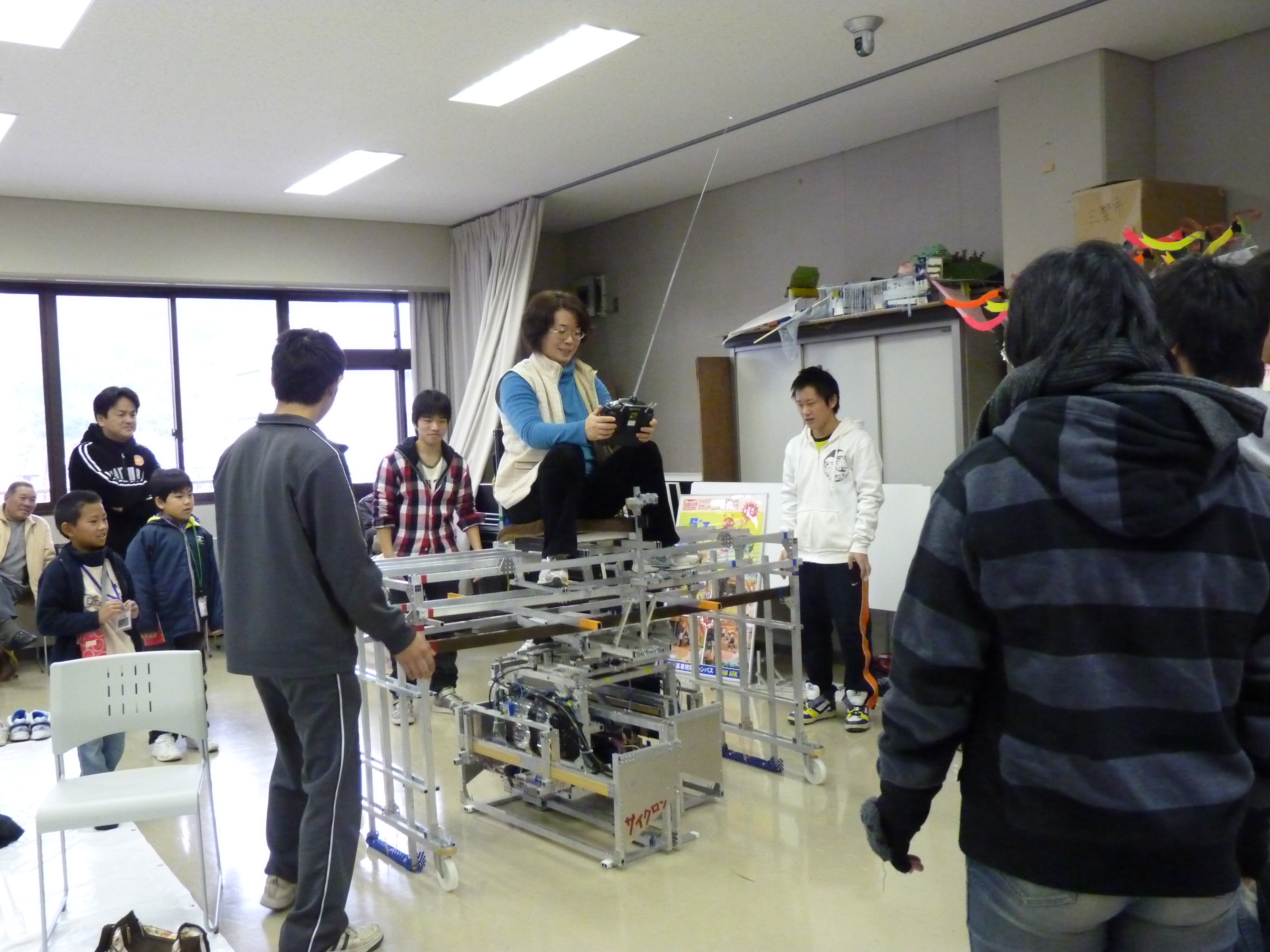高専ロボコン2010全国大会後初めての活動でもあった為、高専ロボコン2010でベスト4となった詫間キャンパスチーム「Cyclone」(サイクロン) の活躍をプレゼンテーションとビデオで見て頂き、実際のロボットを体験しました。ロボットの動きによる大きな音に初めは圧倒されていた子供達も、実際にロ ボットの操縦席に乗ってその振動を体感し、楽しそうにしていました。