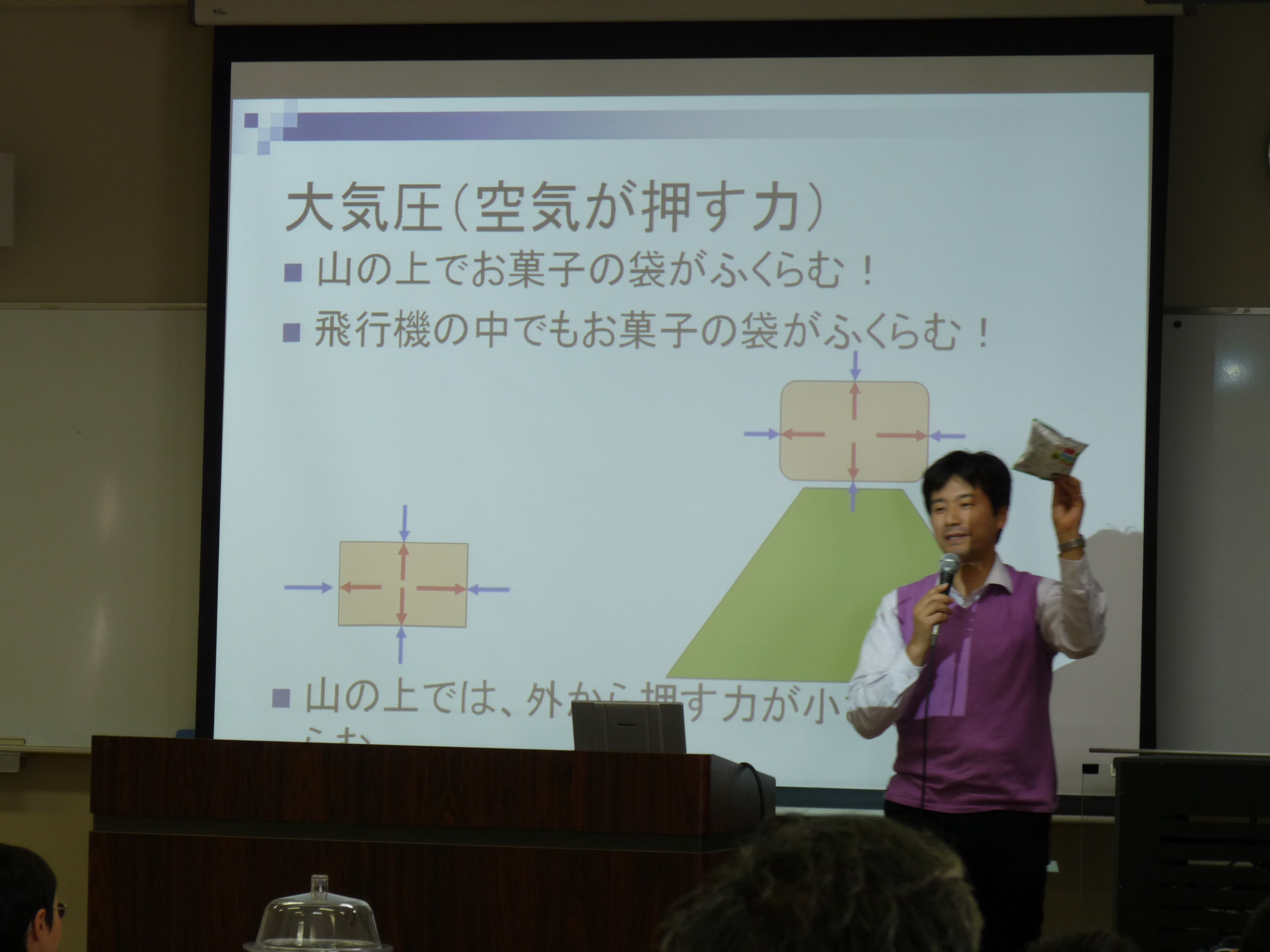 今回は「空気の圧力と流れ」をテーマに、真空ポンプを使用して圧力を変化させる実験や、マグデブルグの半球、ベルヌーイの定理といった難しい定理を家庭用のステンレスボールや紙で分かりやすく再現してみせてくれ、子供達は夢中で実験の様子を観察していました。最後はエックスジャイロ(紙を筒状にして投げる事によって筒の中を空気が通り抜け、回転しながら飛ぶおもちゃ)を工作し、飛距離を競っていました。身近な道具を使った実験は子供達の関心も高く、楽しい実験教室でした。