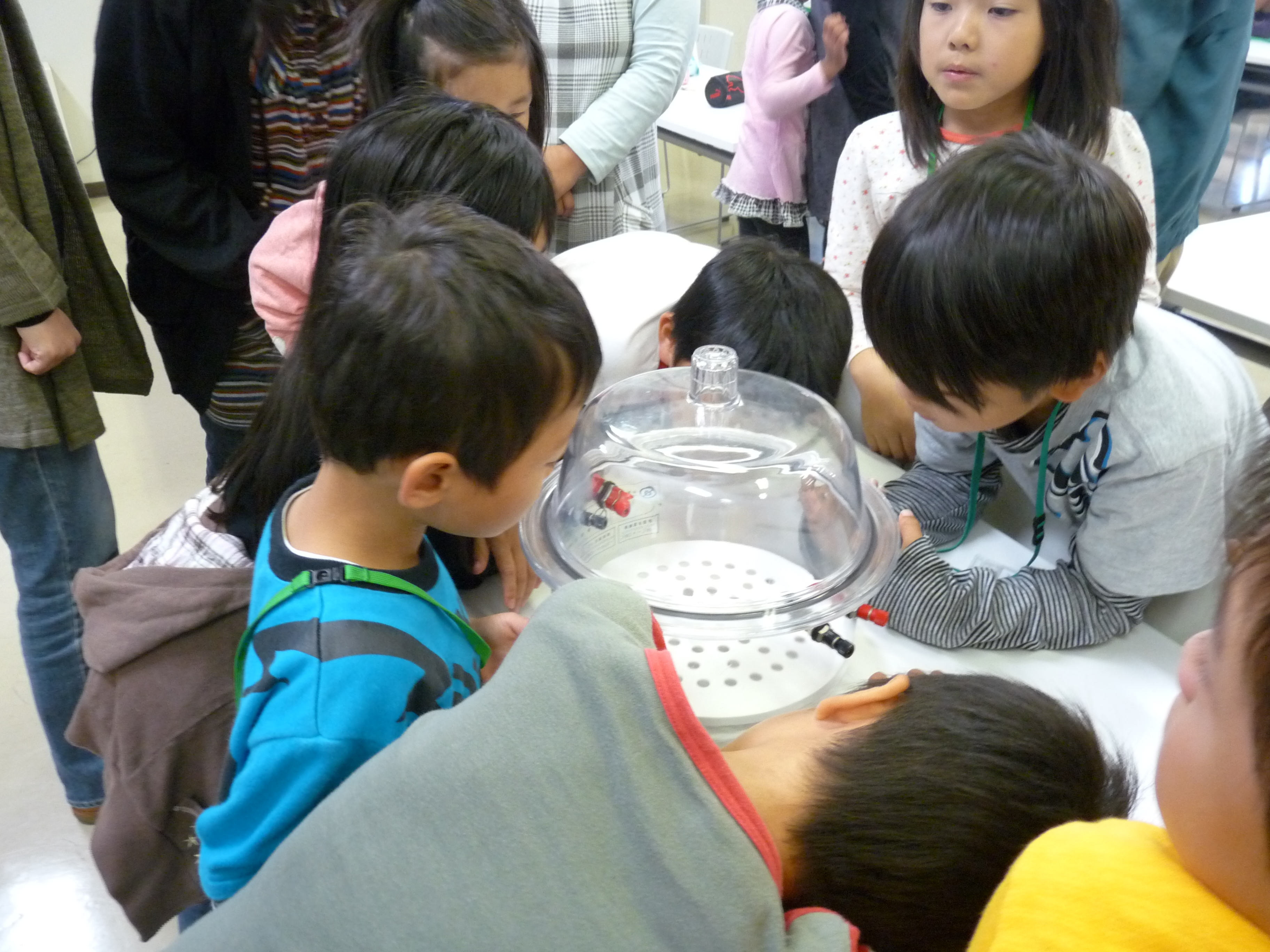 真空ポンプを使っての実験です。ポンプの中のマシュマロや風船の変化に子供達から歓声が上がります。