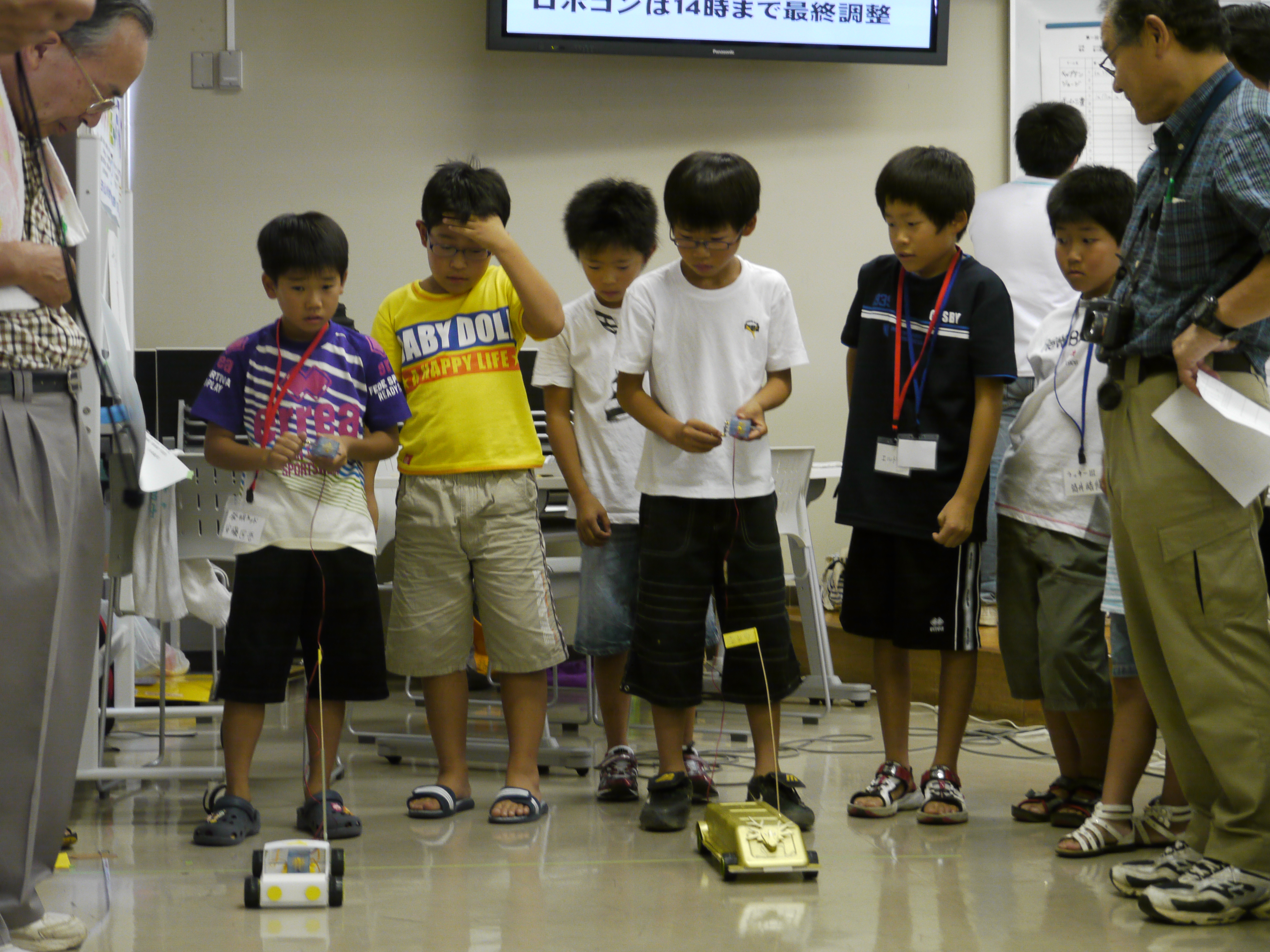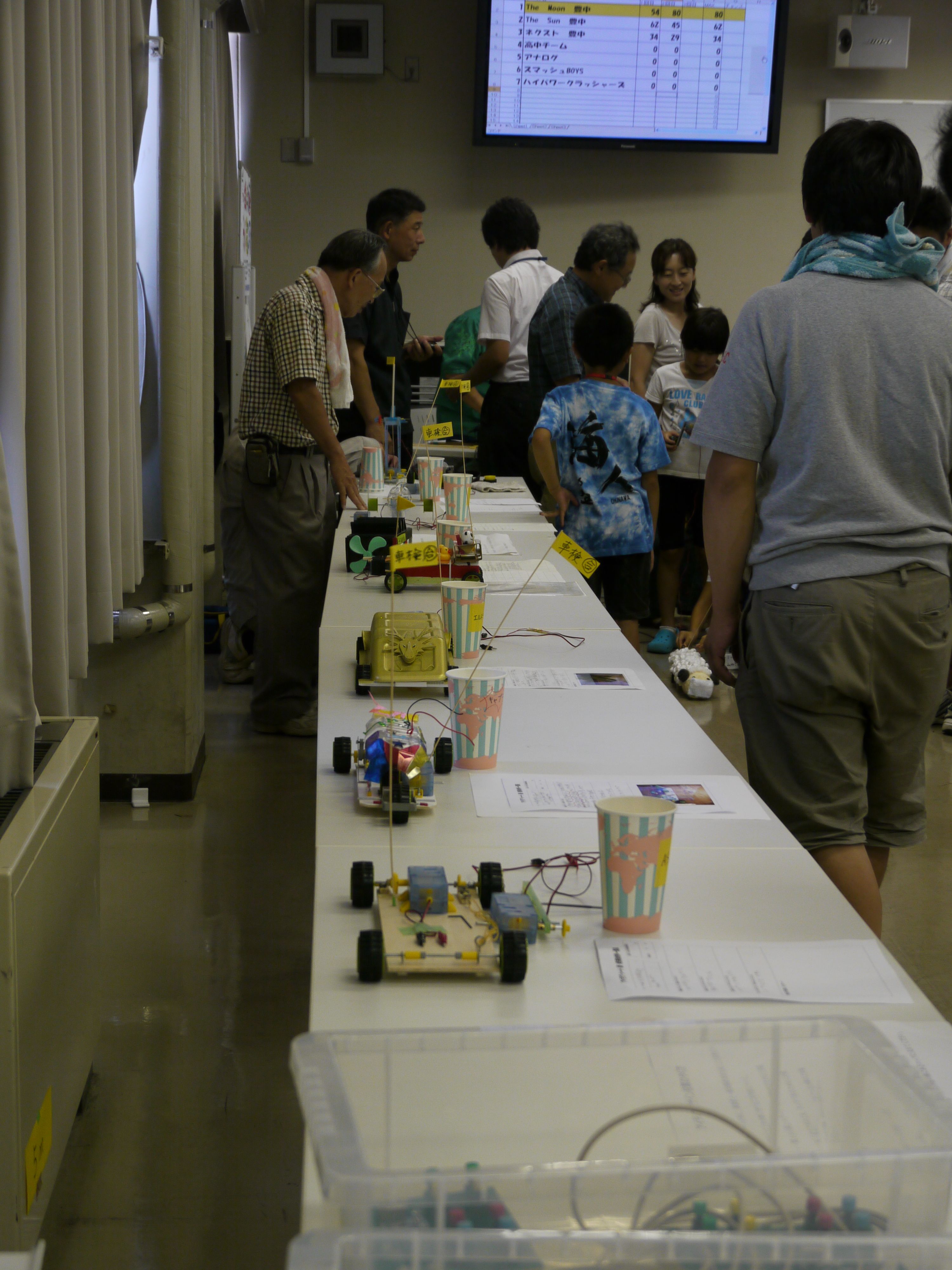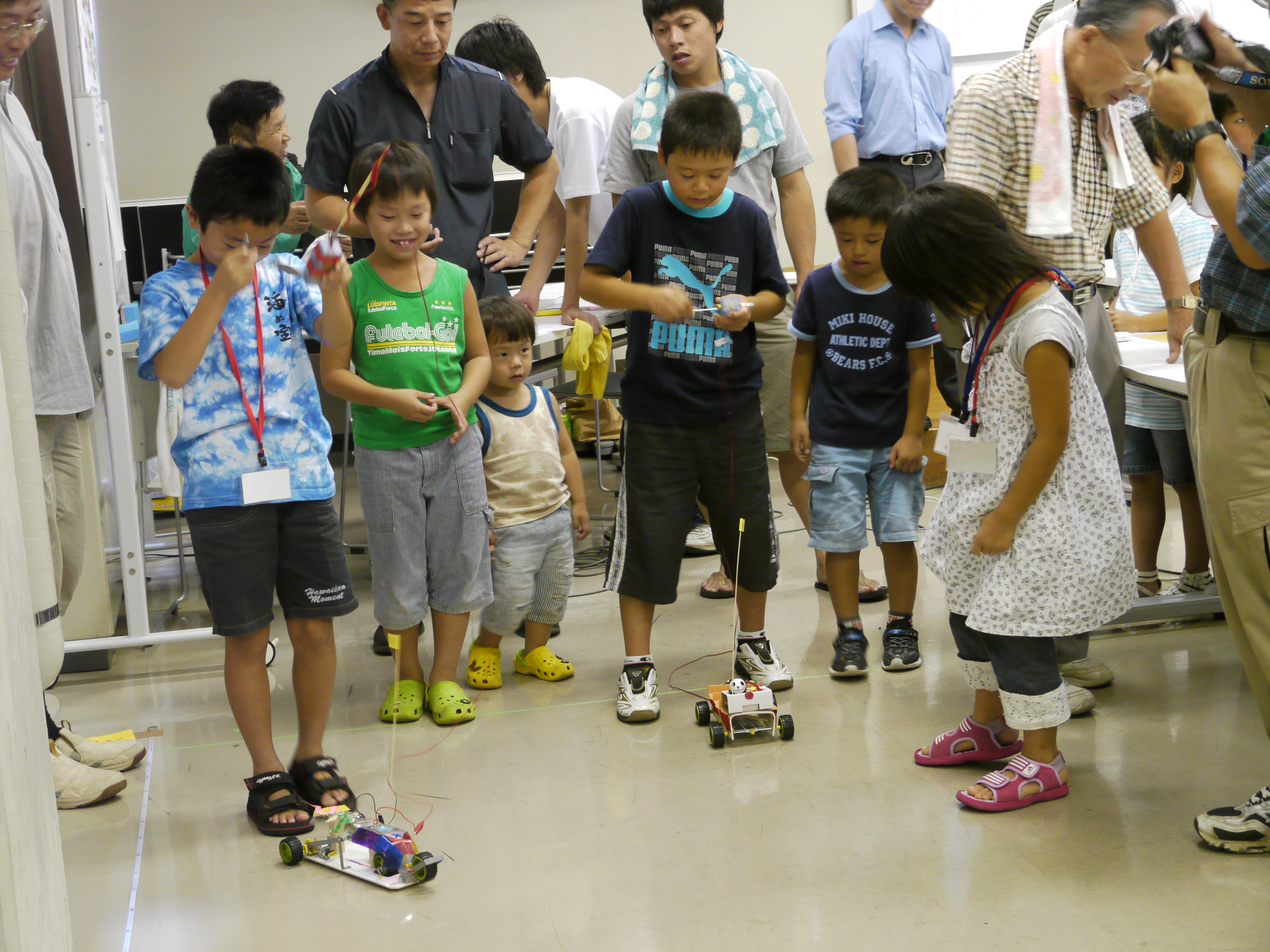 このコンテストは発明協会が今年から開催するコンテストで、今回のテーマは「高性能ハイブリッドカー」。モーターなどのキットは協会から同一のものが用意され、他にも細かなきまりがある中で、どれだけ効率よくゴム動力を蓄え、時間内に多くの距離を走行するかを競うものです。難しいテーマであったにも関わらず、7チームがエントリーし、2チームずつ走行競技を行いました。同じキットを使用していても、各チームの工夫により、走行距離やスピードにはかなりの違いがあり、子供達は他のチームの仕様に興味津々の様子。見守る保護者も感心した様子でした。