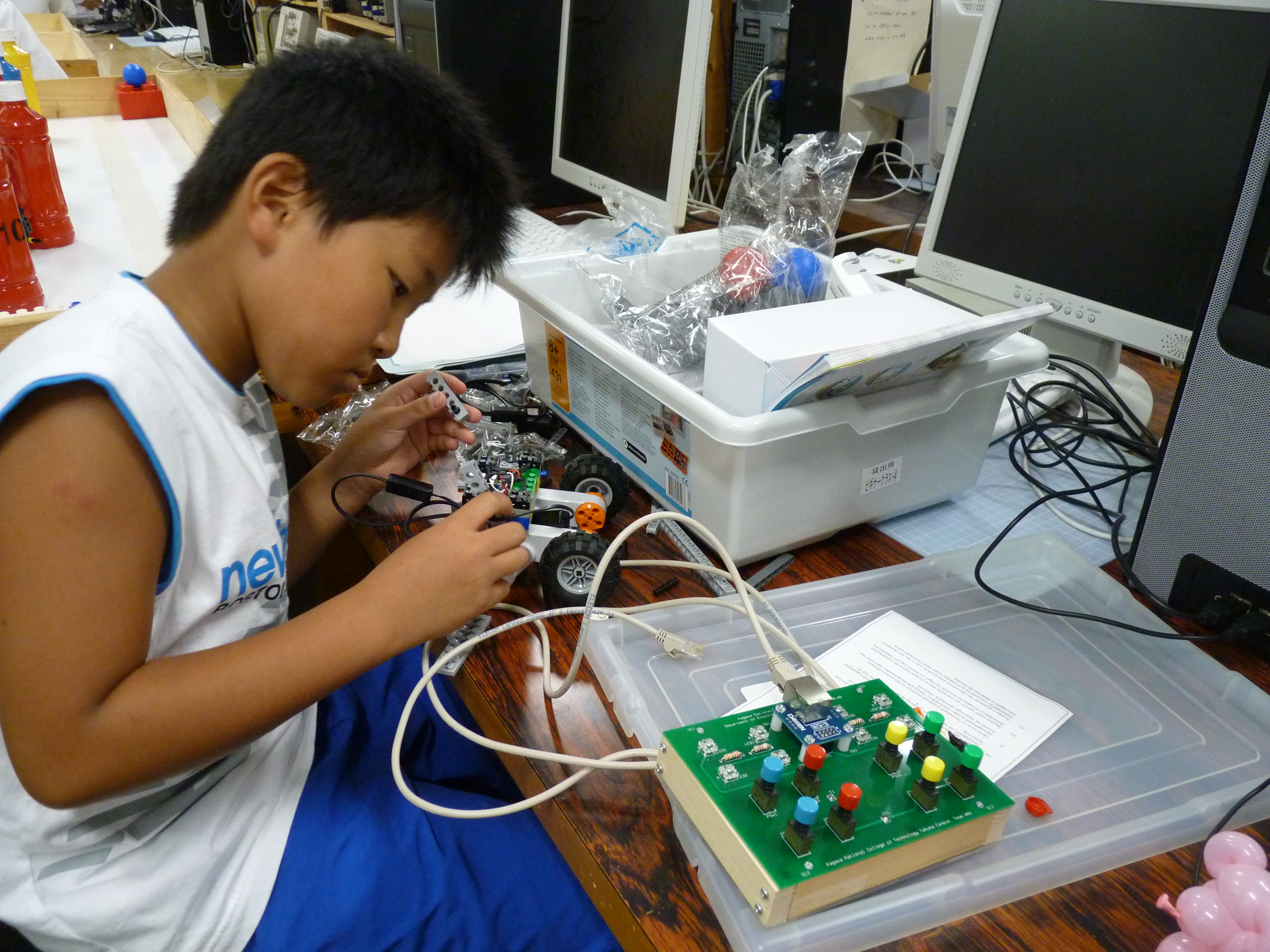 また、同じく22日(日)に開催の「みとよロボットコンテスト2010」に関し、この日は当日のルールが発表され、使用するロボットを1台ずつ手にした小中学生は早速ルールの確認とロボットの製作作業を行い、コンテストで使用されるフィールドで動作のチェックをしていました。