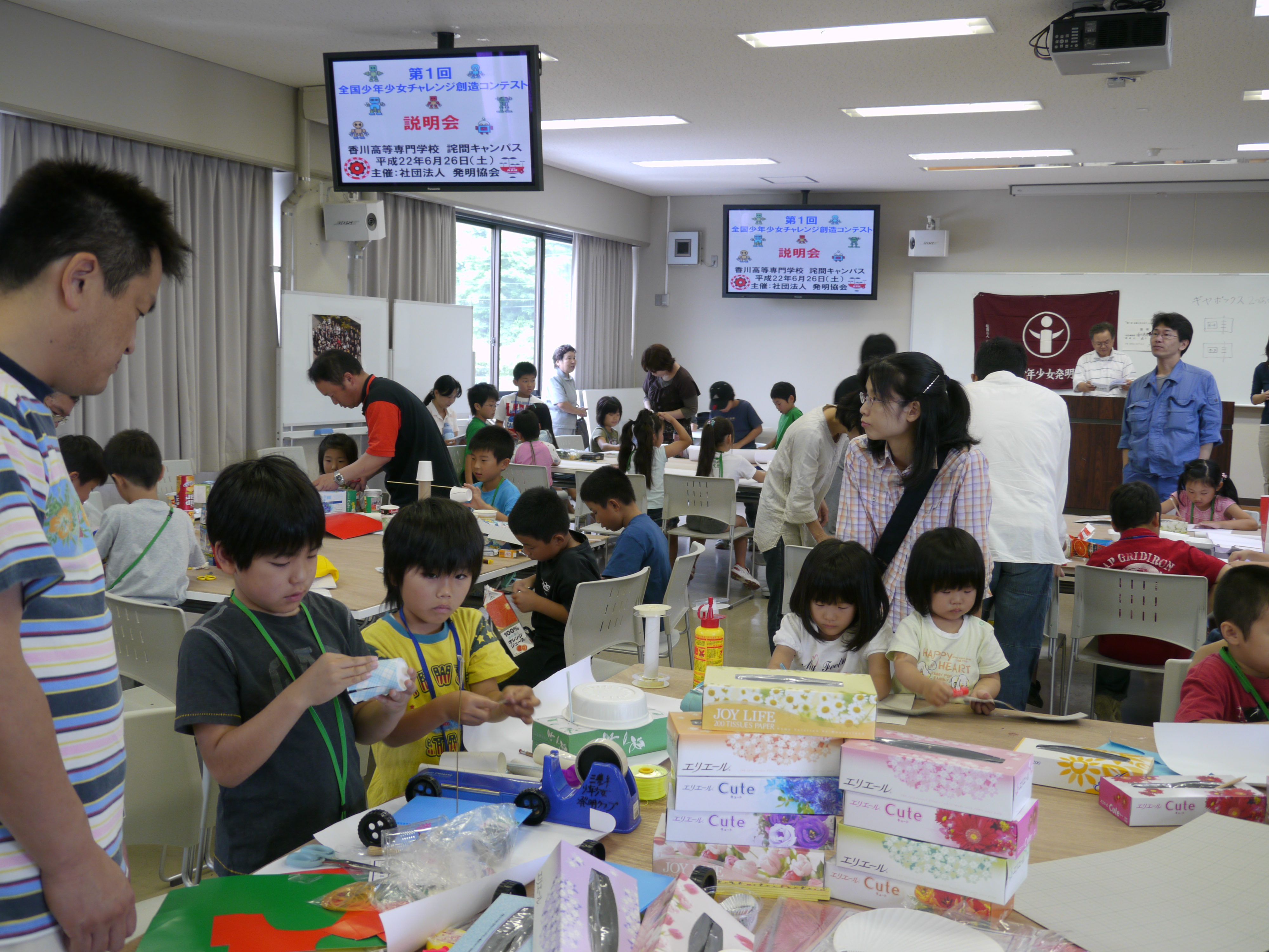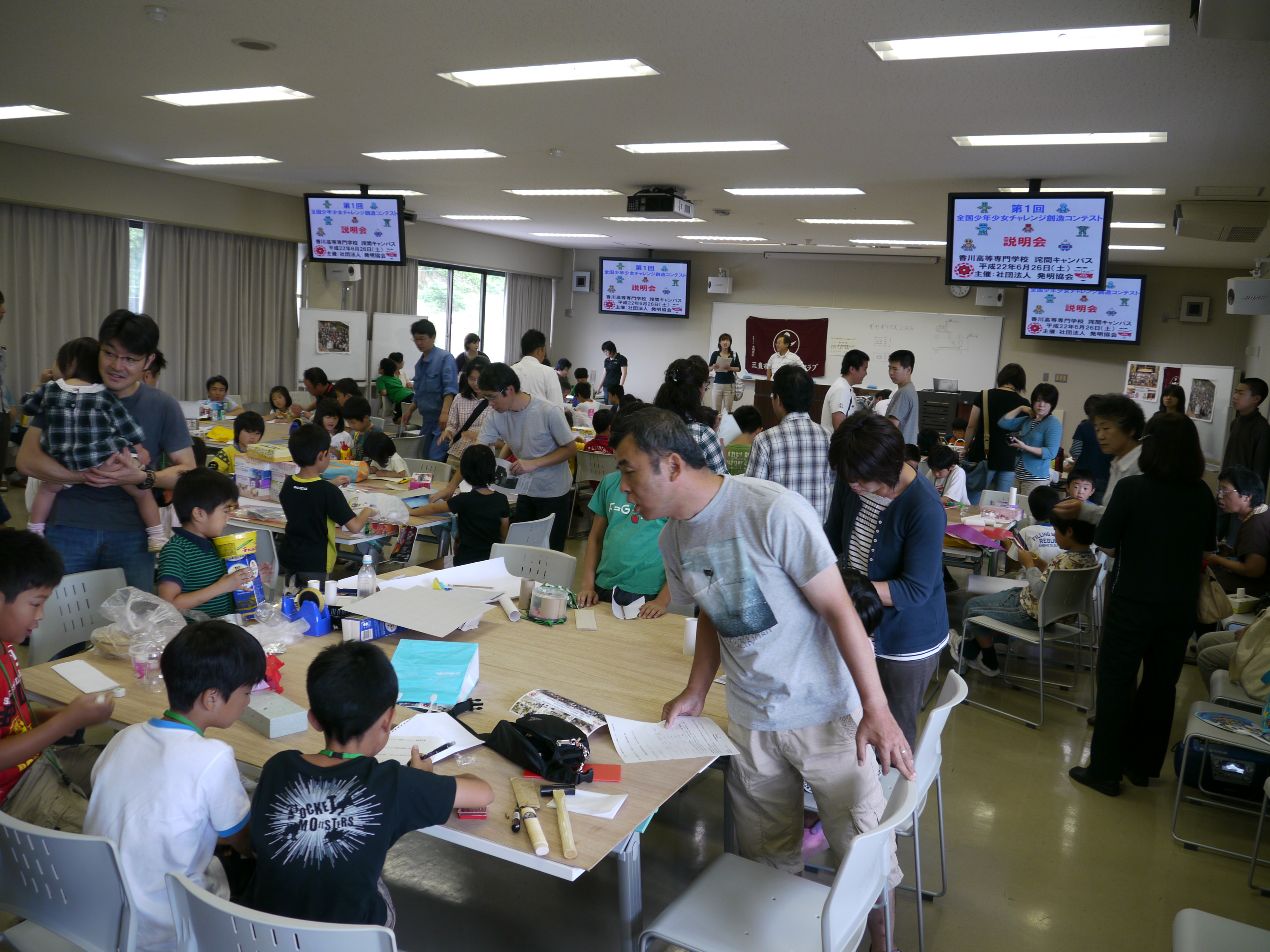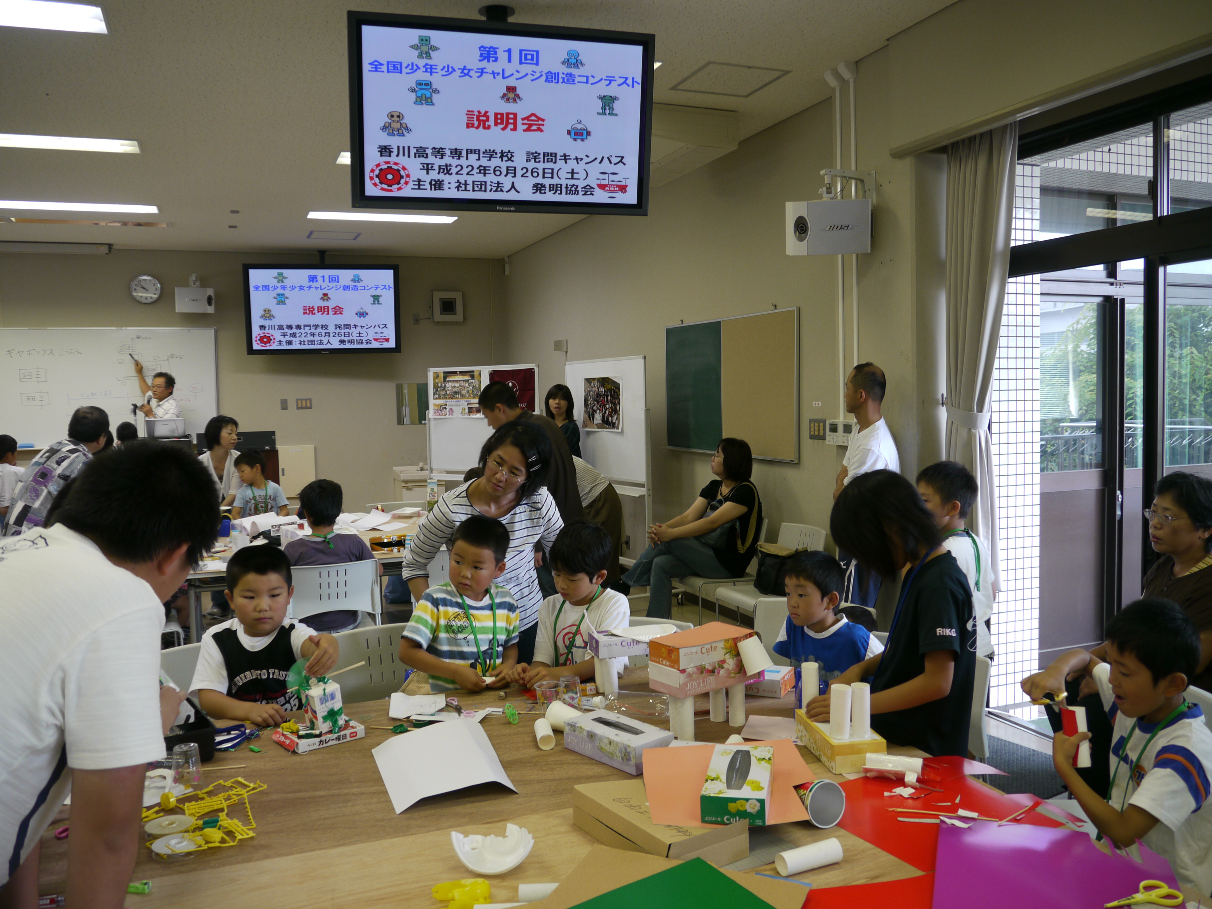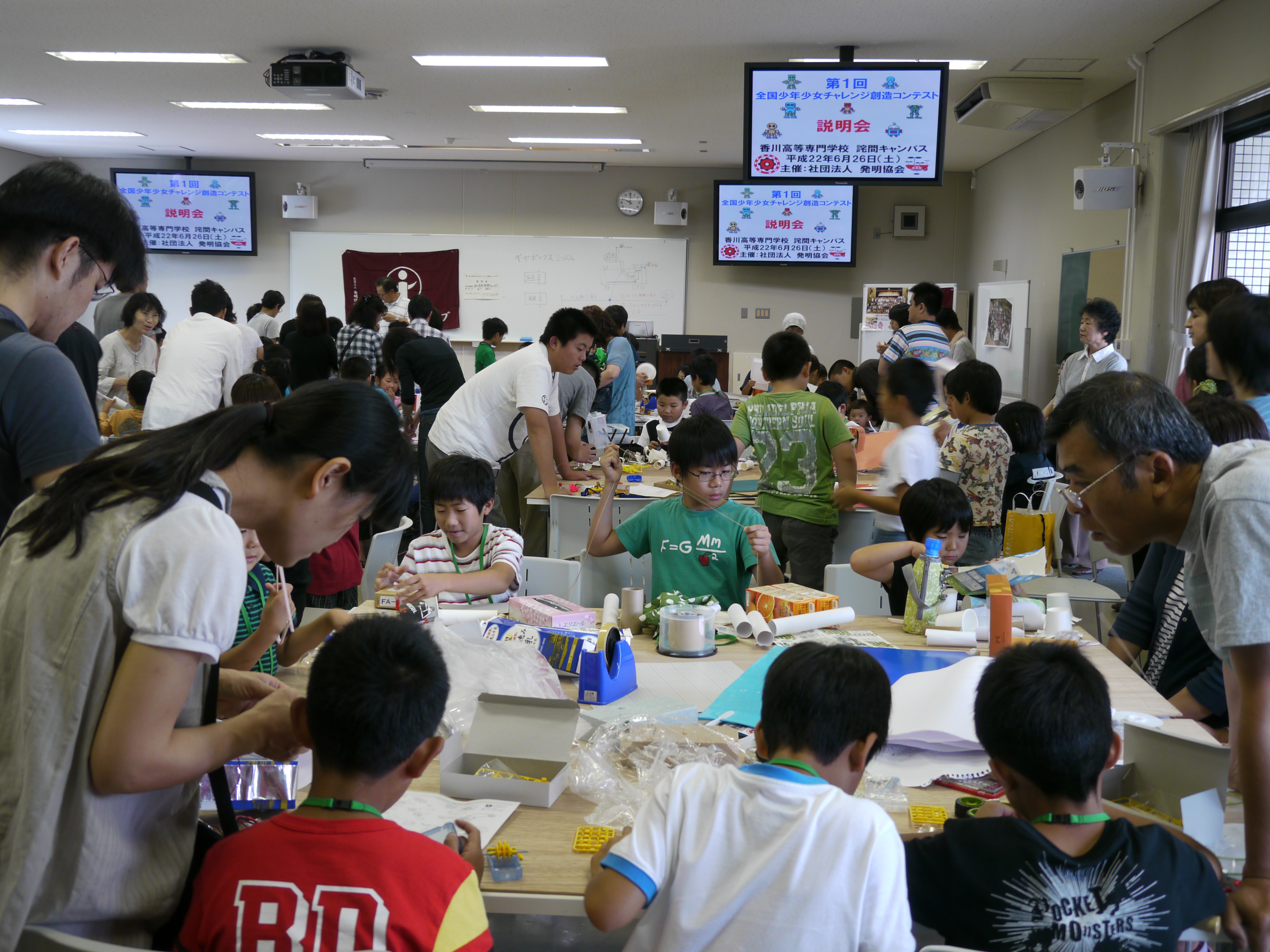 H22発明クラブ「発明くふう展作品づくり(1)」 2010/06/26 2010年6月26日(土) 9:00~11:00 香川高等専門学校詫間キャンパス第2講義棟第4講義室 H22発明クラブ「発明くふう展作品作り(1)」 三豊市少年少女発明クラブの活動として、発明くふう展に出品する作品作り(1)が開催されました。思い思いの材料を各自で用意し、作品作りに励んでいました。