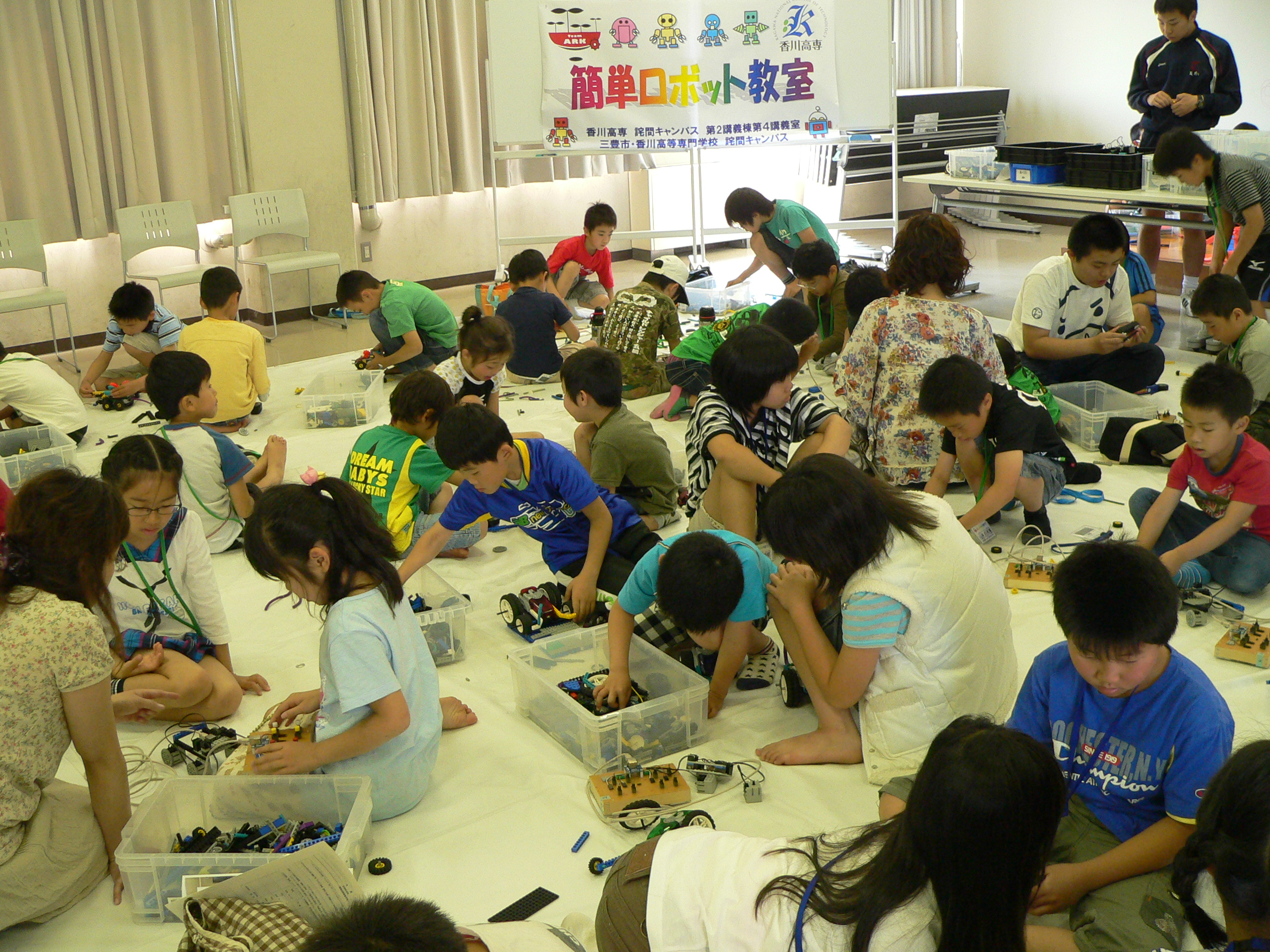 三豊市少年少女発明クラブの活動、及び平成22年度香川高専公開講座として、簡単ロボット教室(2)が開催されました。1回目で作り方を覚えた子供達は、更に高度でおもしろいロボットを作るべく友達や高専の学生に相談をしながら次々とロボットを組み立てていました。