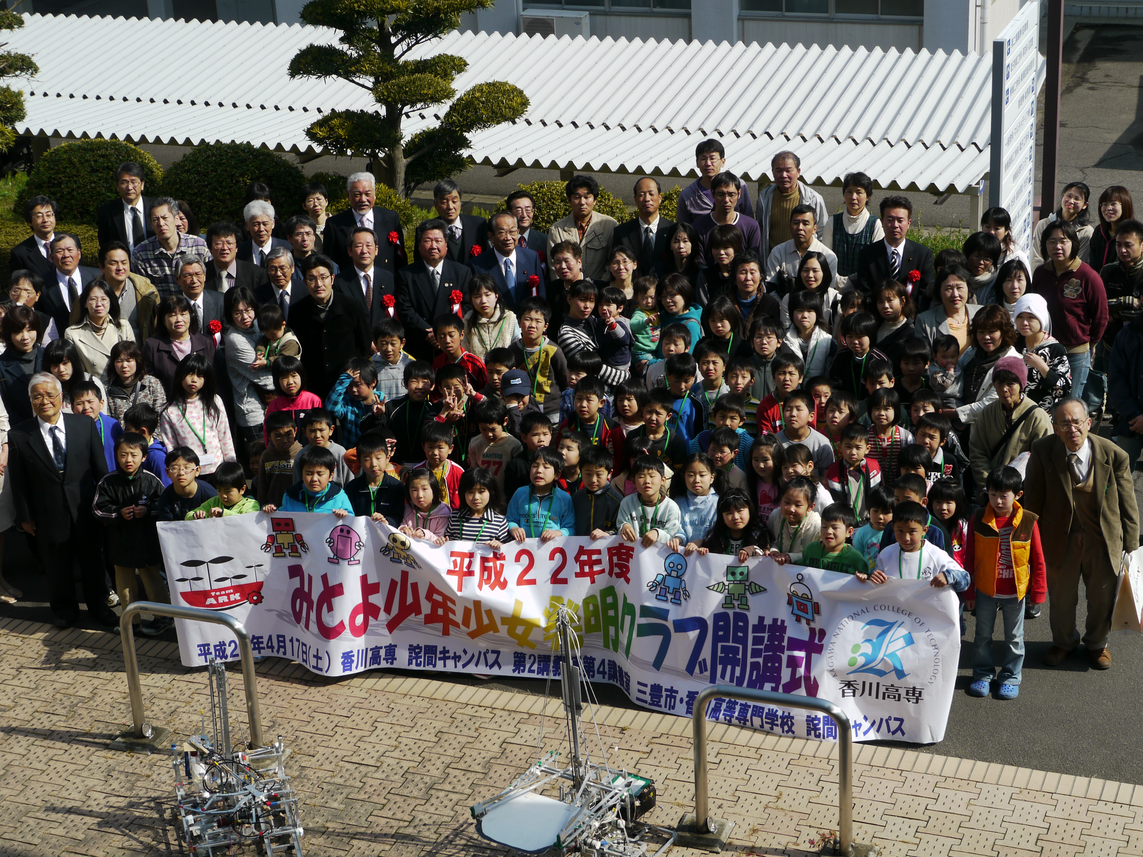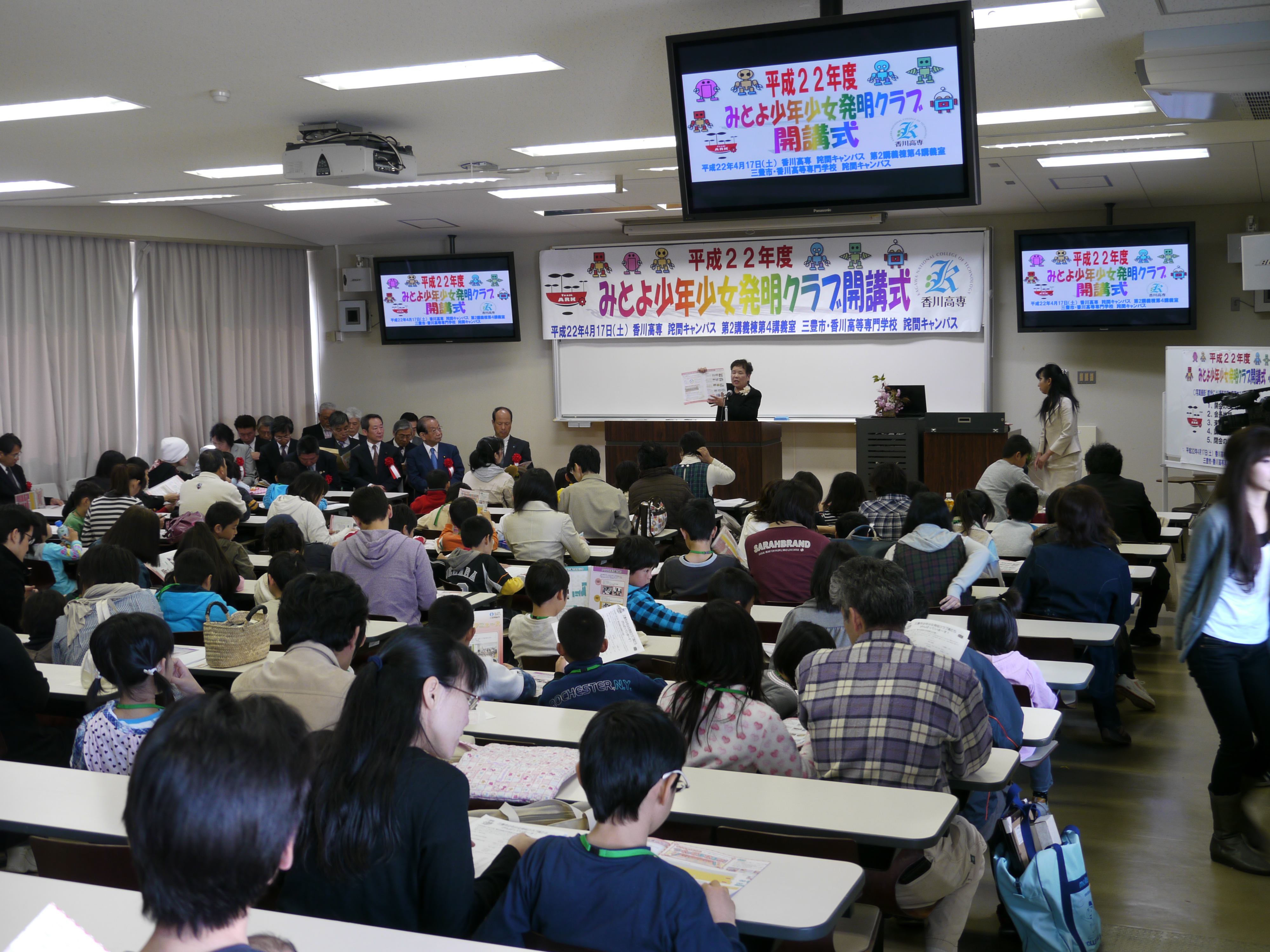 H22発明クラブ「開講式」 2010/04/17 2010年4月17日(土) 9:00~11:00 詫間キャンパス第2講義棟第4講義室 H22年度発明クラブ「開講式」 平成22年度三豊市少年少女発明クラブの開講式が行われました。会員も県内外を問わず100名に届く程となり、ますますの発展が期待できそうです。 当日は三豊市長を始め、たくさんの来賓の方々もお祝いに駆けつけてくださり、活気溢れる開講式となりました。