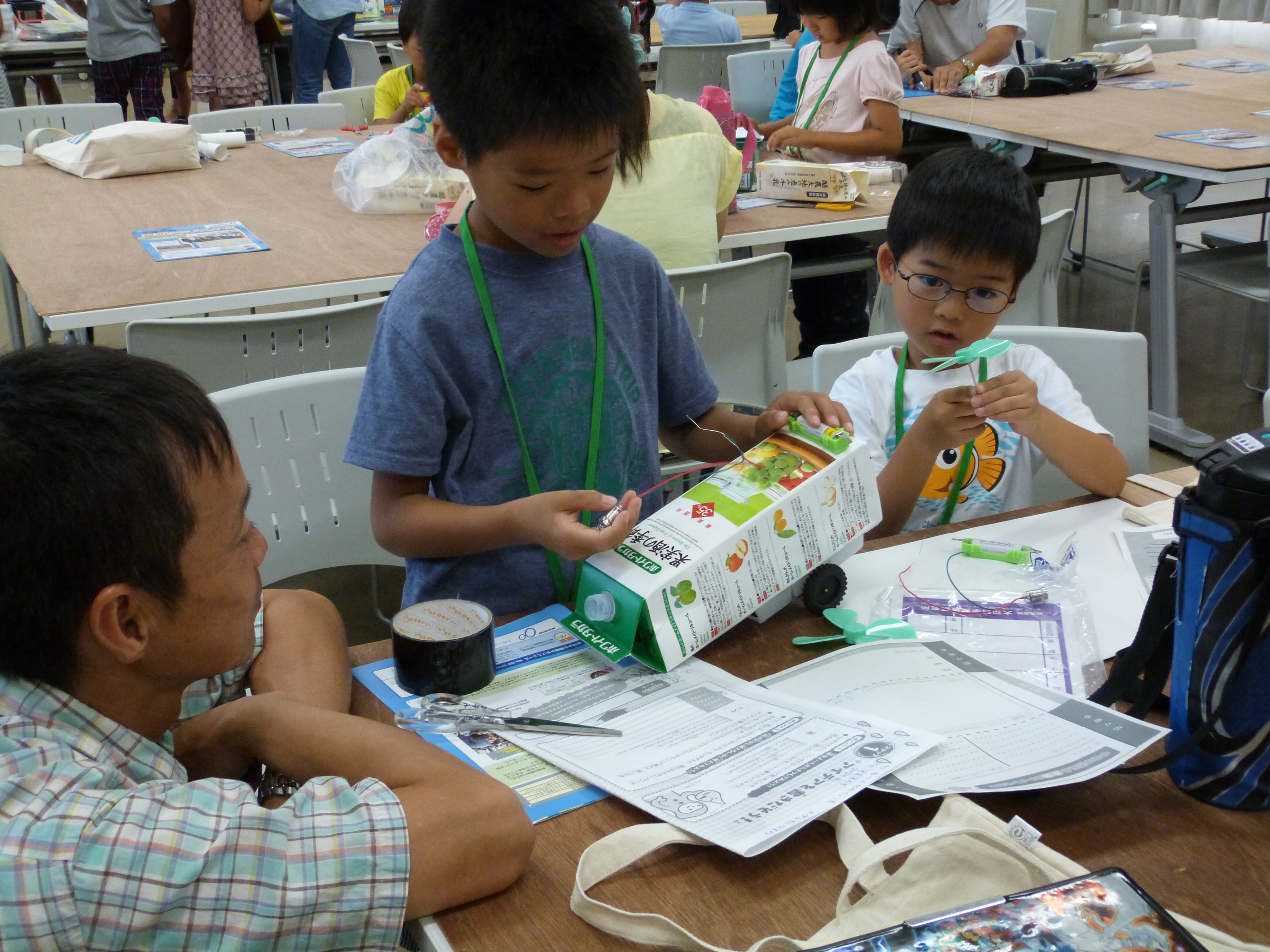 楽しいアイディア工作・発明くふう展作品づくりへの参加者は、持参した材料を使用した工作をしました。クラブにはたくさんの工具があり、「TEAMARK」の学生がカッターなどの使用をサポートしました。アイディア、イメージを膨らませ、次々と切ったり貼ったりしながらたくさんの面白い工作が作られていまいた。