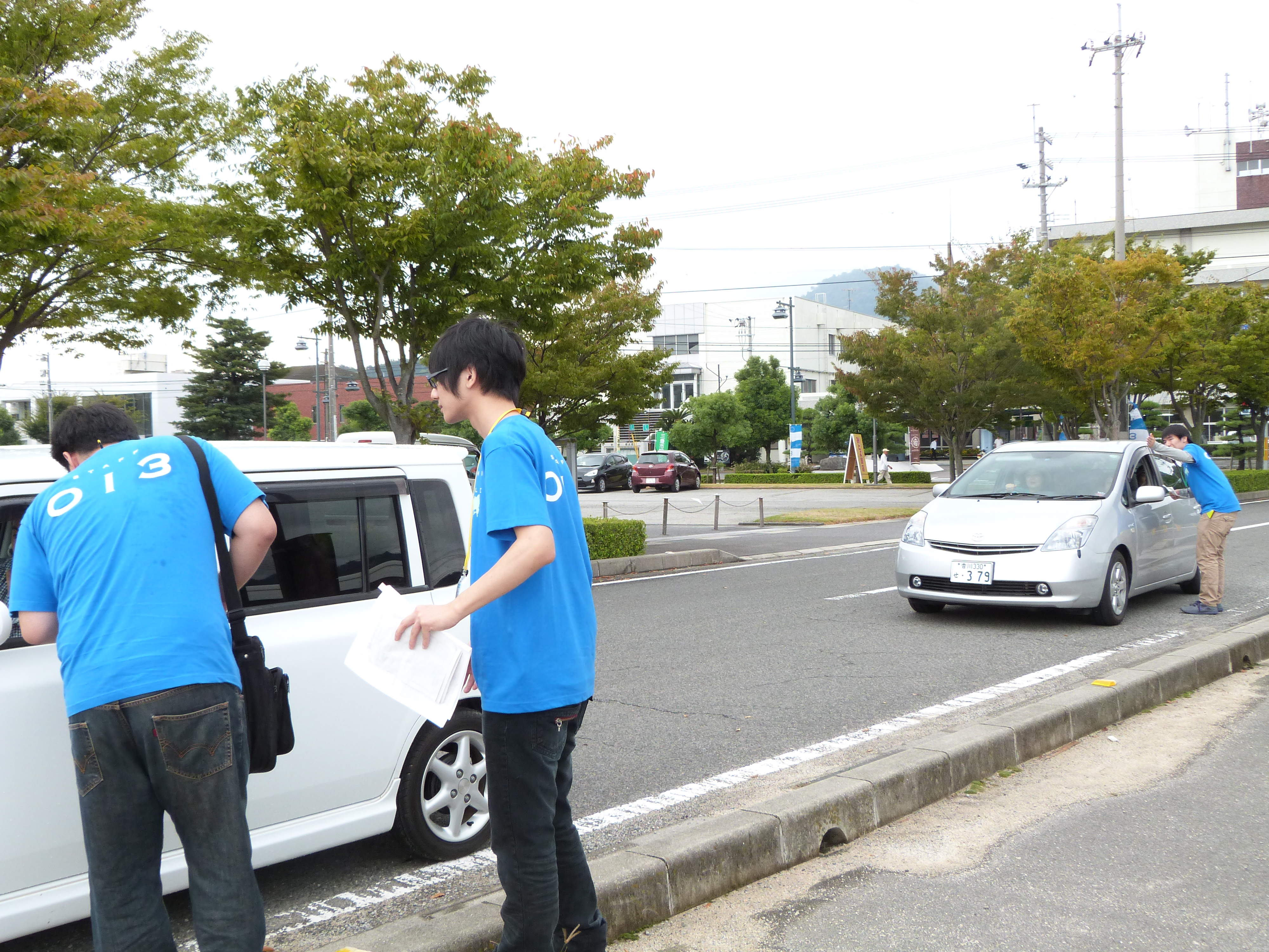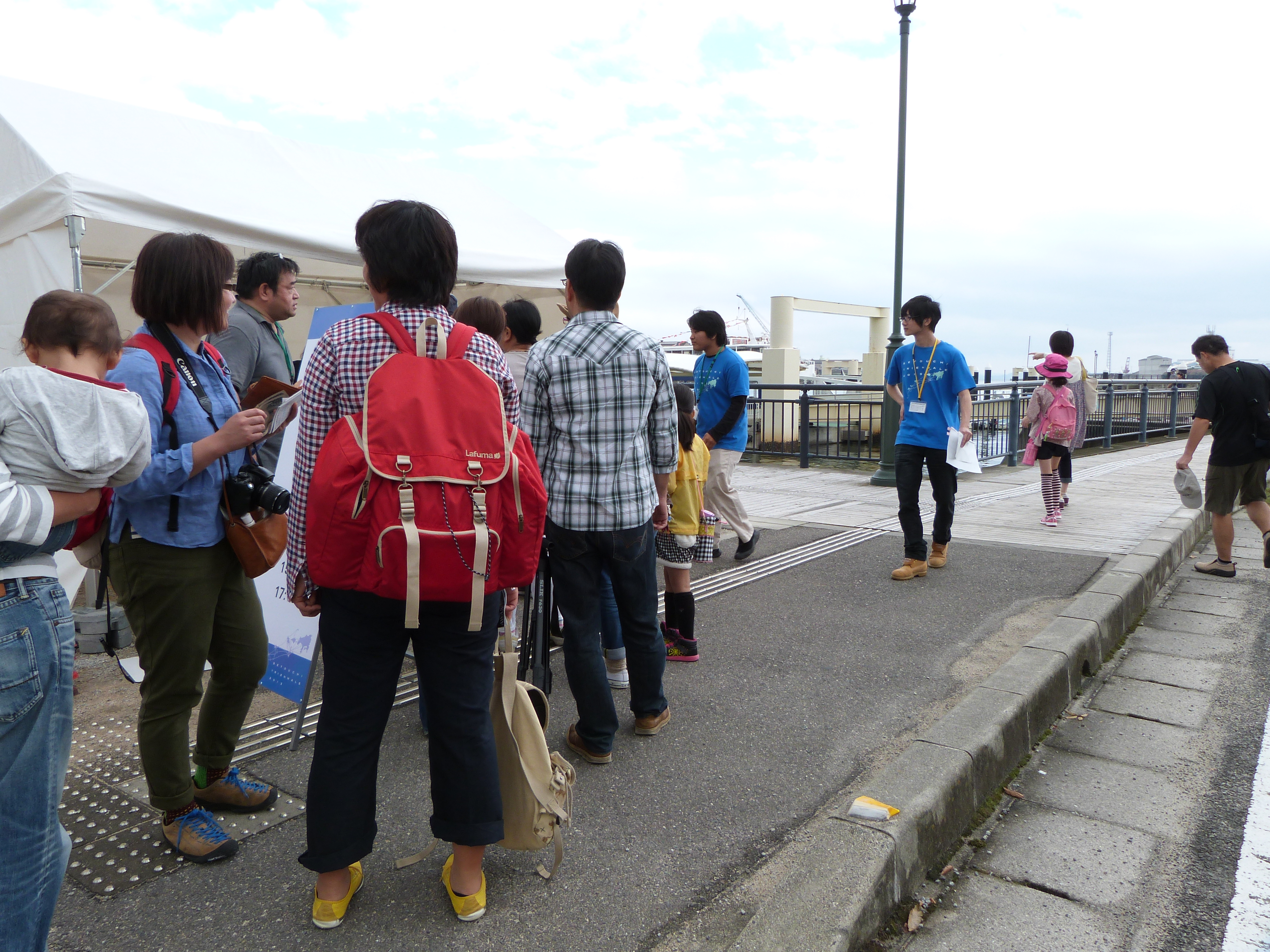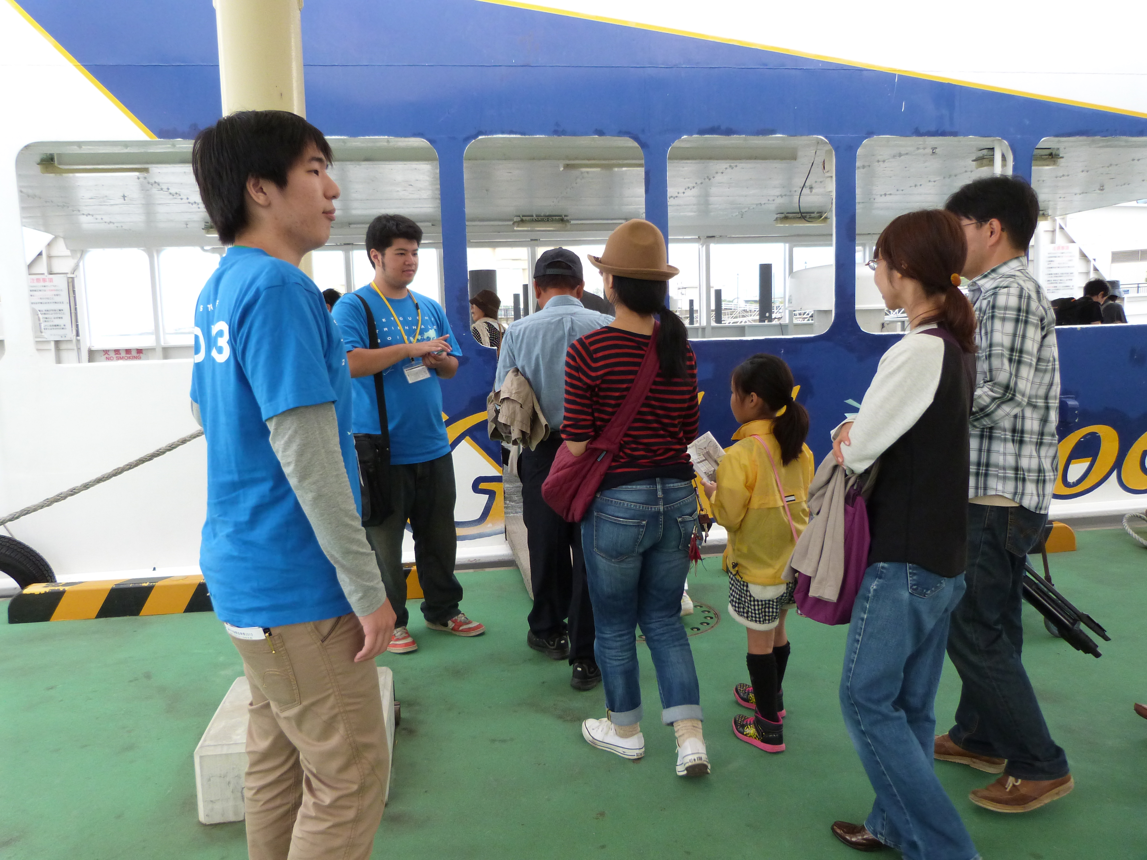 宮ノ下港周辺では、揃いのTシャツ姿のボランティア学生が元気な挨拶でお客様を出迎え、船の時間や駐車場の案内などを行いました。