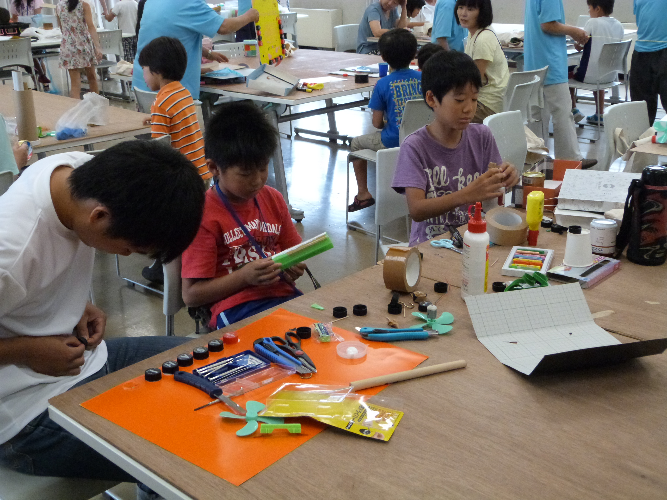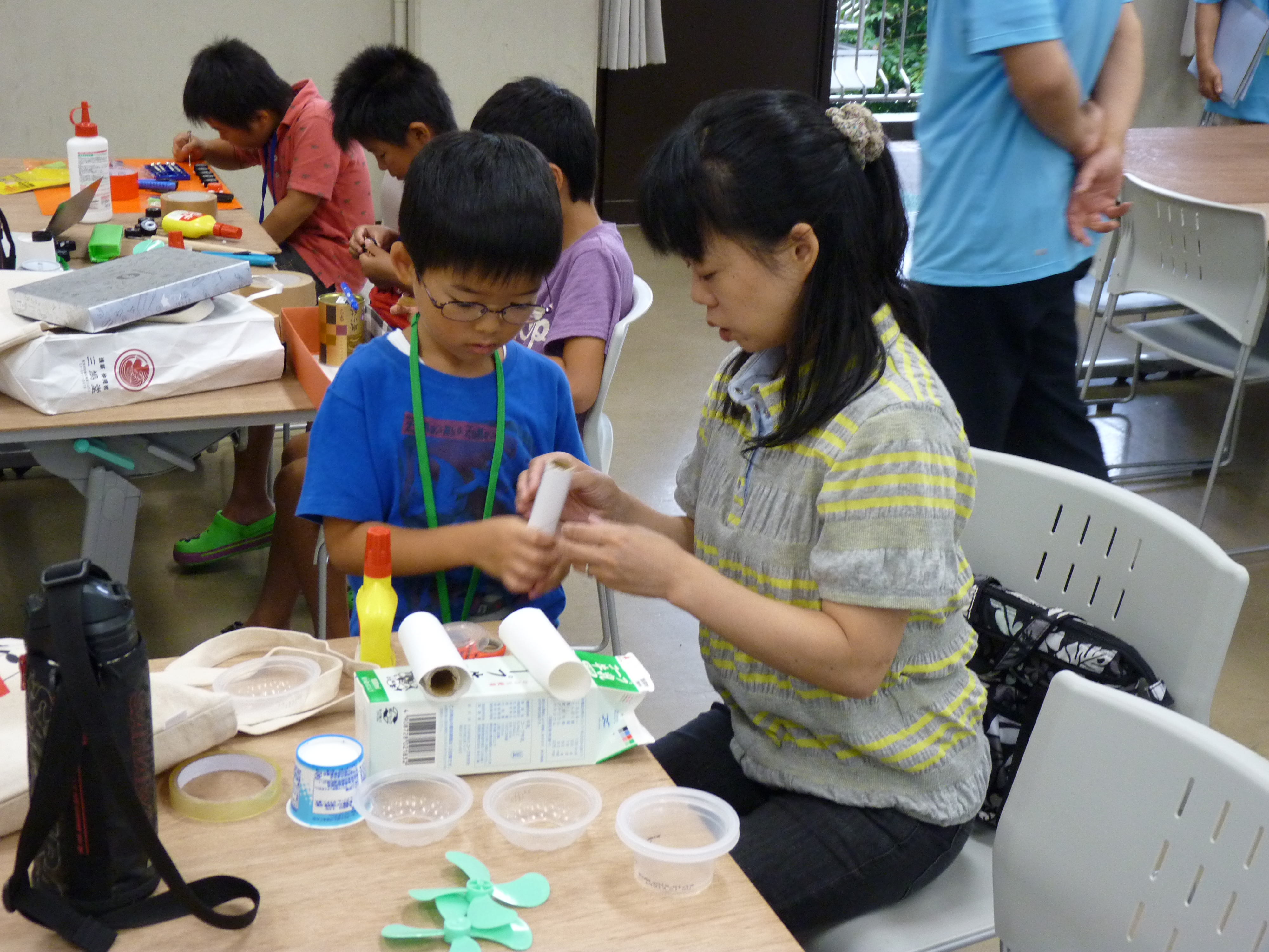 工作は前回に引き続き、プラスチック容器や発明クラブで用意したプロペラ、電池ボックスなどを自由に使ったアイディア工作を行いました。家庭でゴミとなってしまうトレーや容器、紙の筒などがおもしろい形の工作として生まれ変わり、とても楽しい気分になりました。