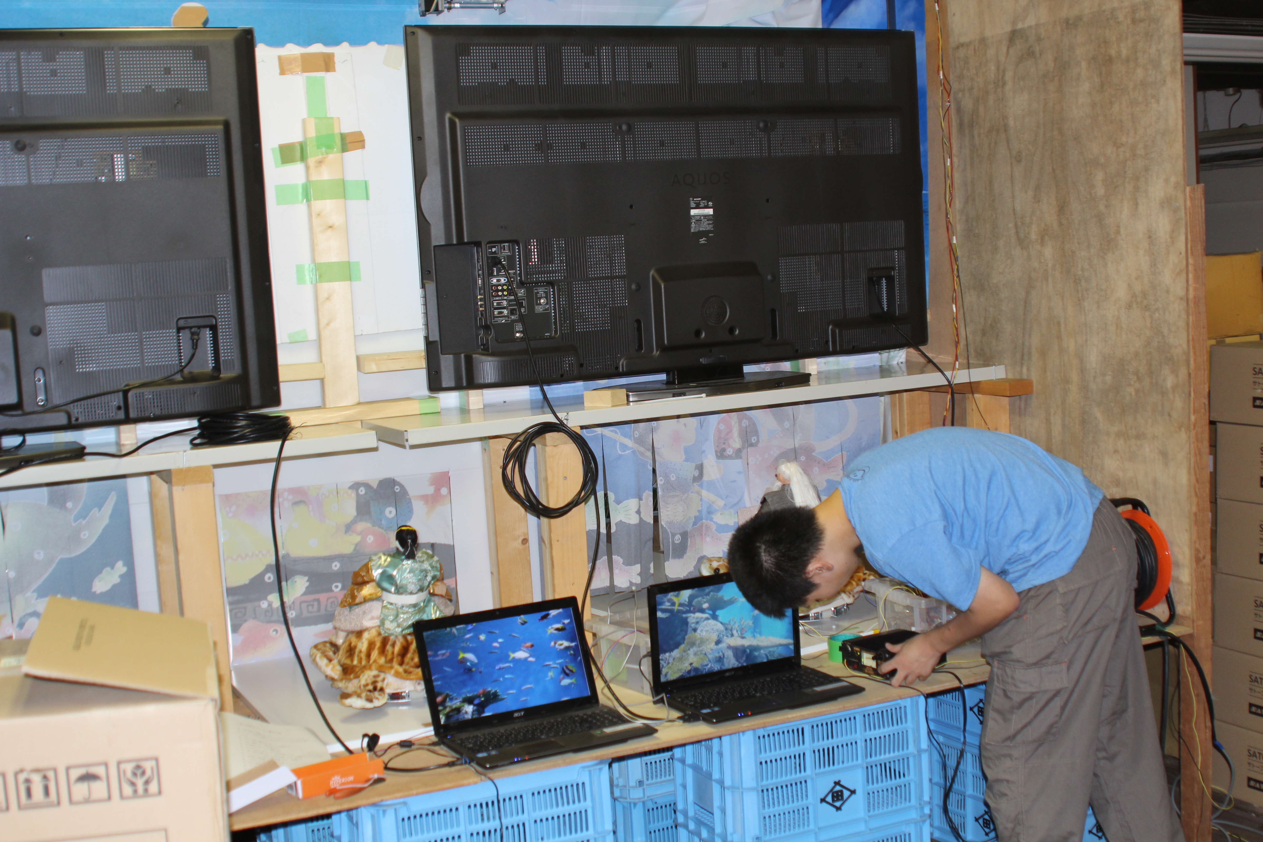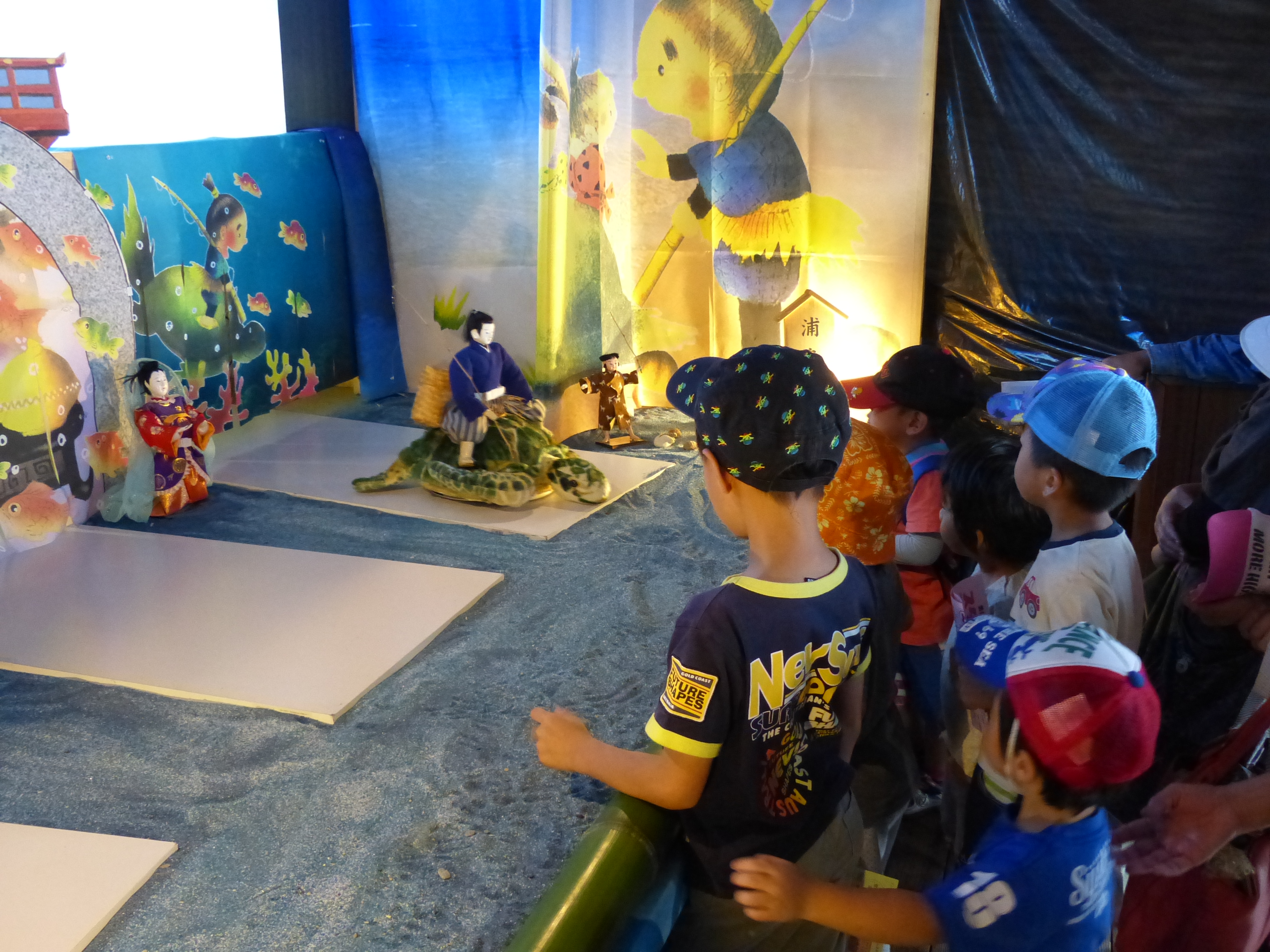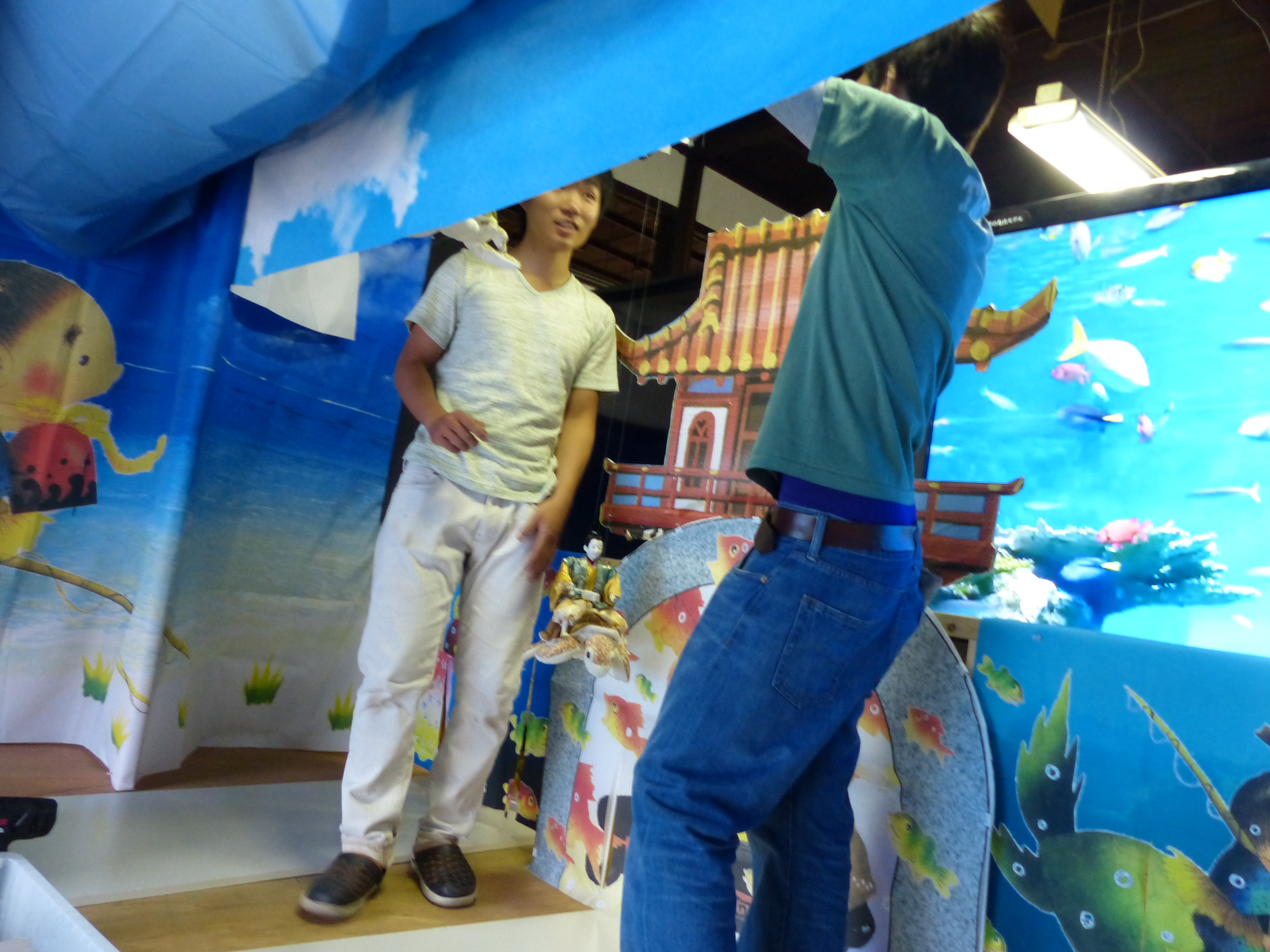舞台では、砂や石を使った浜辺、子どもや乙姫様の人形、そして物語に沿って変化する背景の映像や音声に合わせて浦島太郎の人形が動きます。亀の背に乗って移動する太郎の動きをよりリアルに表現しようと、学生によって毎年改良を続けています。