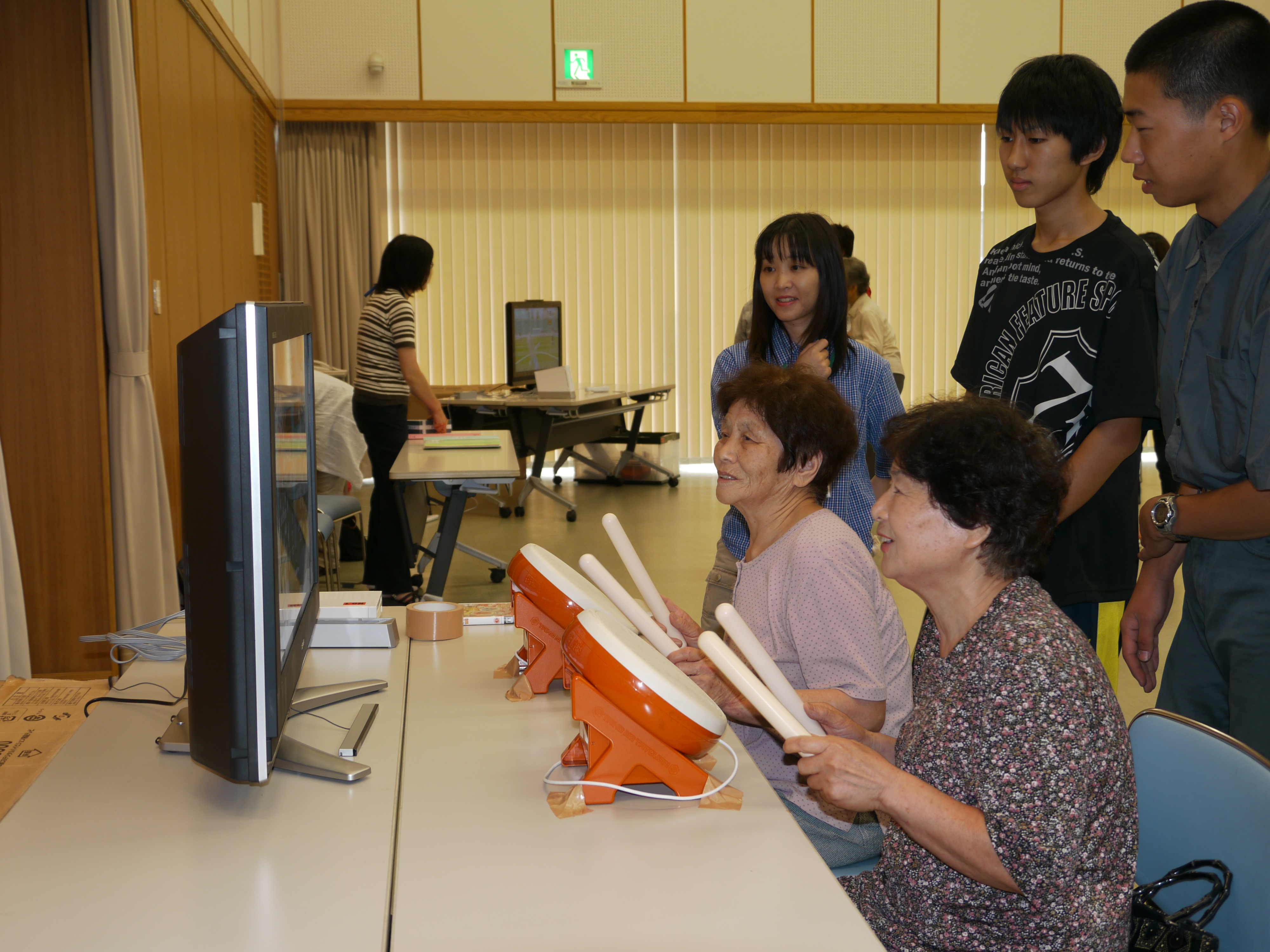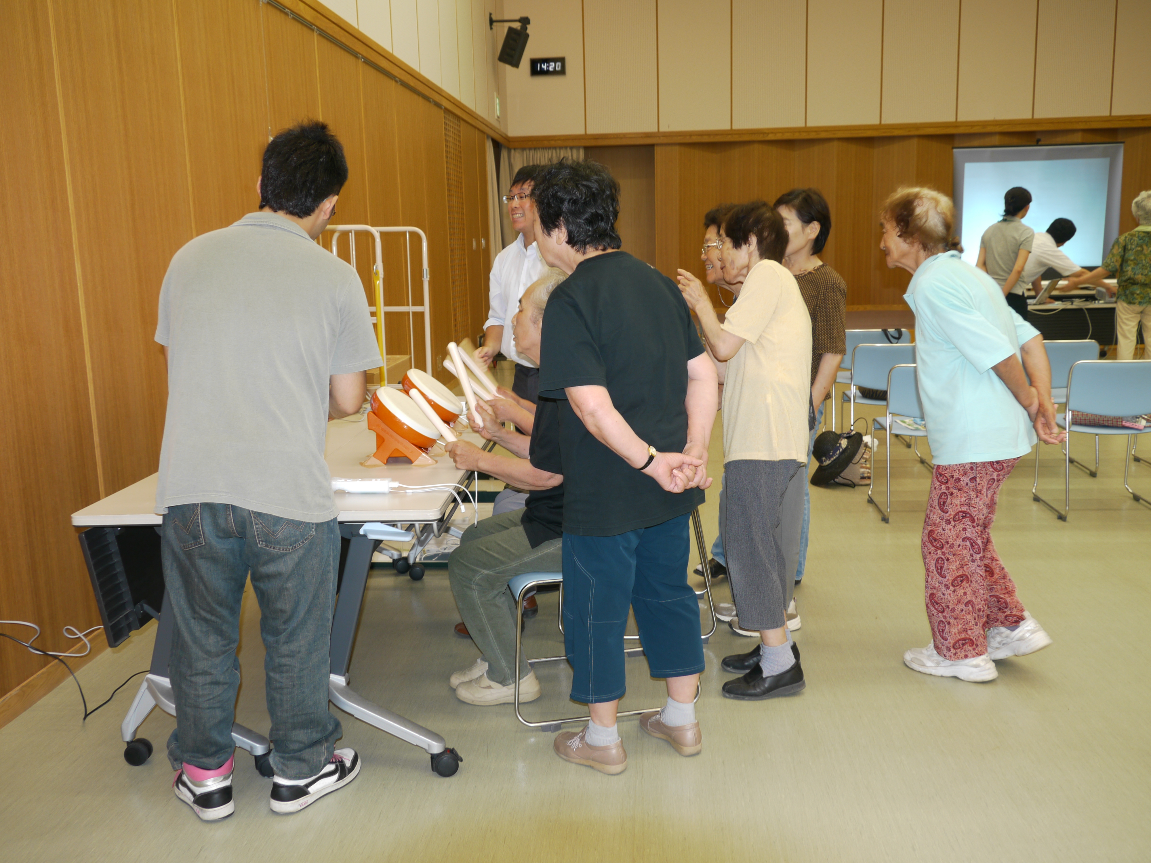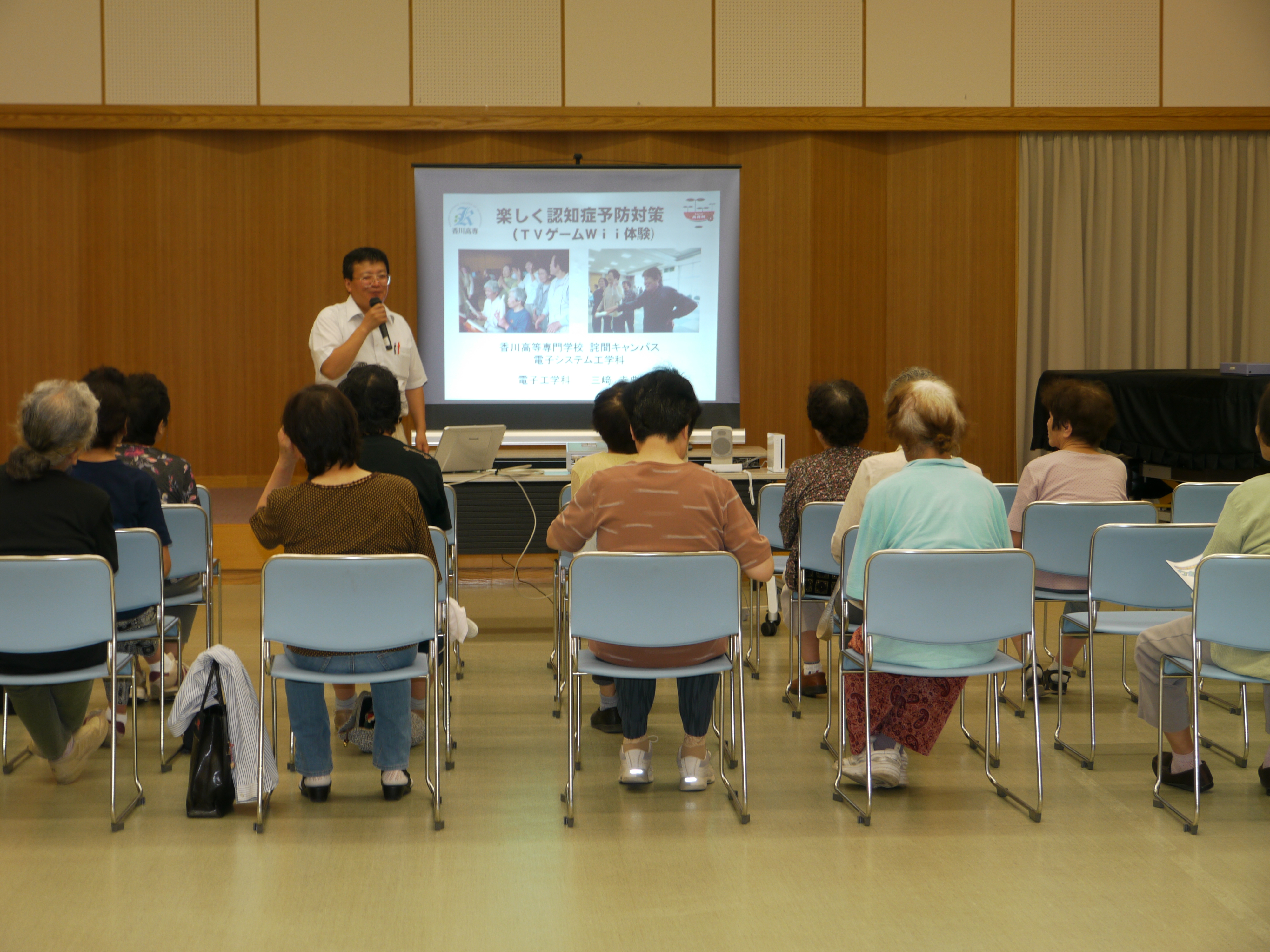 三豊市介護予防対策の一環として脳きらり教室が行われました。参加者は認知症や介護予防に関心のある65歳以上の方で、熱心に講話に耳を傾け、時には大きく相槌を打つなどとても積極的でした。話の後、本校の学生と一緒にWiiを使ったゲームを楽しみました。初めてWiiに触れる方がほとんどでしたが、太鼓、フィットネス、野球やボウリングなどのスポーツゲームを次々と体験し、会場は終始笑い声の絶えない生き生きとした雰囲気に包まれていました。