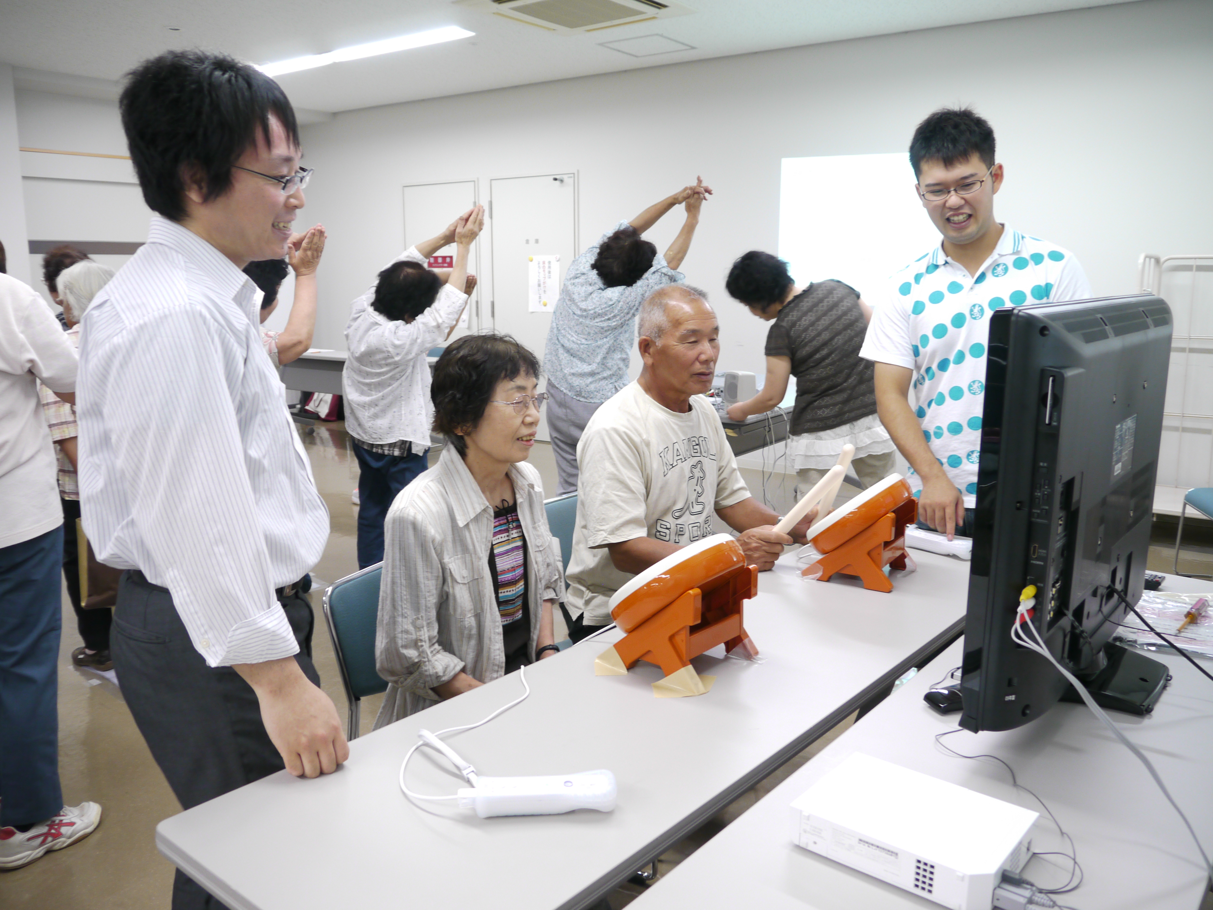 三豊市介護予防対策の一環として脳きらり教室が行われました。参加者は認知症や介護予防に関心のある65歳以上の方で、熱心に講話に耳を傾け、時には大きく相槌を打つなどとても積極的でした。話の後、本校の学生と一緒にWiiを使ったゲームを楽しみました。初めてWiiに触れる方がほとんどでしたが、太鼓、フィットネス、野球やボウリングなどのスポーツゲームを次々と体験し、会場は終始笑い声の絶えない生き生きとした雰囲気に包まれていました。