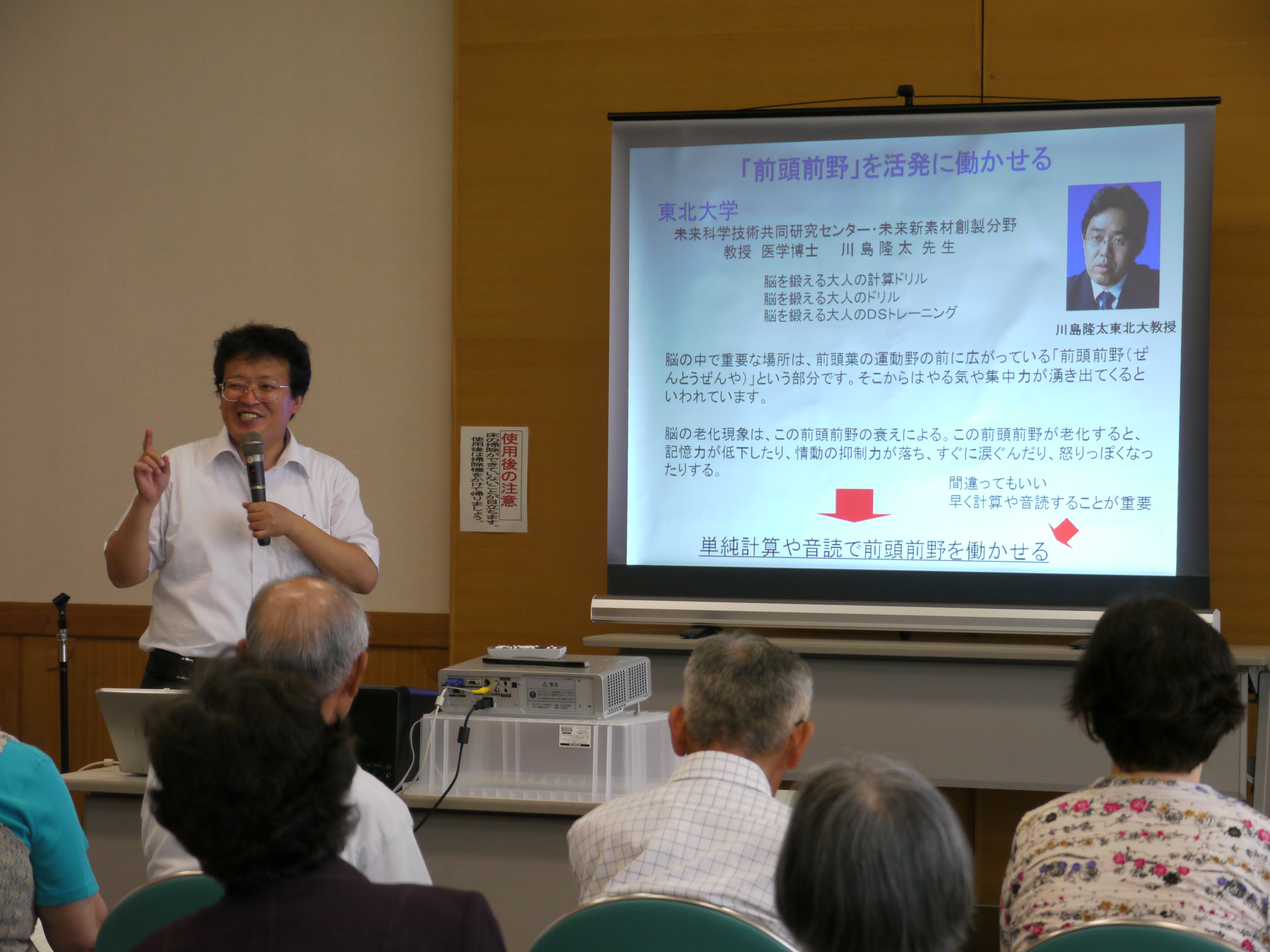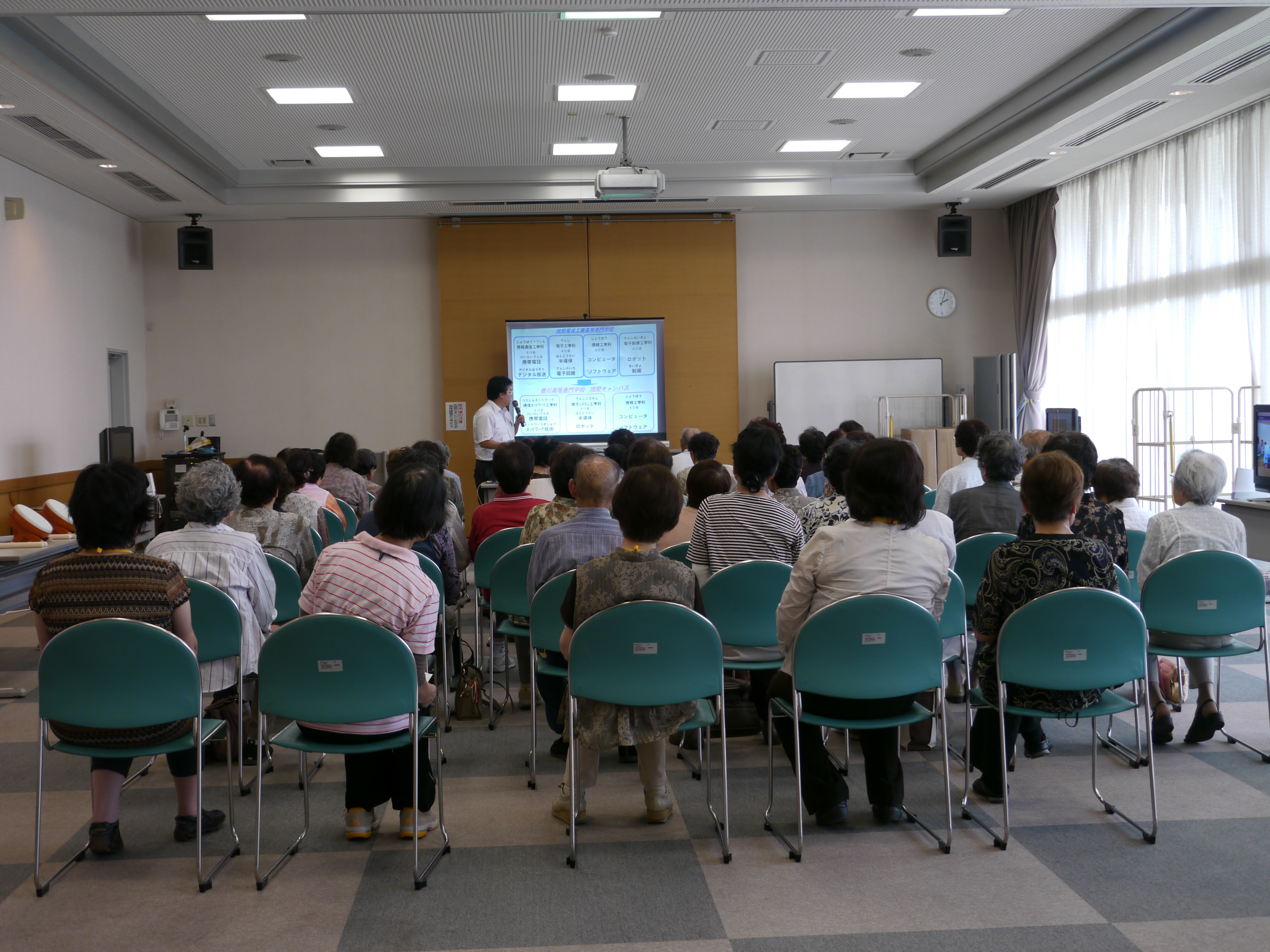 三豊市介護予防対策の一環として脳きらり教室が行われました。参加者は認知症や介護予防に関心のある65歳以上の方で、熱心に講話に耳を傾け、時には大きく相槌を打つなどとても積極的でした。話の後、本校の学生と一緒にWiiを使ったゲームを楽しみました。初めてWiiに触れる方がほとんどでしたが、太鼓、フィットネス、野球やボウリングなどのスポーツゲームを次々と体験し、会場は終始笑い声の絶えない生き生きとした雰囲気に包まれていました。