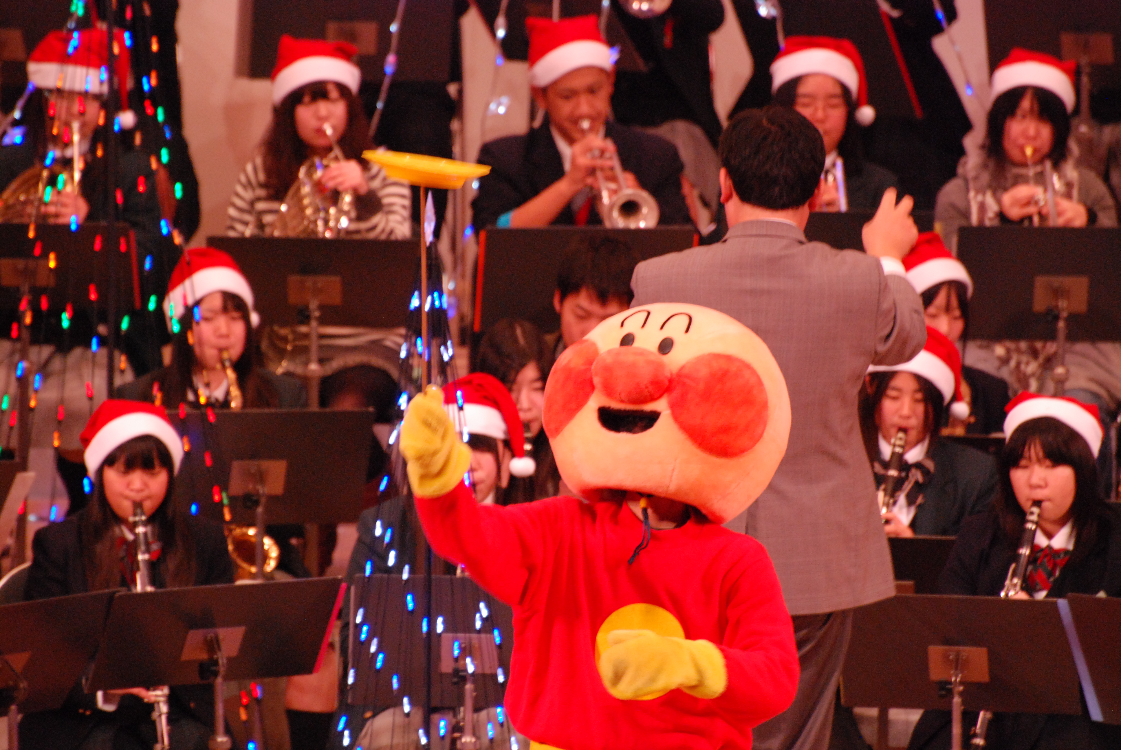 クリスマス気分を盛り上げる演出やイルミネーションが施された会場で、各団体の工夫をこらした演出とクリスマスソングが演奏されました。本校は合同演奏に参加し、演奏に合わせてアンパンマンなどの人気キャラクターが劇や出し物をして観客を湧かせました。