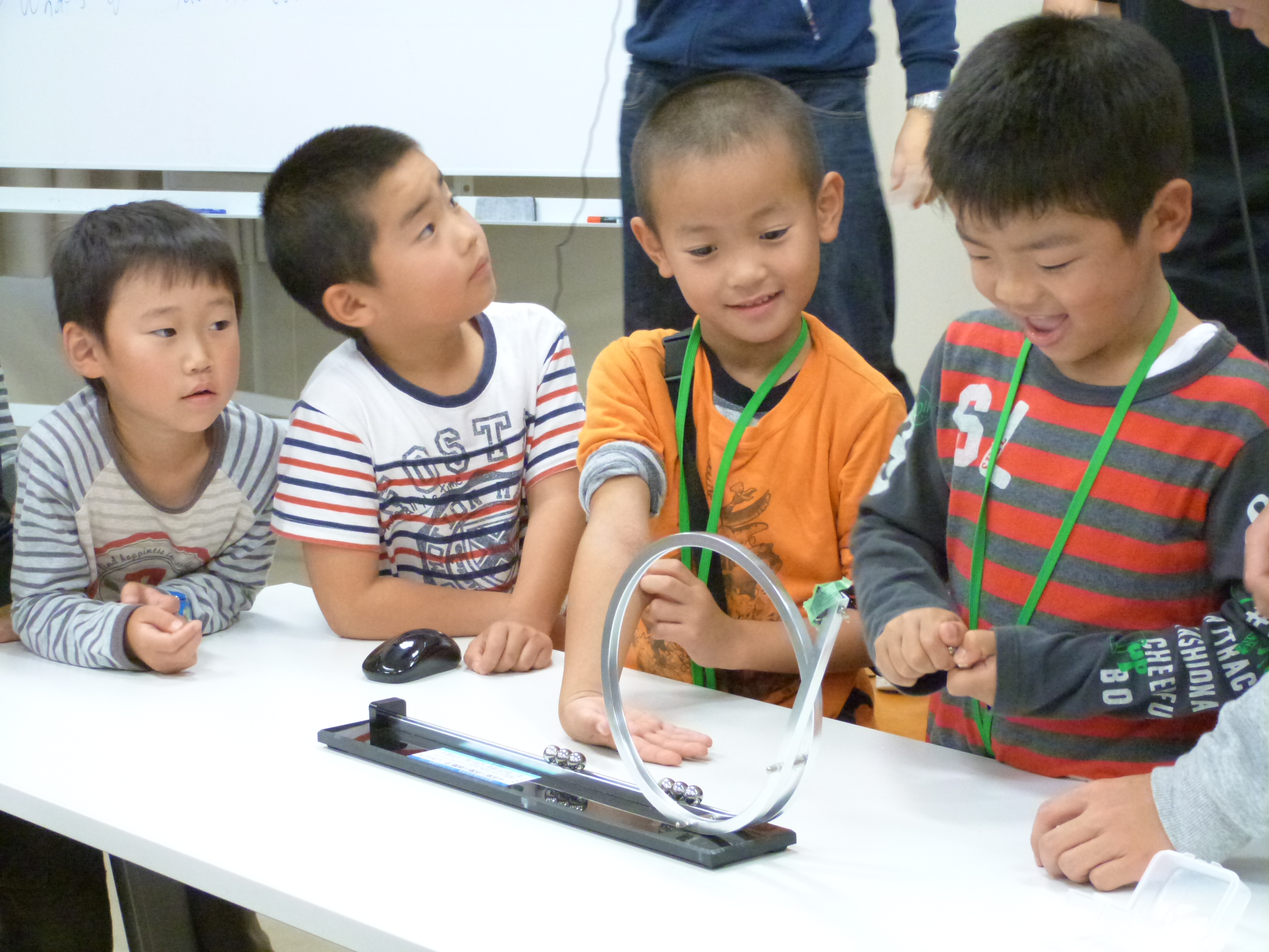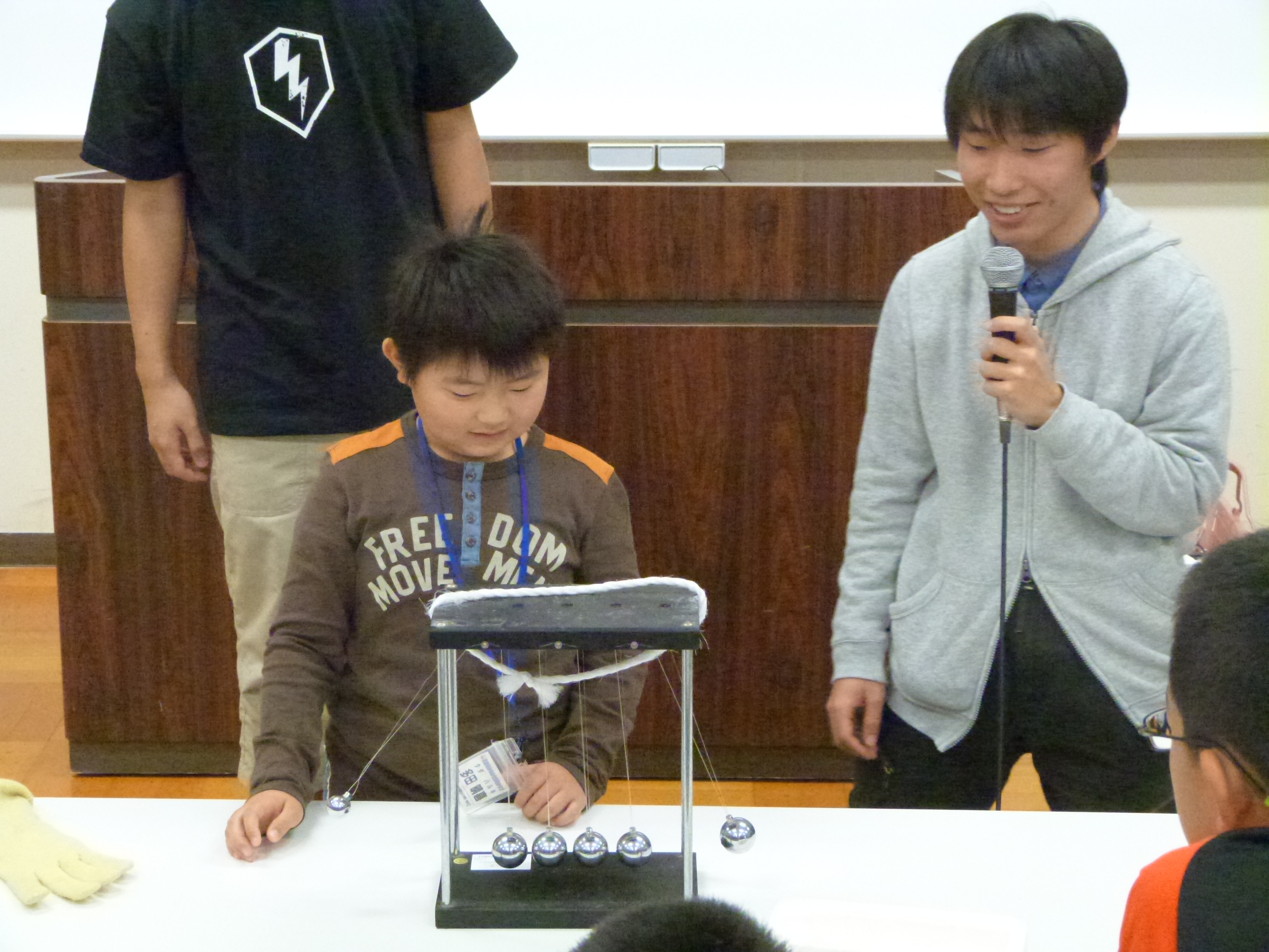 大気圧の実験により固い一斗缶が一瞬にして大きくへこむと、子ども達は大きな歓声を上げて驚いていました。また、ニュートンの振り子やガウス加速器などの装置は、何度も繰り返し遊びながらその原理を体験することができました。