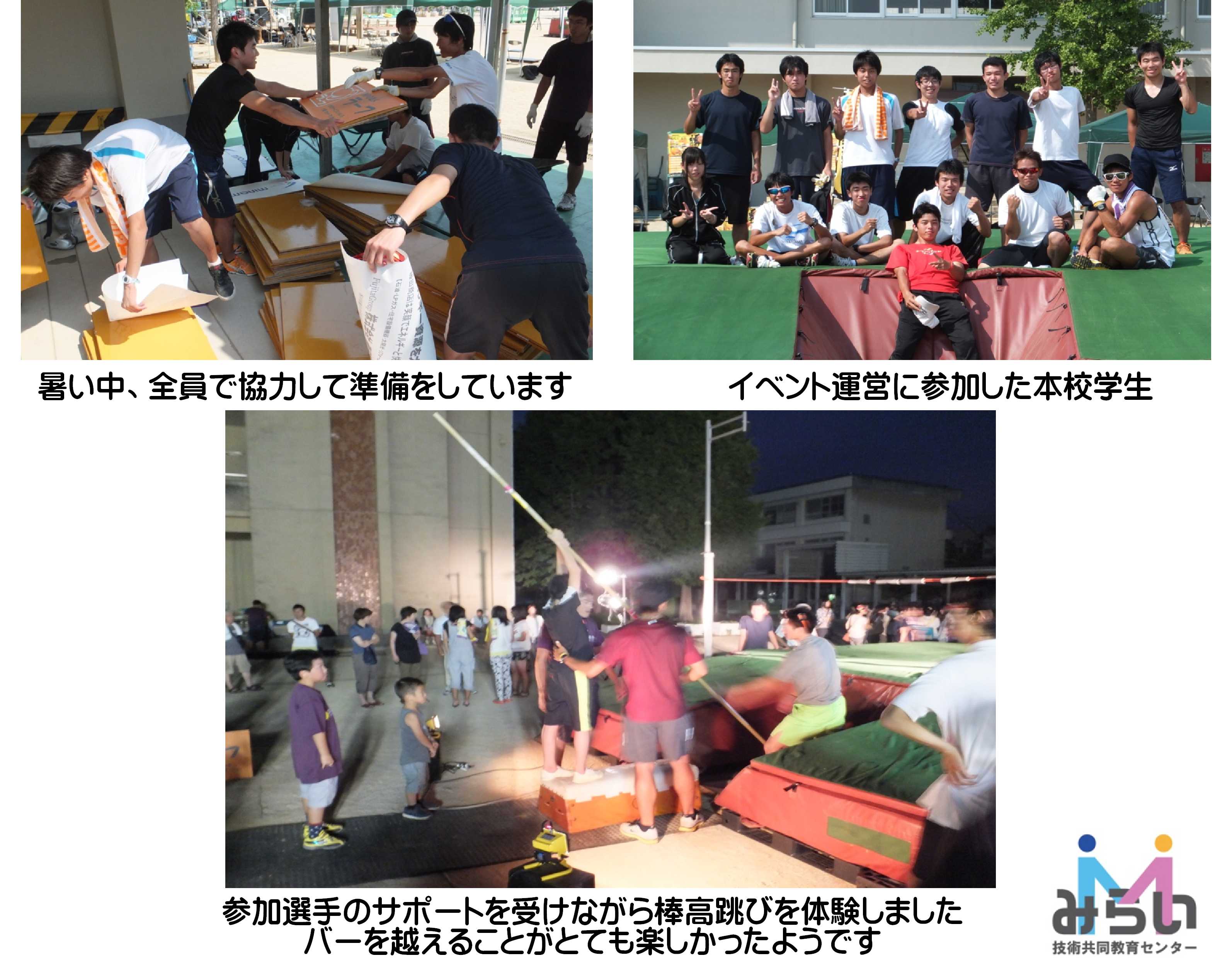 8月10日(土)の18:30~20:00観音寺南小学校運動場において「高校生棒高跳び選手による棒高跳びショーおよび体験棒高跳び教室」が開催され、詫間キャンパスの陸上部員が選手、運営スタッフとして参加しました。棒高跳びショーには「ふれあい夜市KANONJI2013」に来場した幼児から高齢者が約300名、体験棒高跳び教室には約30名が参加しました。