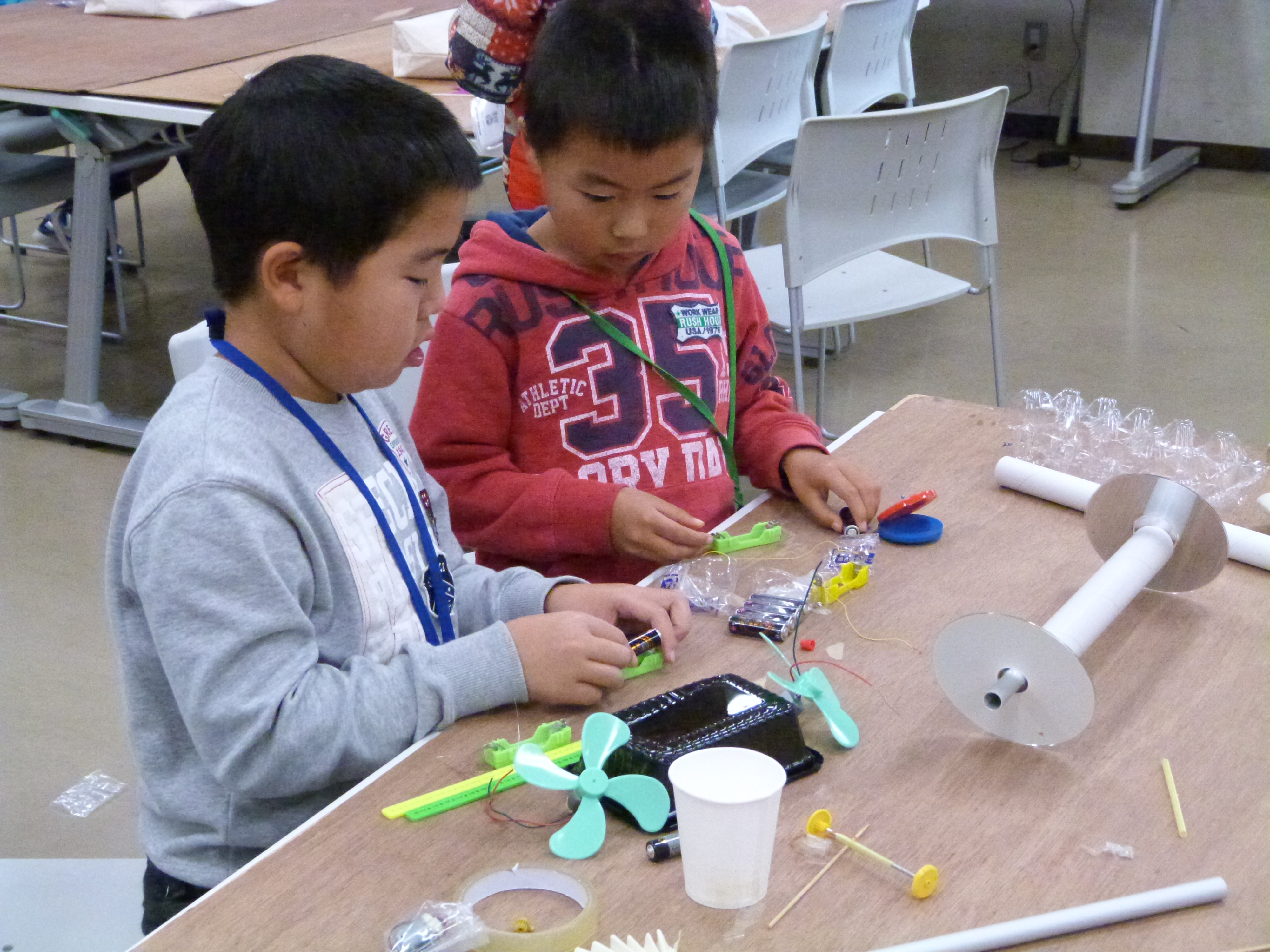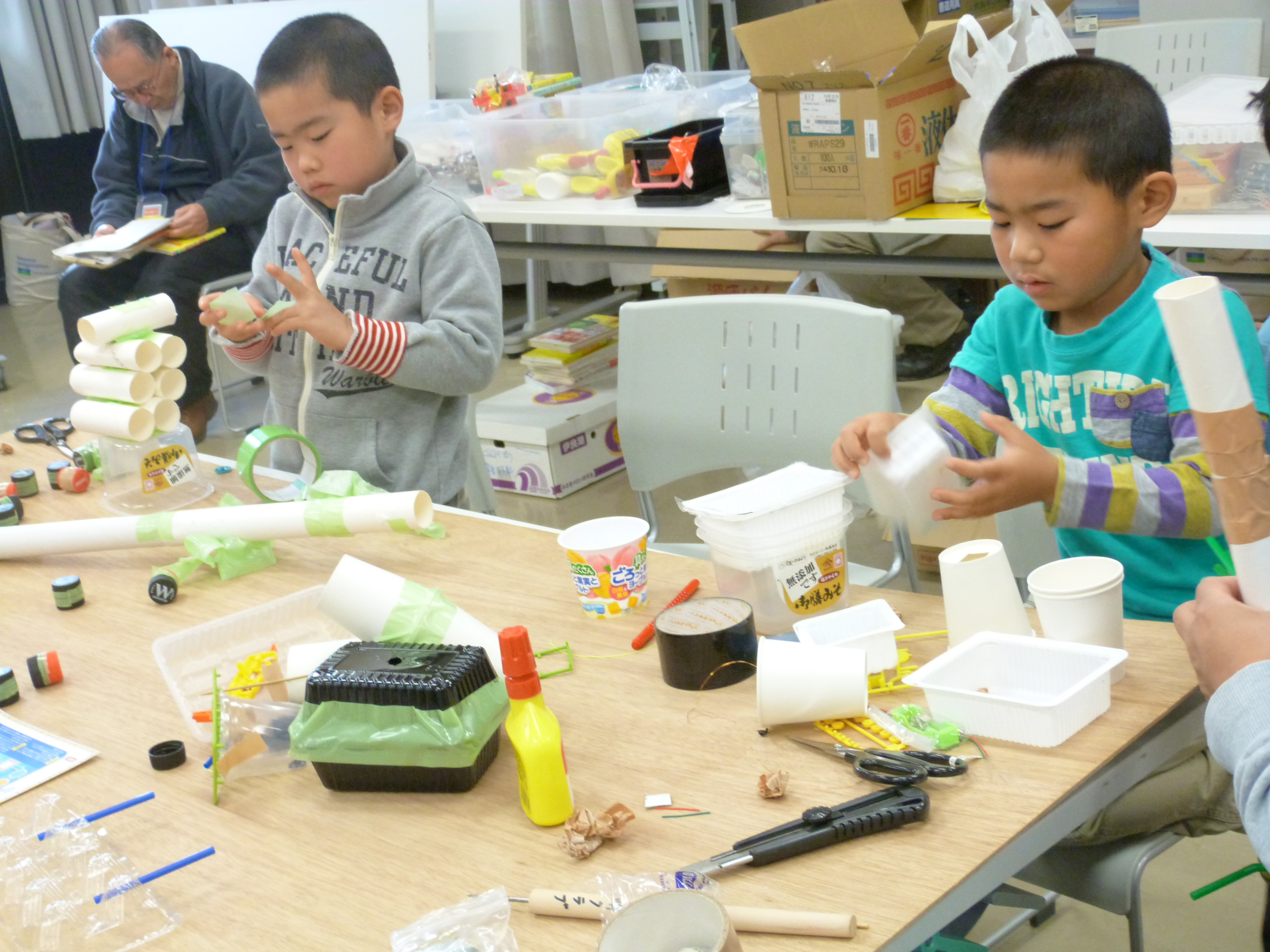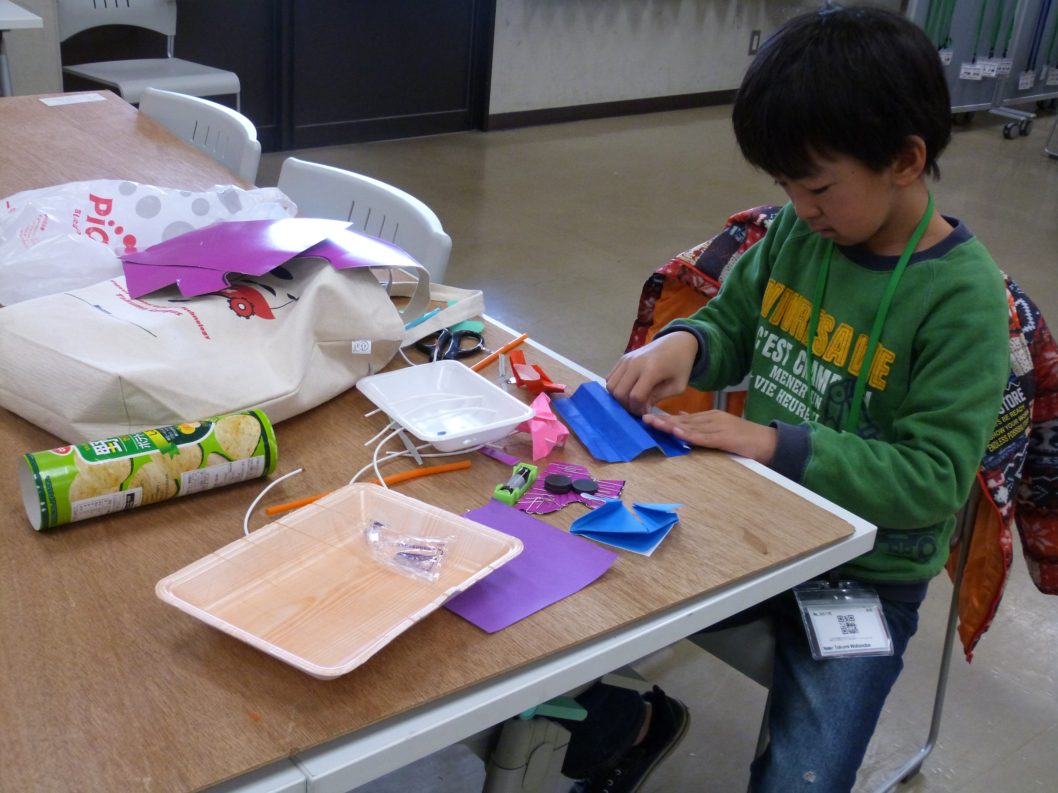 今年最後の活動となった今回は、前回に引き続きアイディア工作を行いました。参加した子ども達は、持参したたくさんの材料を上手に切り貼りしたり、電池や豆電球、プロペラなどを使って、動いたり光ったりする工作を作りました。