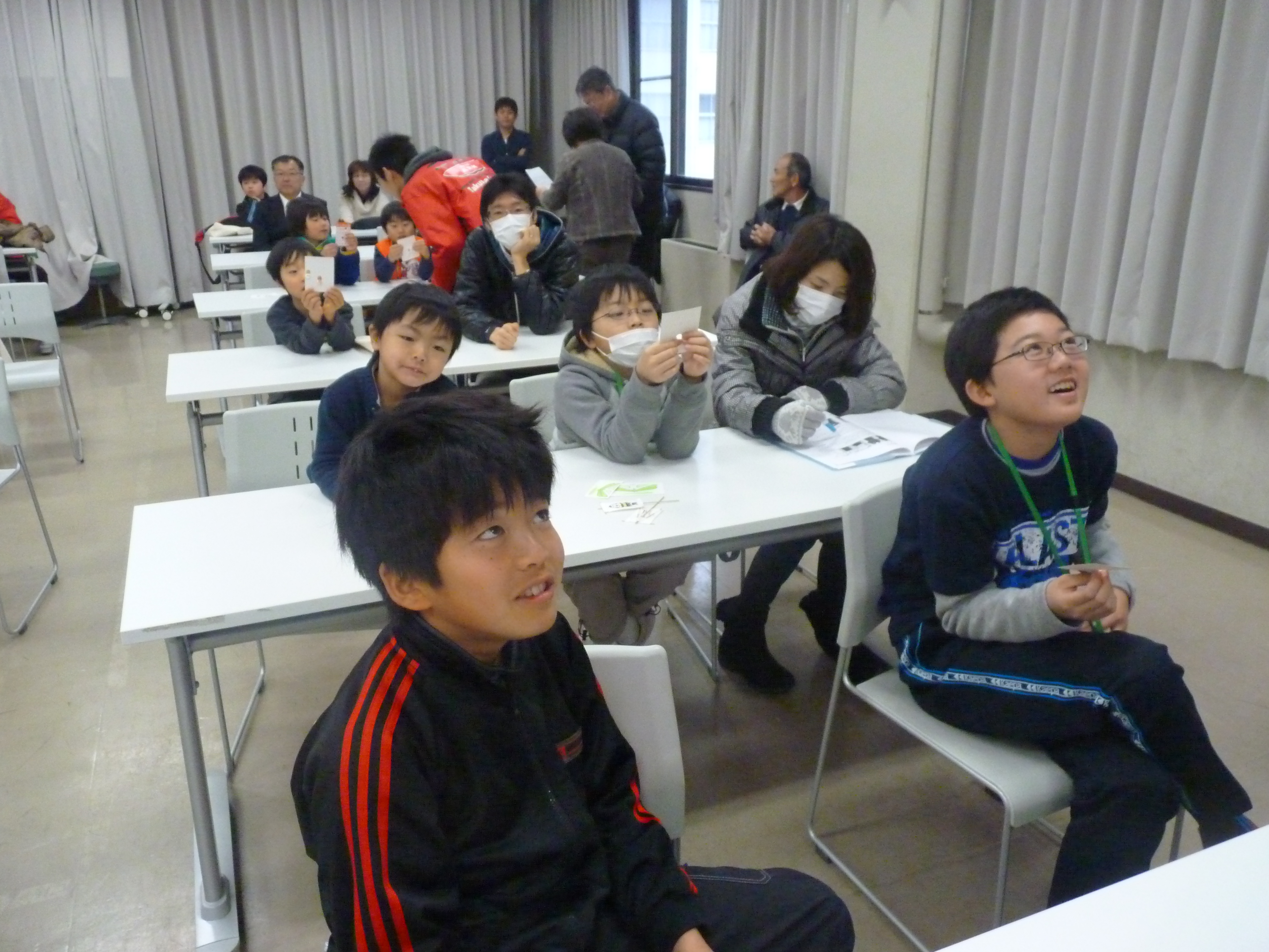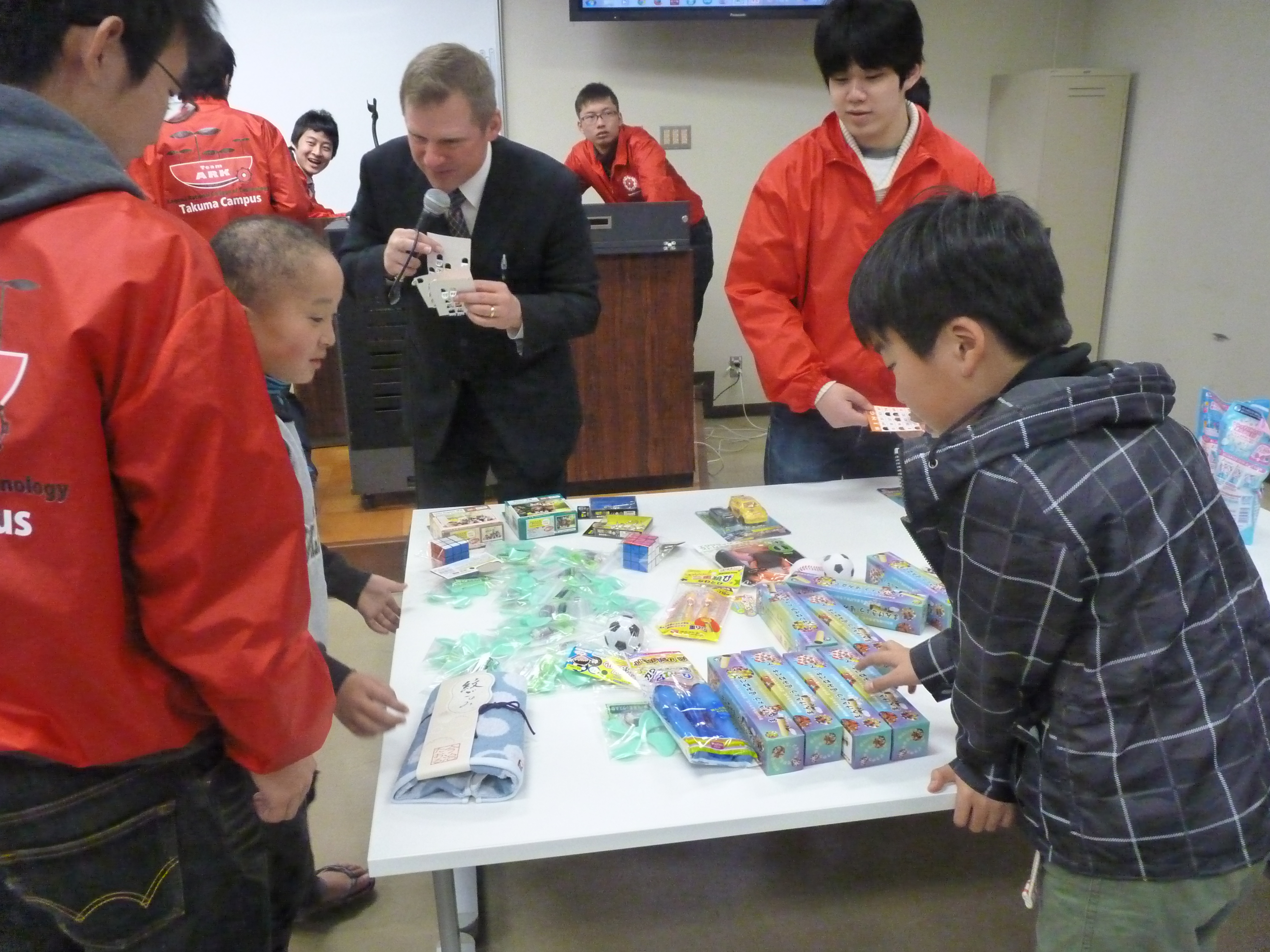 今年度最後の活動として、レクリエーションを楽しみました。ビンゴゲームでは、詫間キャンパスロボコンチーム「TEAM ARK」の学生とジョンストン先生が進行を行い、子ども達と英語でコミュニケーションを取りながらゲームを楽しみました。
