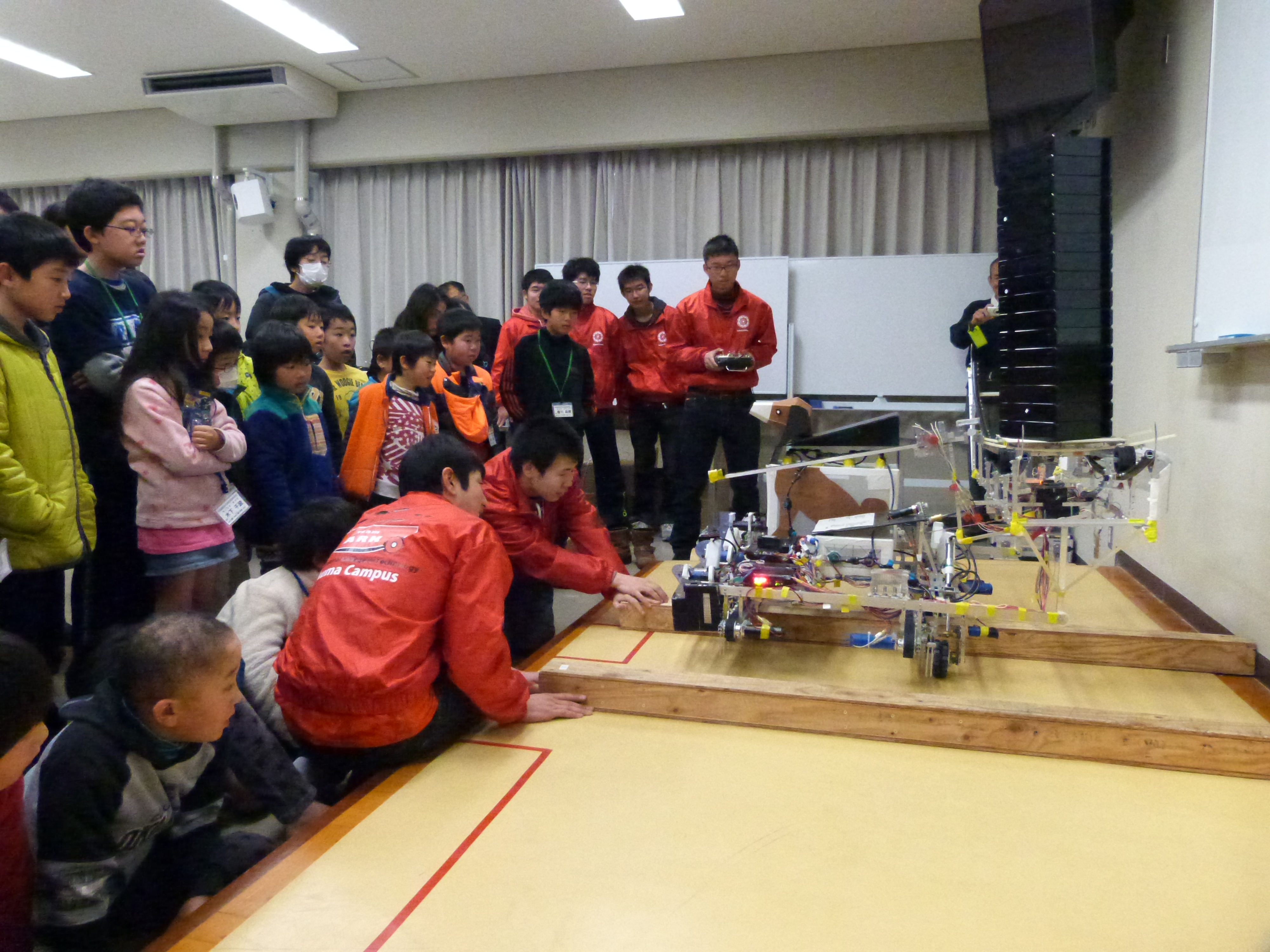 詫間キャンパスロボコンチーム「TEAM ARK」は、今年度の高専ロボコンに出場したロボットのデモンストレーションを行いました。20段積み上げた蒸籠を落とさずに坂道や角材の障害物を越えて移動していくロボットの仕組みや工夫を子ども達に見つけてもらい、説明しました。