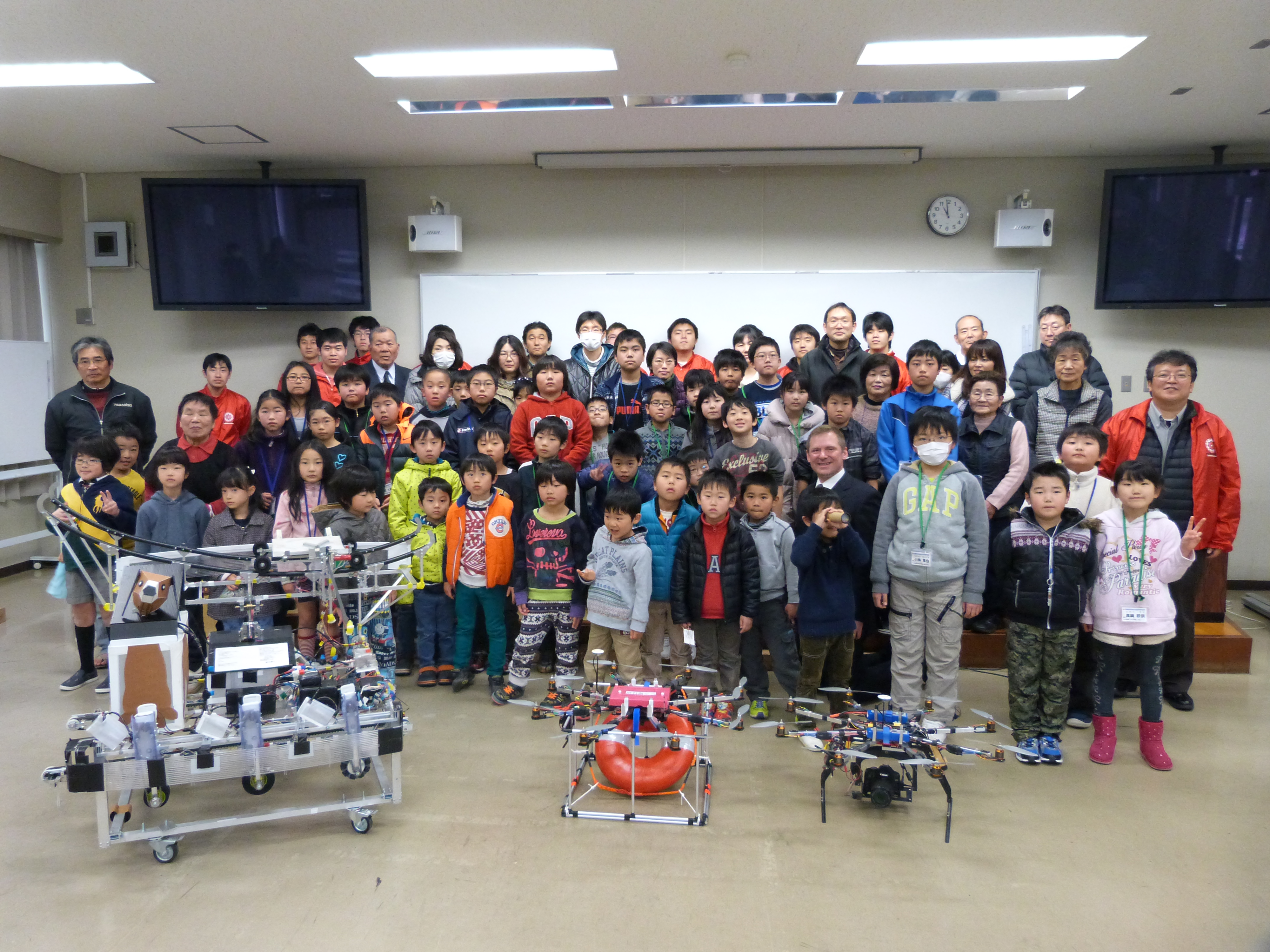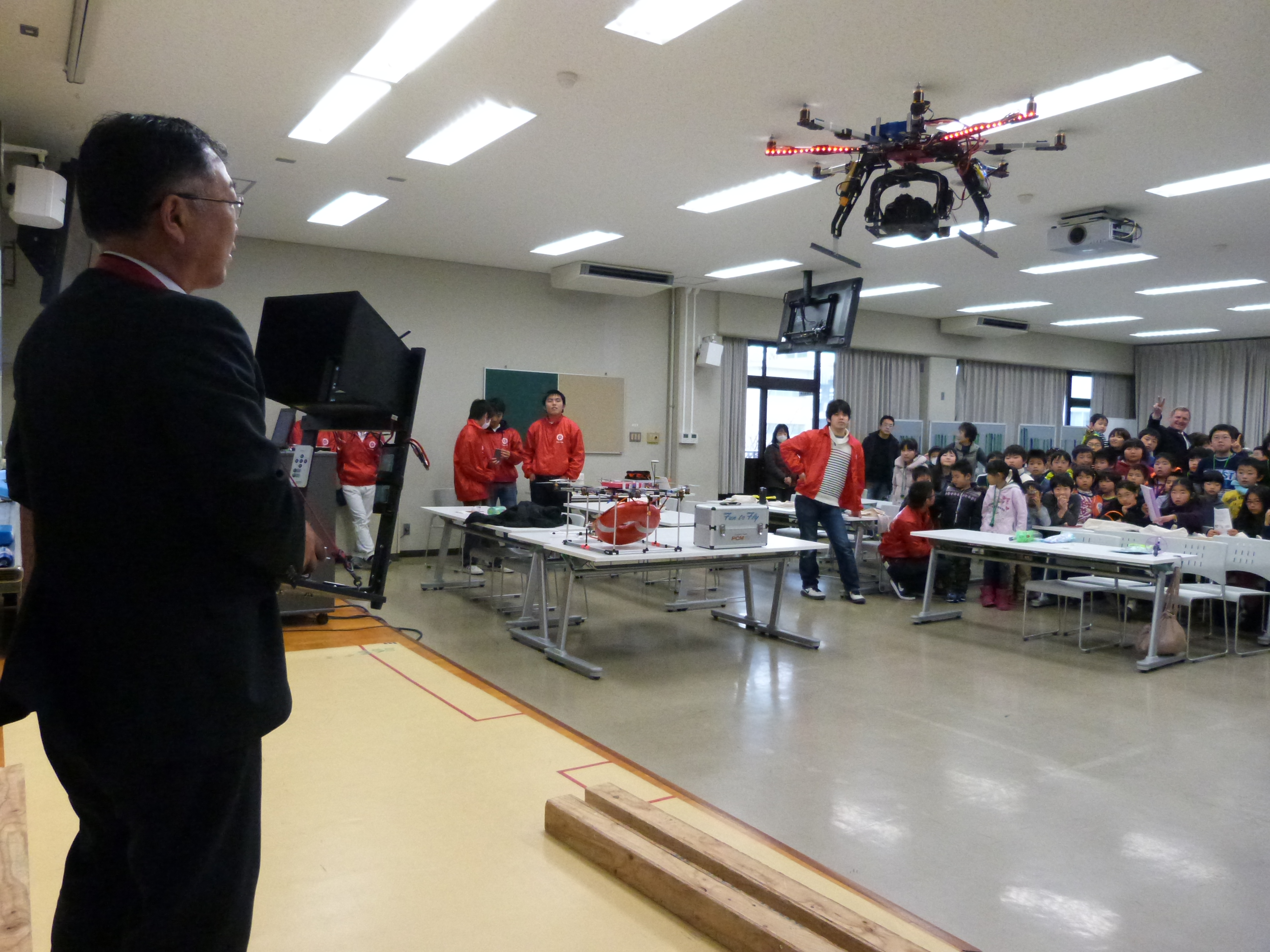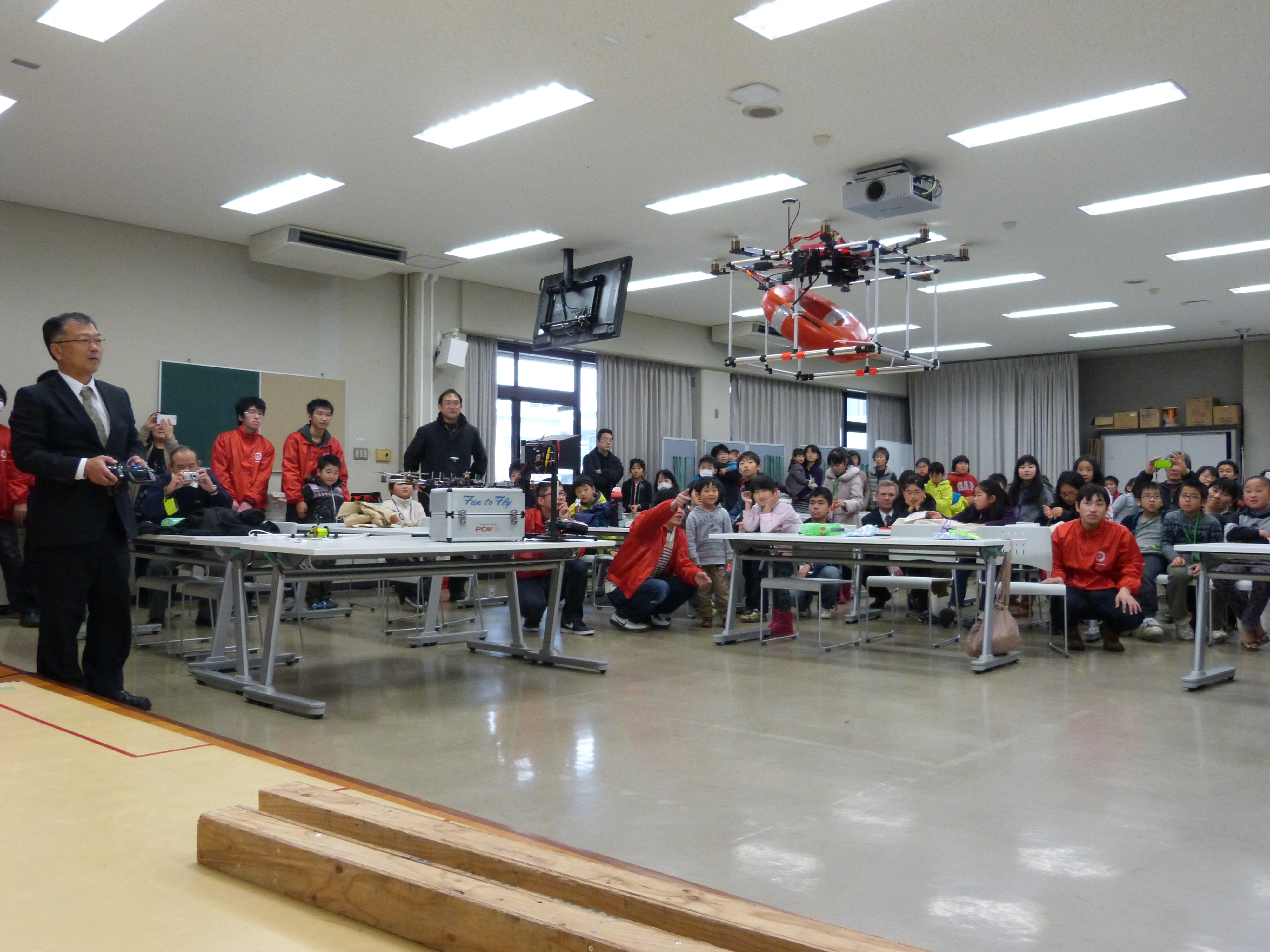 また、優れた空撮技術を持っている㈱空撮技研の合田社長にお越しいただき、防災用マルチコプターのデモンストレーションをしていただきました。あいにくの天気で室内での実演になりましたが、室内でも安定して動作するマルチコプターの技術の高さに驚きました。記念にマルチコプターで写真を撮影していただきました。