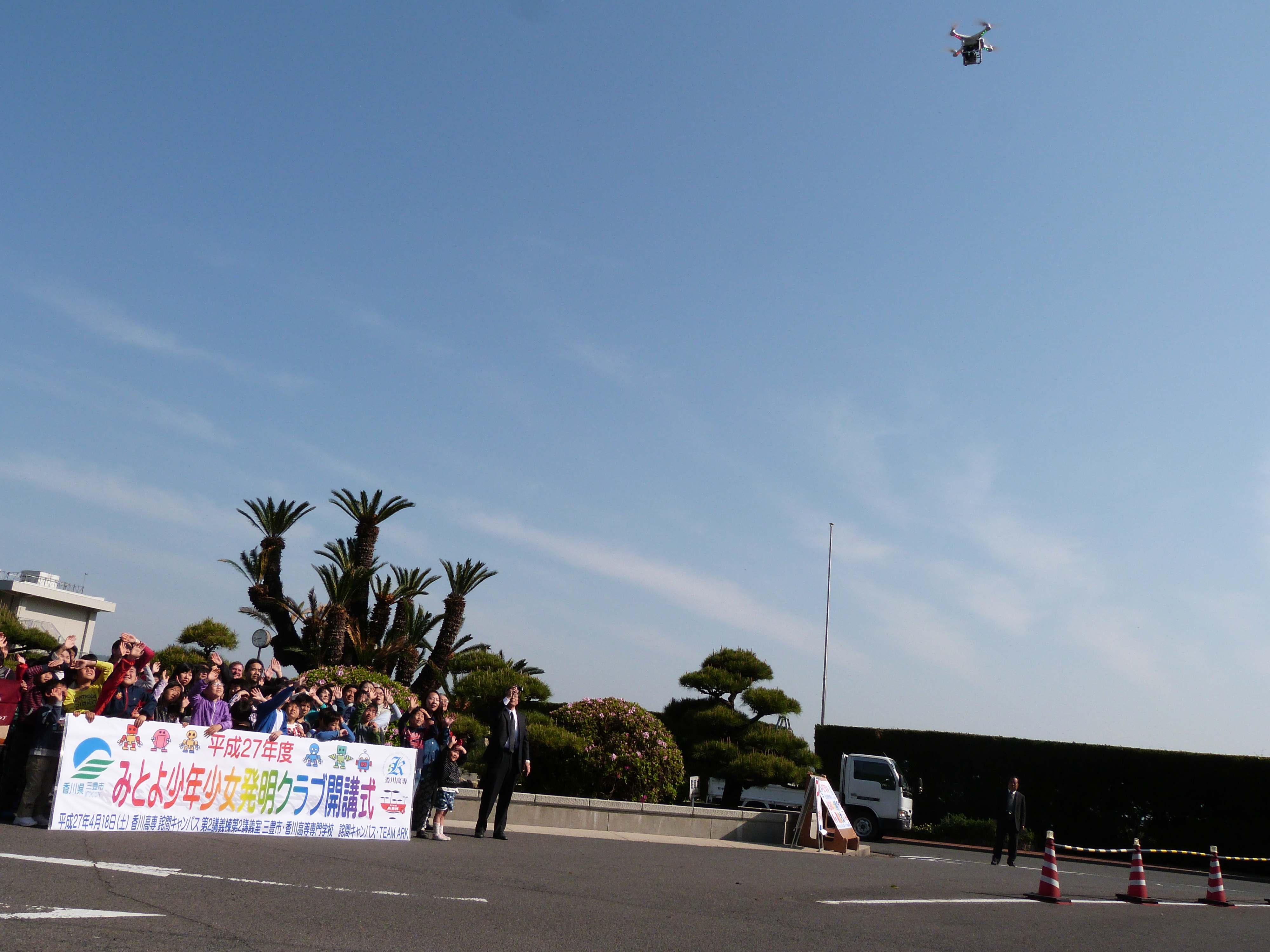 当日は、青空の下、ワクワク感で胸いっぱいの子ども達と保護者がたくさん集まってくれました。発明クラブの山路会長のあいさつで始まり、来賓の方々の激励の言葉や指導員の紹介などがありました。