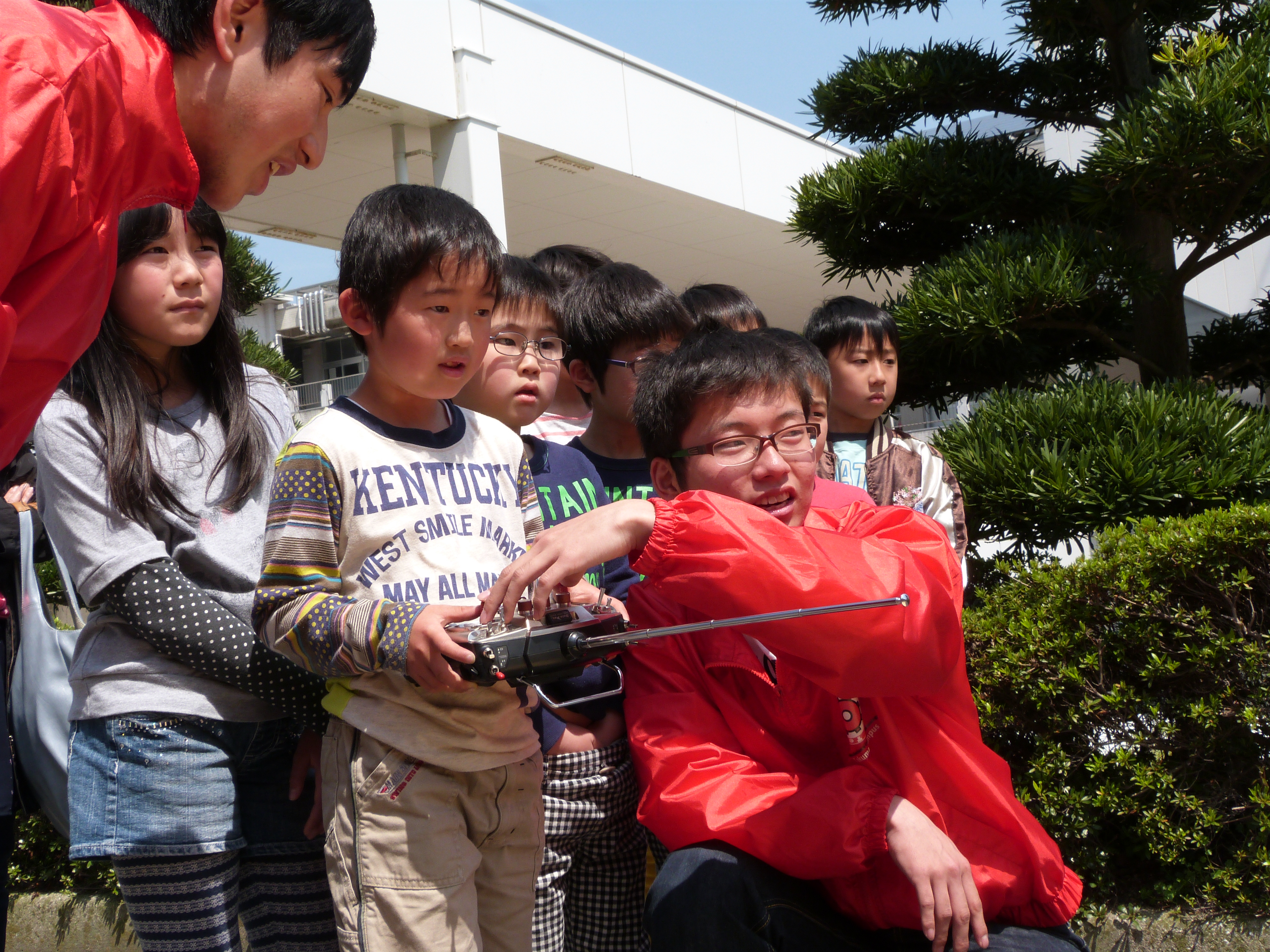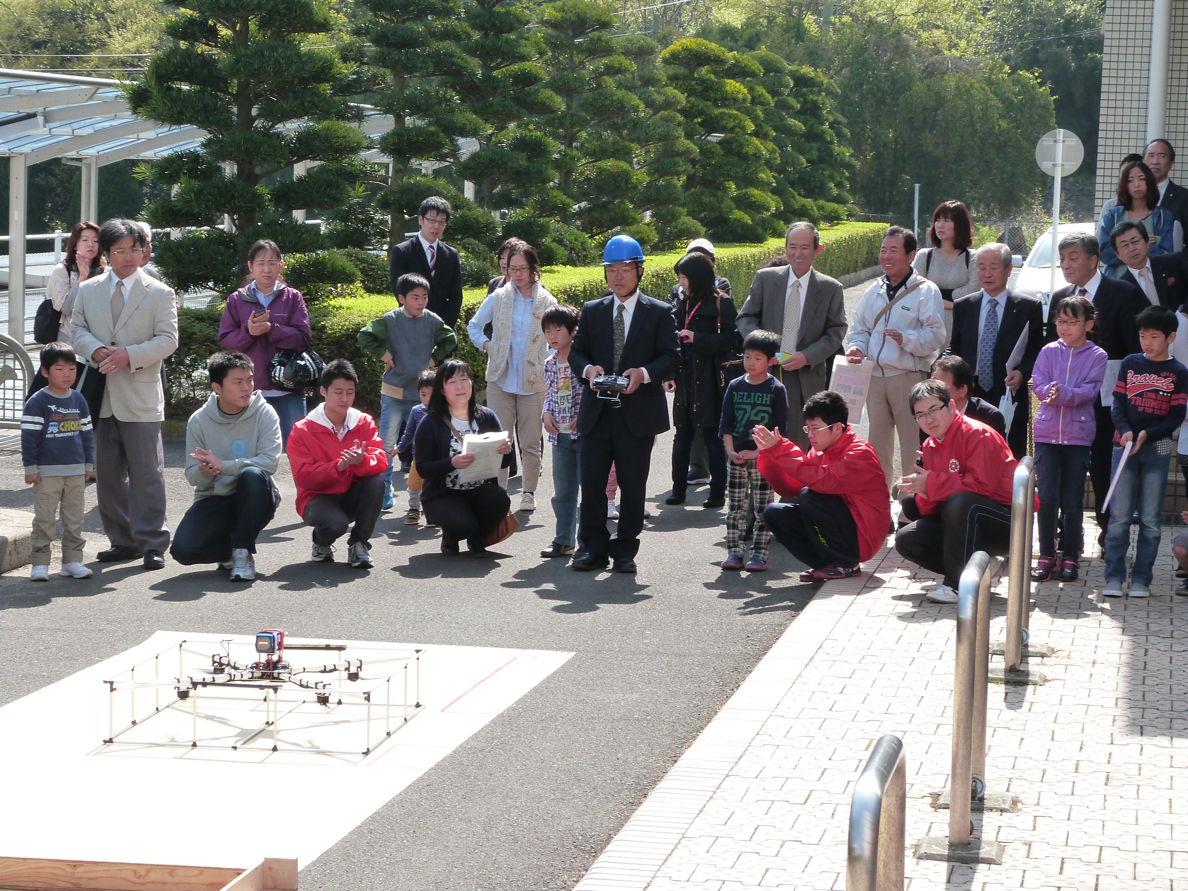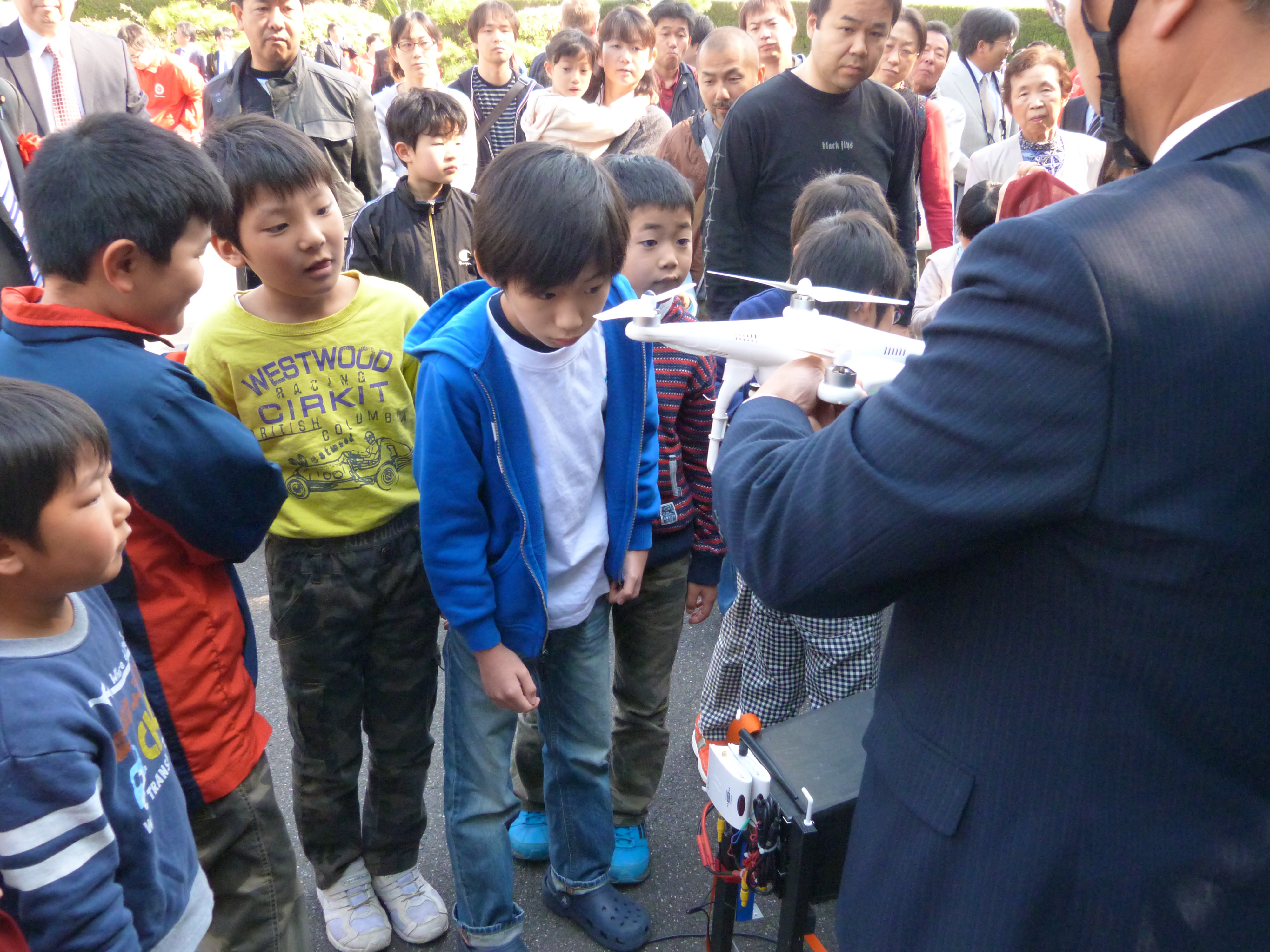 講演後、㈱空撮技研の合田社長によるマルチコプターのデモや、ロボコンロボットの実演と操縦体験を行いました。今回、このマルチコプターを使って空撮の集合写真も撮りましたが、子ども達だけでなく大人も大変興味津々で説明を聞いたり見学をしていました。昨年高専ロボコン全国大会に出場したロボットの操縦体験は大人気で、TEAM ARKの学生が子ども達を一人ずつサポートしながら一緒にロボットを動かして楽しみました。