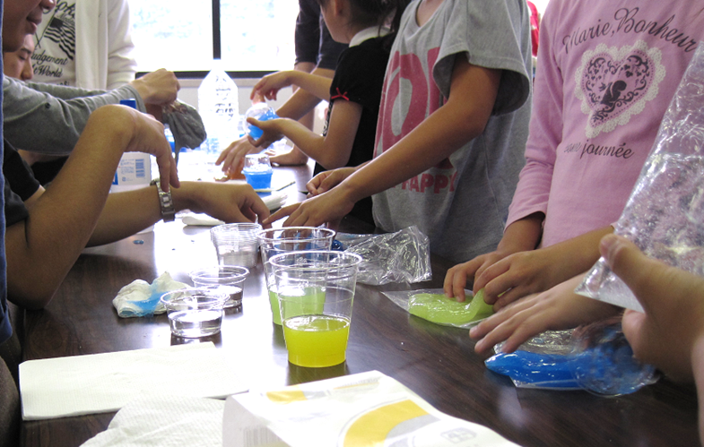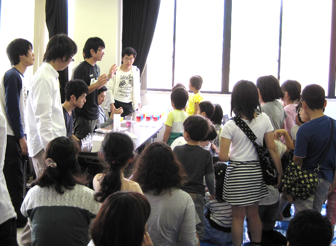 詫間町読み聞かせボランティアのおはなしの会の後、「スライム作り」、「ダイラタンシーの実験(固体?液体?不思議な感触)」の2つのテーマについてDEXの学生と子ども達が一緒に実験を行いました。多くの子供達が参加し、自分たちで実験を行い、スライムやダイラタンシーの感触を楽しんでいました。