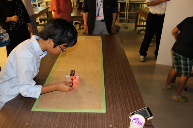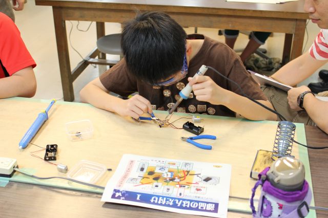今回は7名の小中学生の参加者がありました。ほとんどの参加者が、はんだ付けは、初挑戦でしたが、スタッフの手伝いもあり、回路を作成しロボットを完成させました。その後、ライトロボカーの動かし方を練習し、みんなでレース大会をして楽しみました。