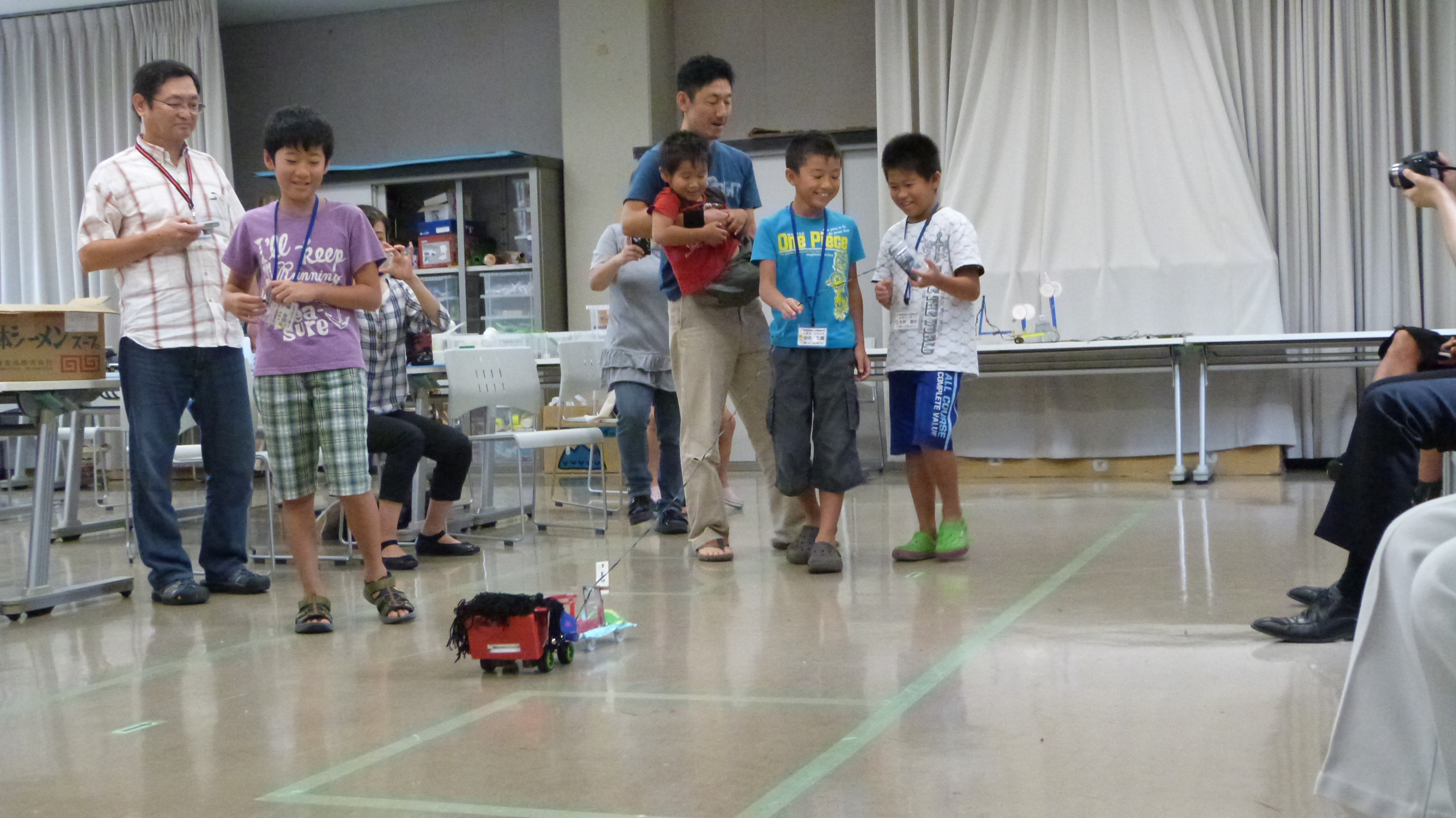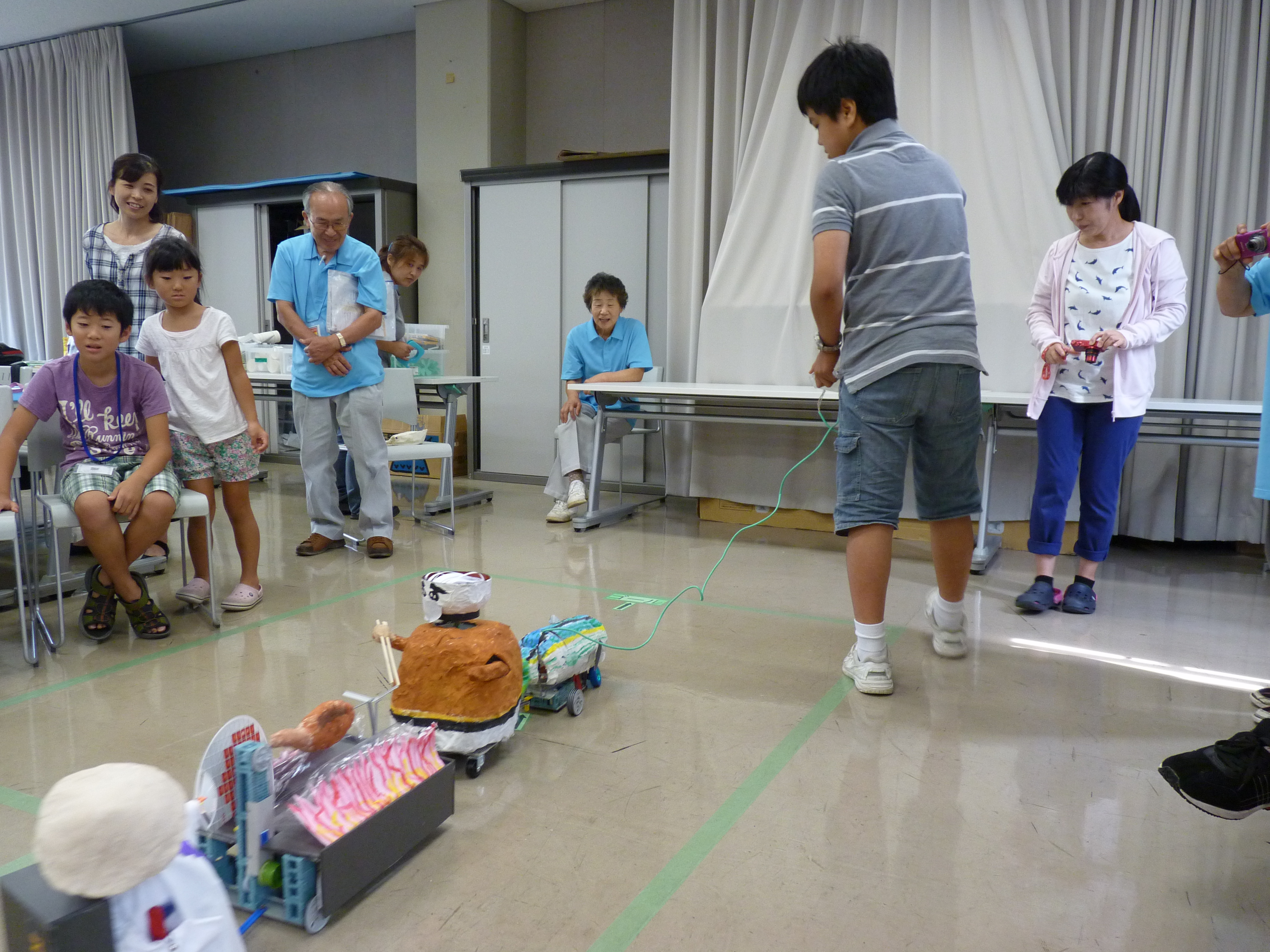 走行性、からくり機構の工夫、パフォーマンスの表現、プレゼンテーションの内容などを審査員が採点して総合得点を競います。今年は6チームが参加しました。山車にはキャラクターや地域の特産物などが動いたり、楽しい仕掛けがたくさん施され、楽しませてくれました。