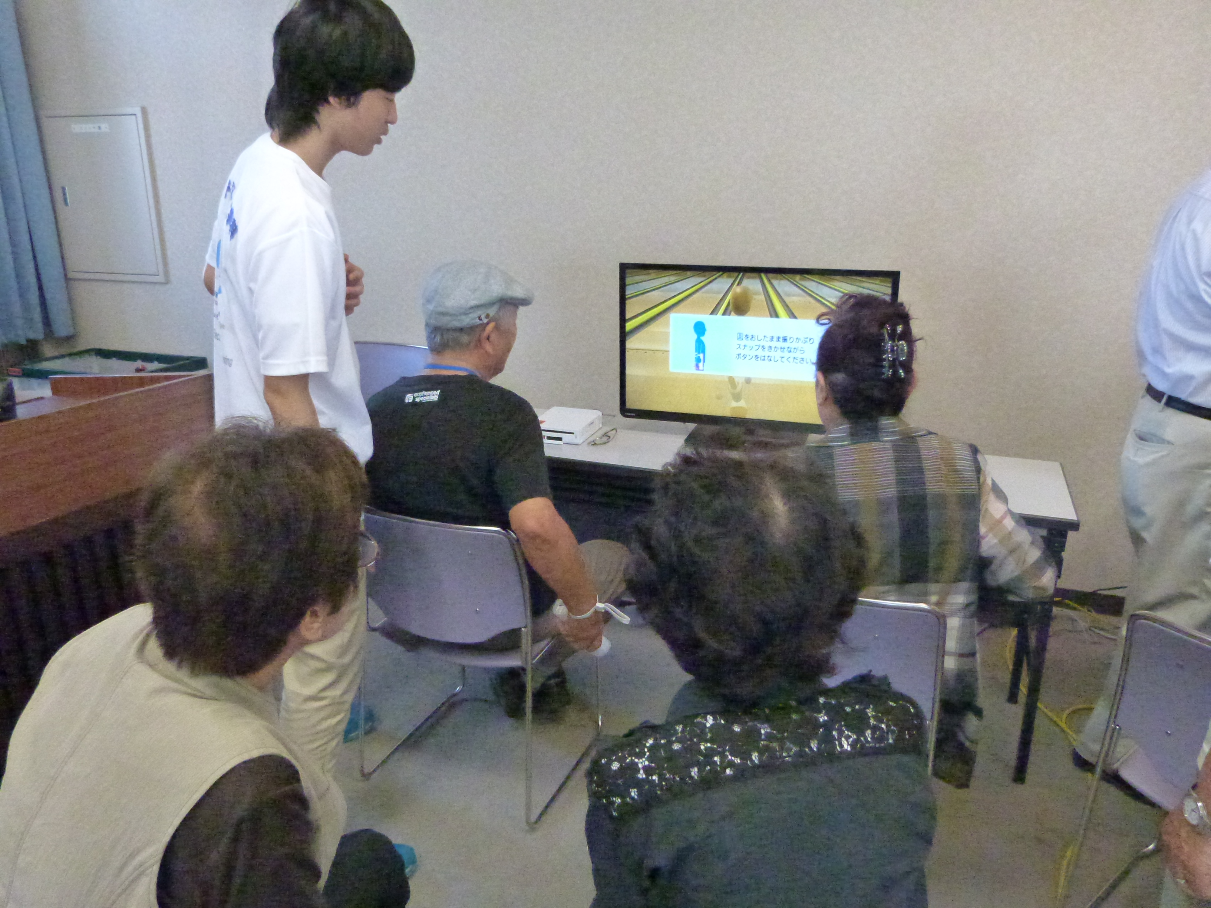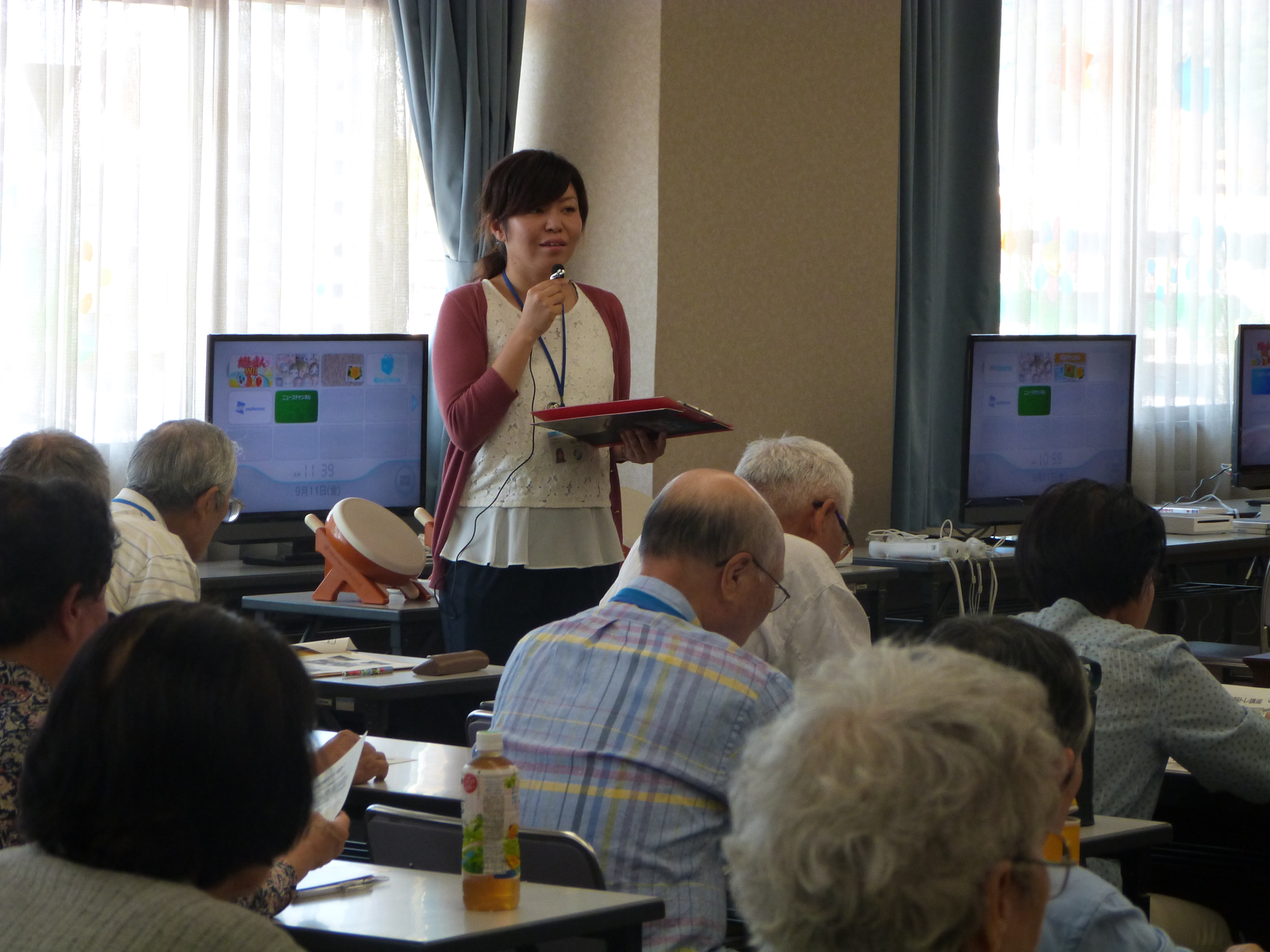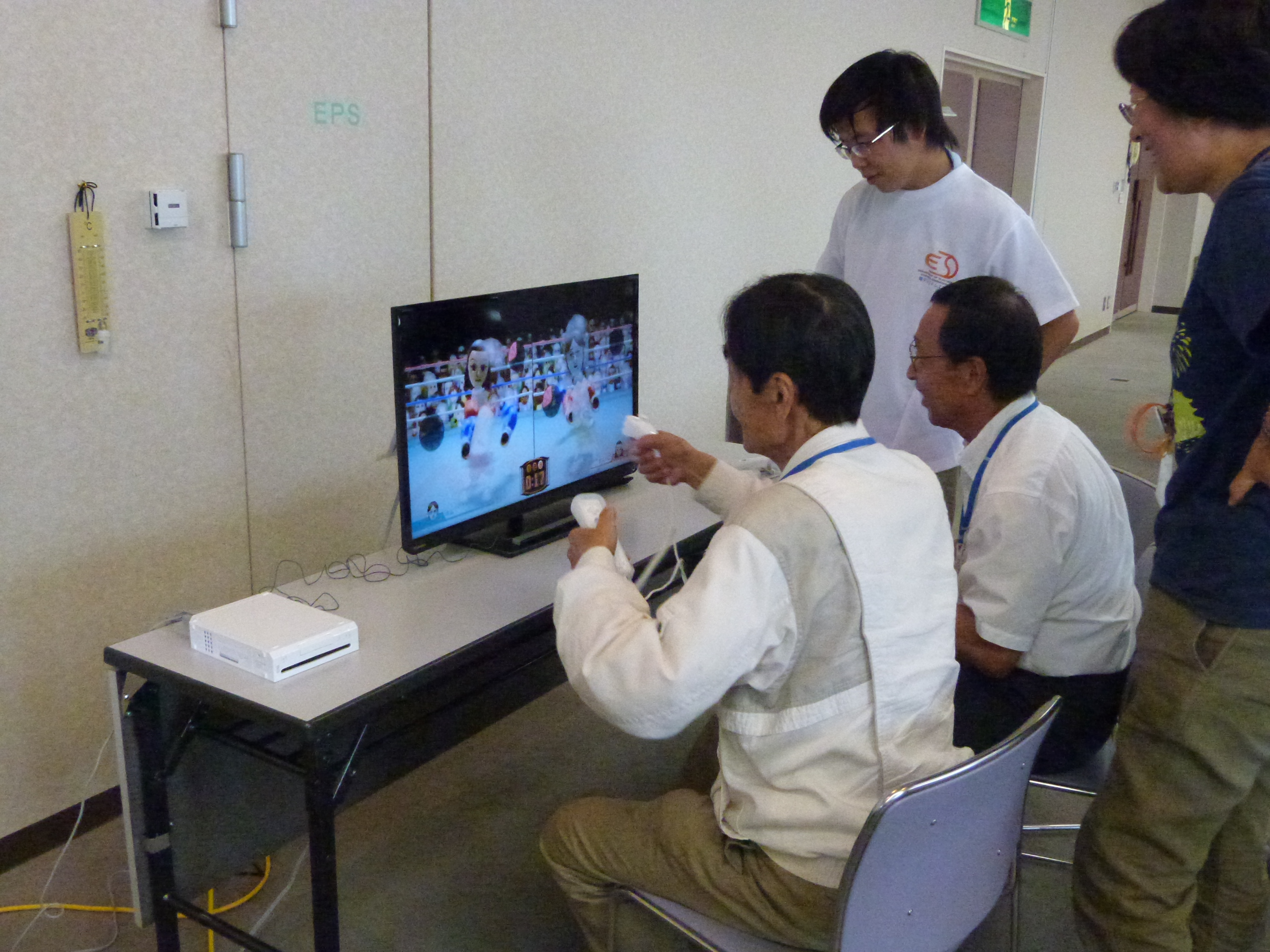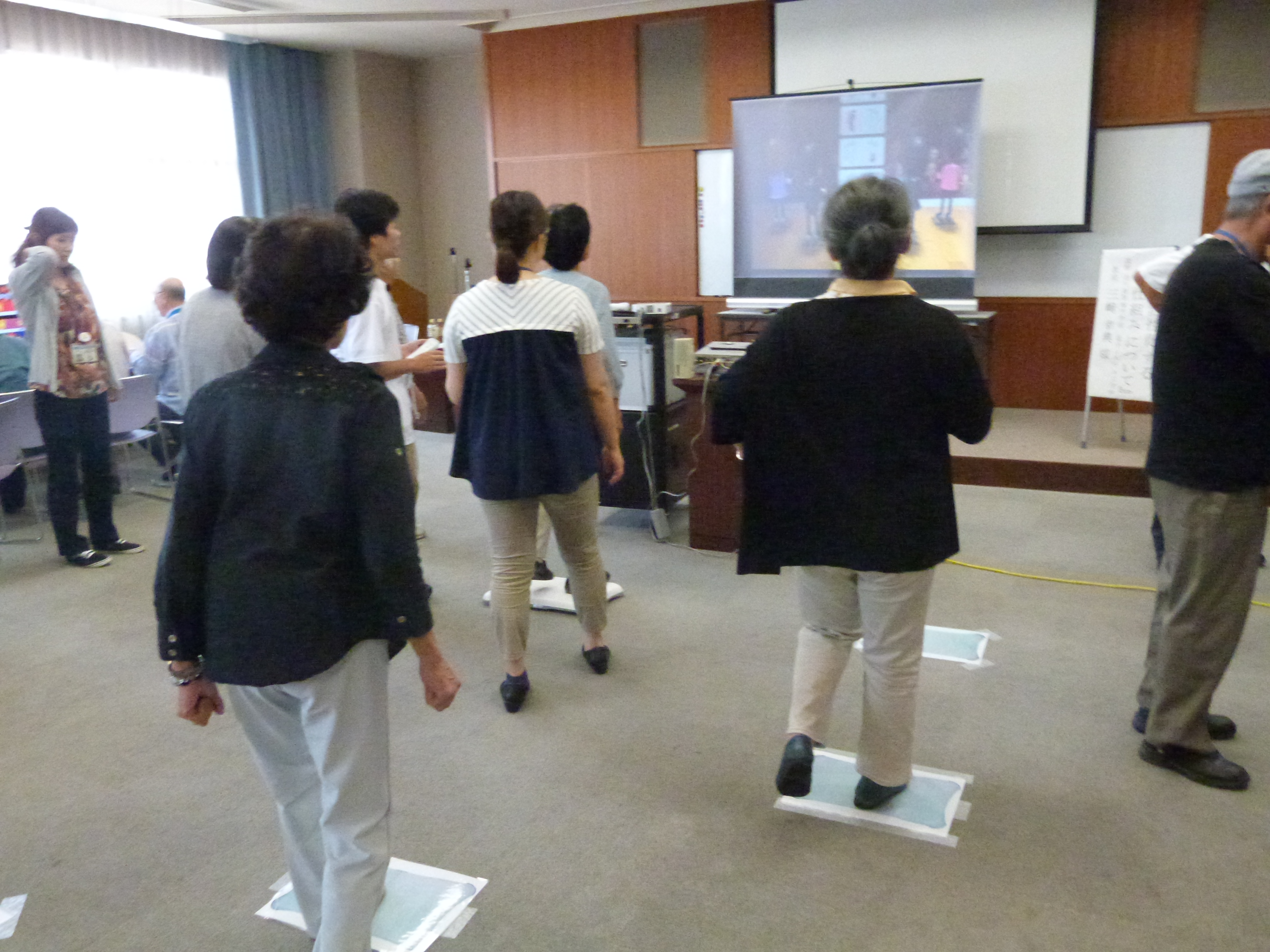 今年度第1回目となった今回は、「脳」が活性化するしくみについて本校電子システム工学科三崎教員によるプレゼンテーションから始まり、その後、家庭用ゲーム機「Wii」を用いたリズム運動のやり方を学生がデモンストレーションし、参加者全員で画面のリズムに合わせた運動を行いました。