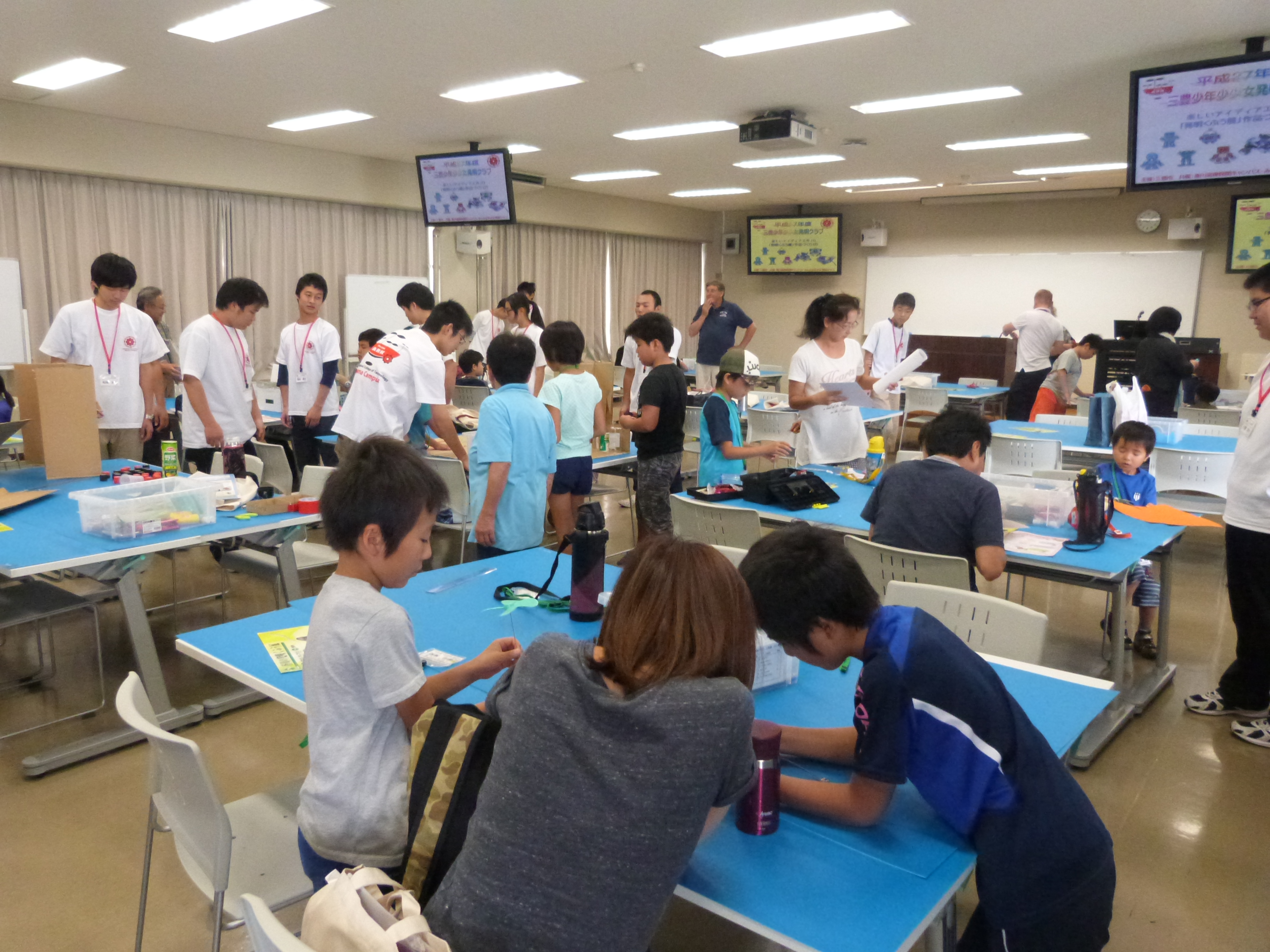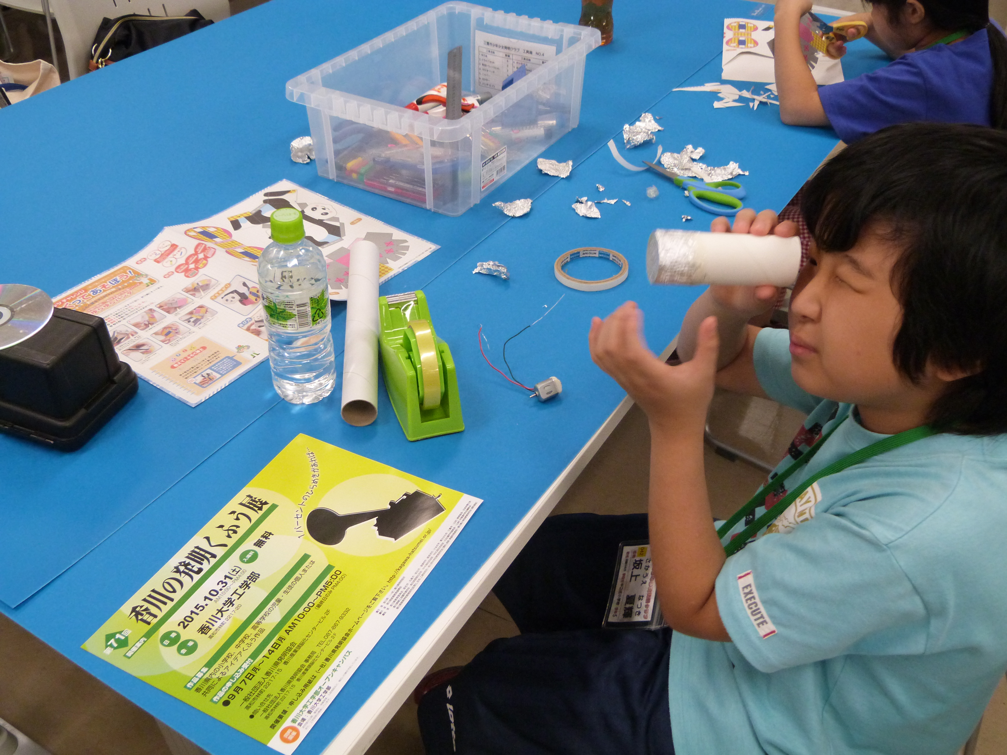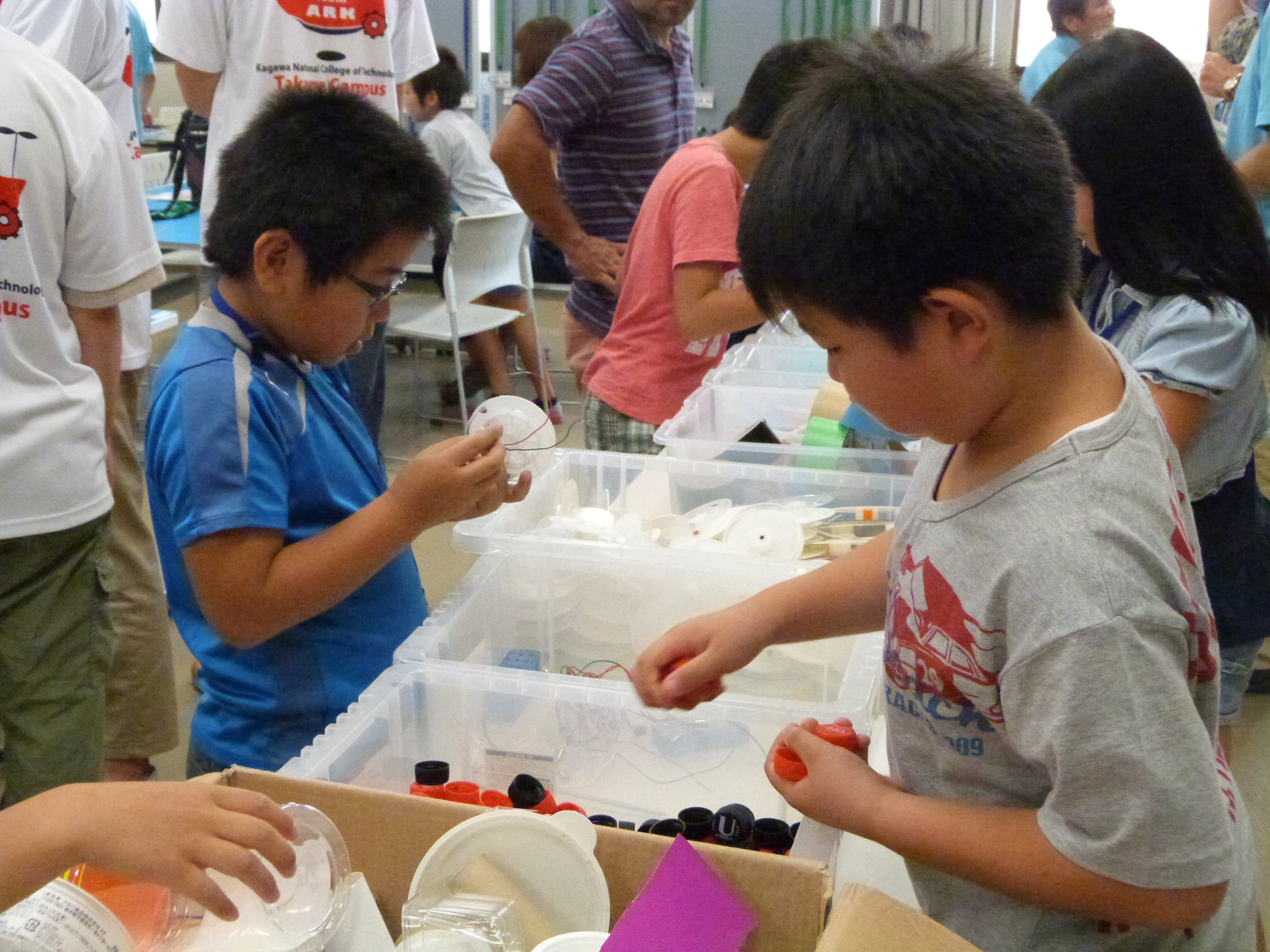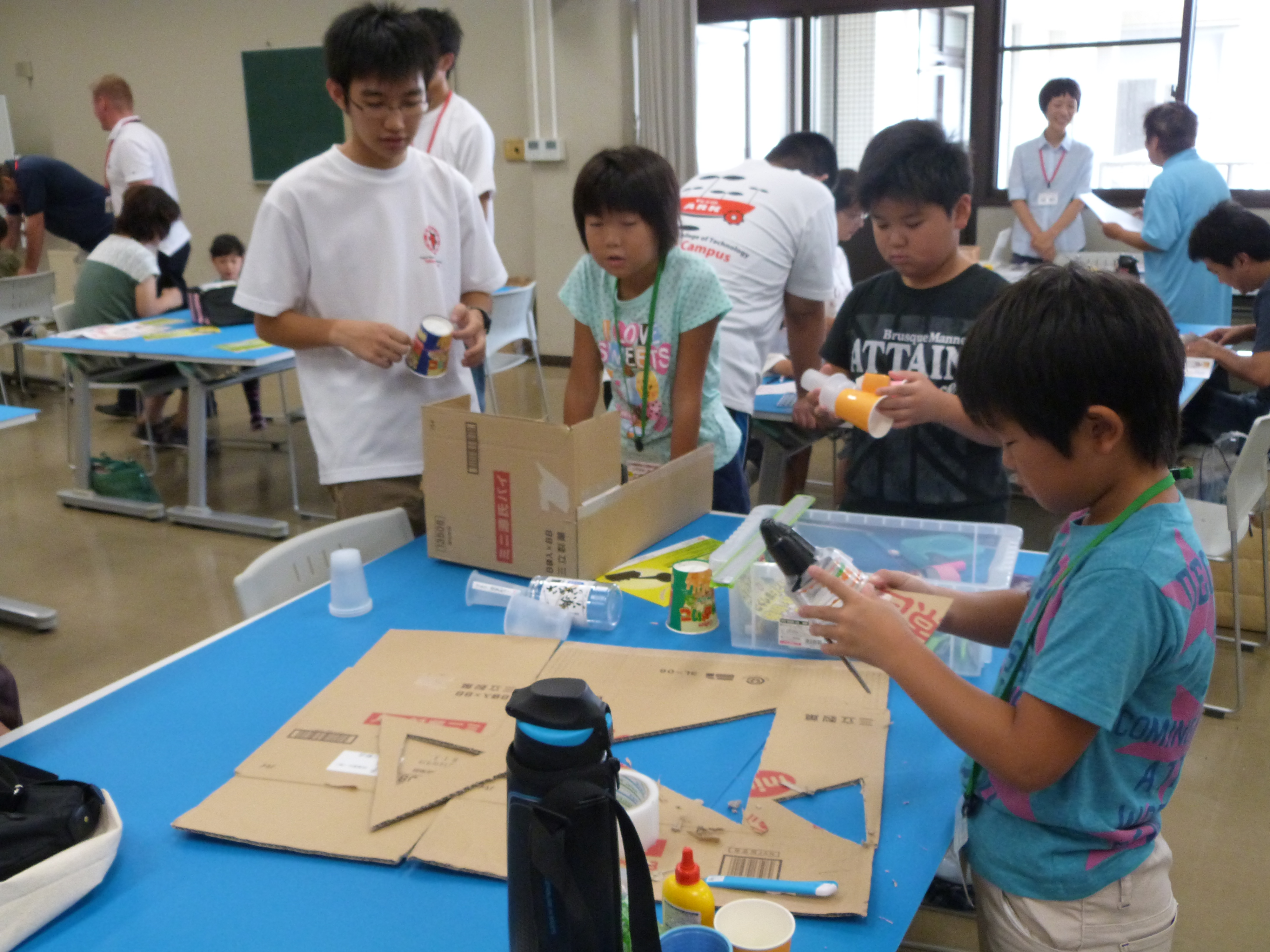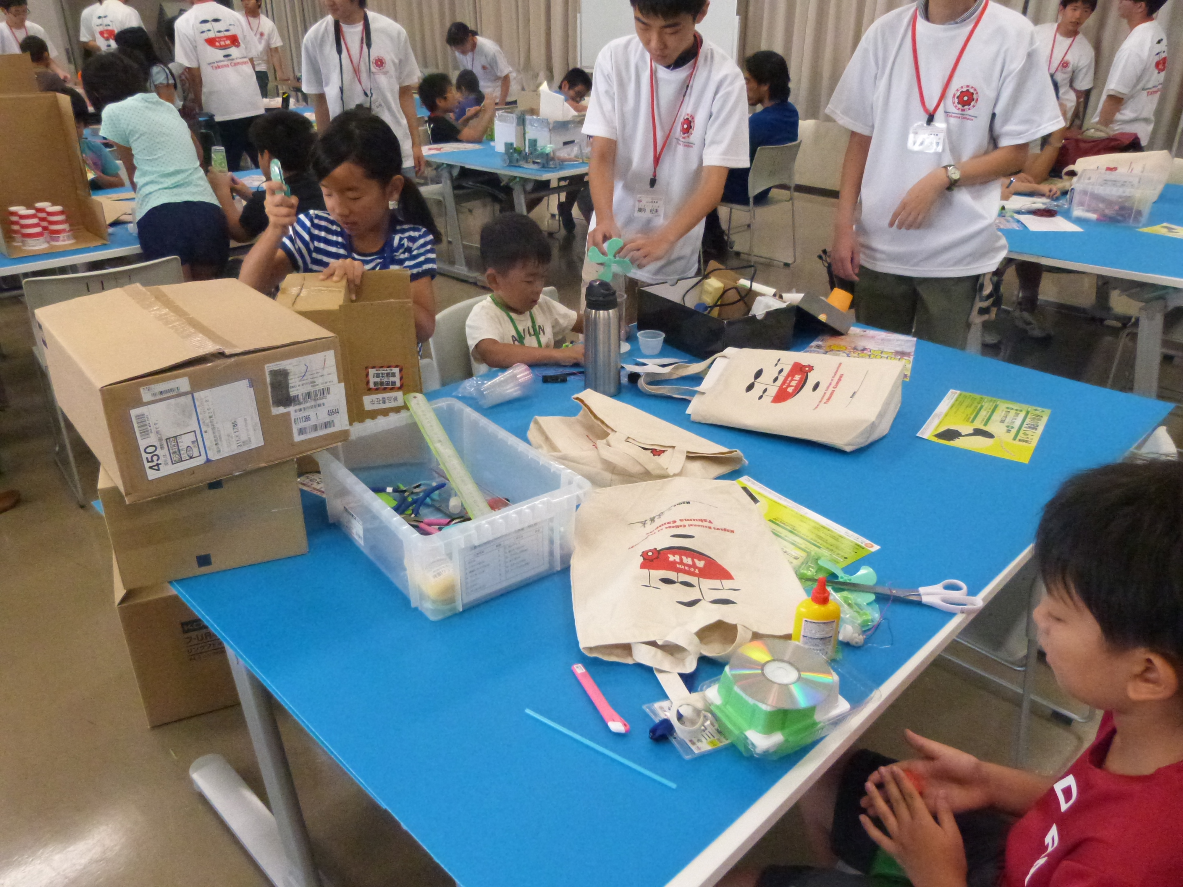 難しい作業も慣れてきたようで、子ども達は手を休めることなく、工作に集中していました。発明クラブの指導員や学生たちに声をかけられ、材料を切ったり貼ったりするうちに、頭の中にアイディアがたくさん浮かんできた様子で、楽しん取り組んでいました。
