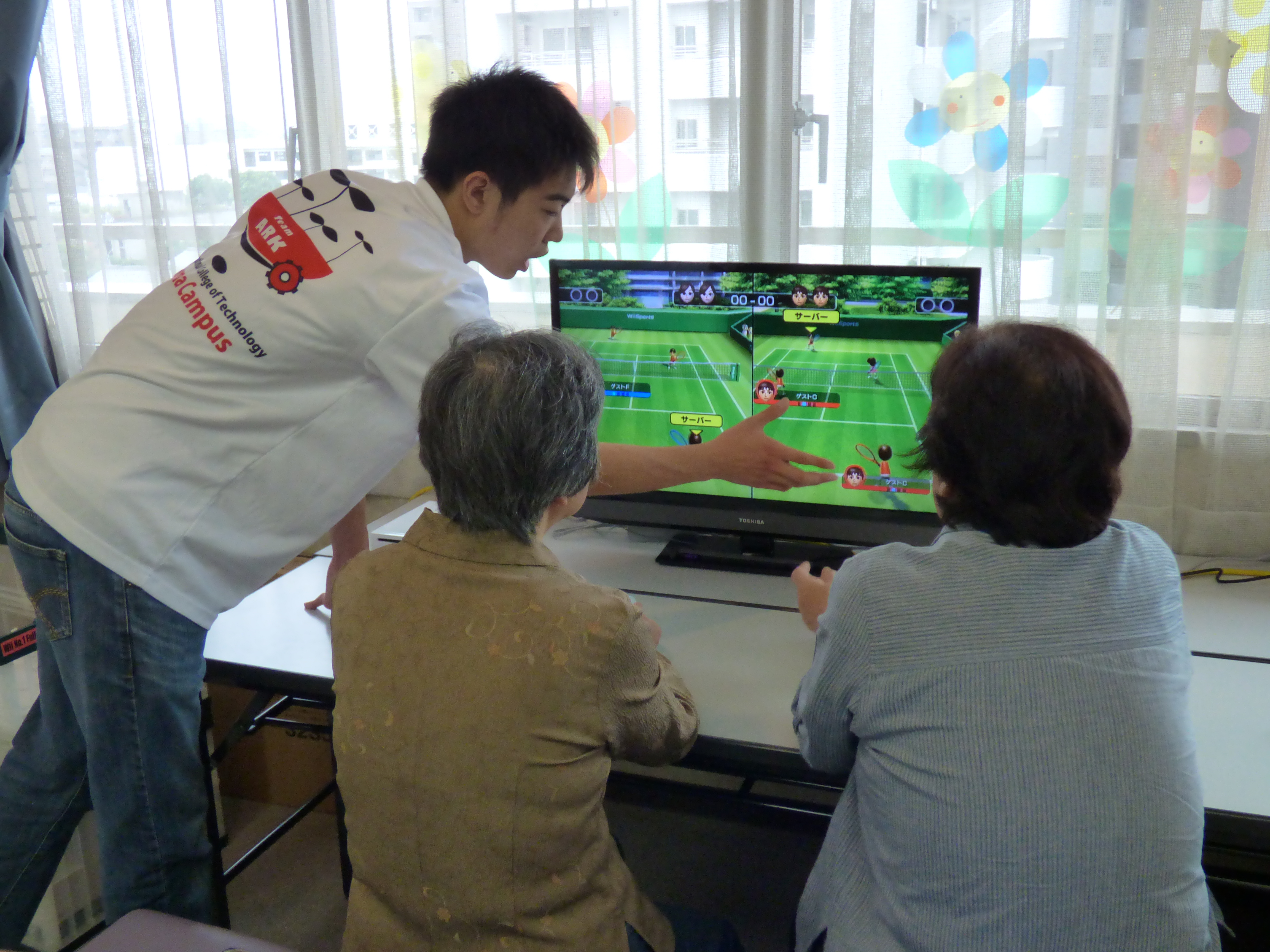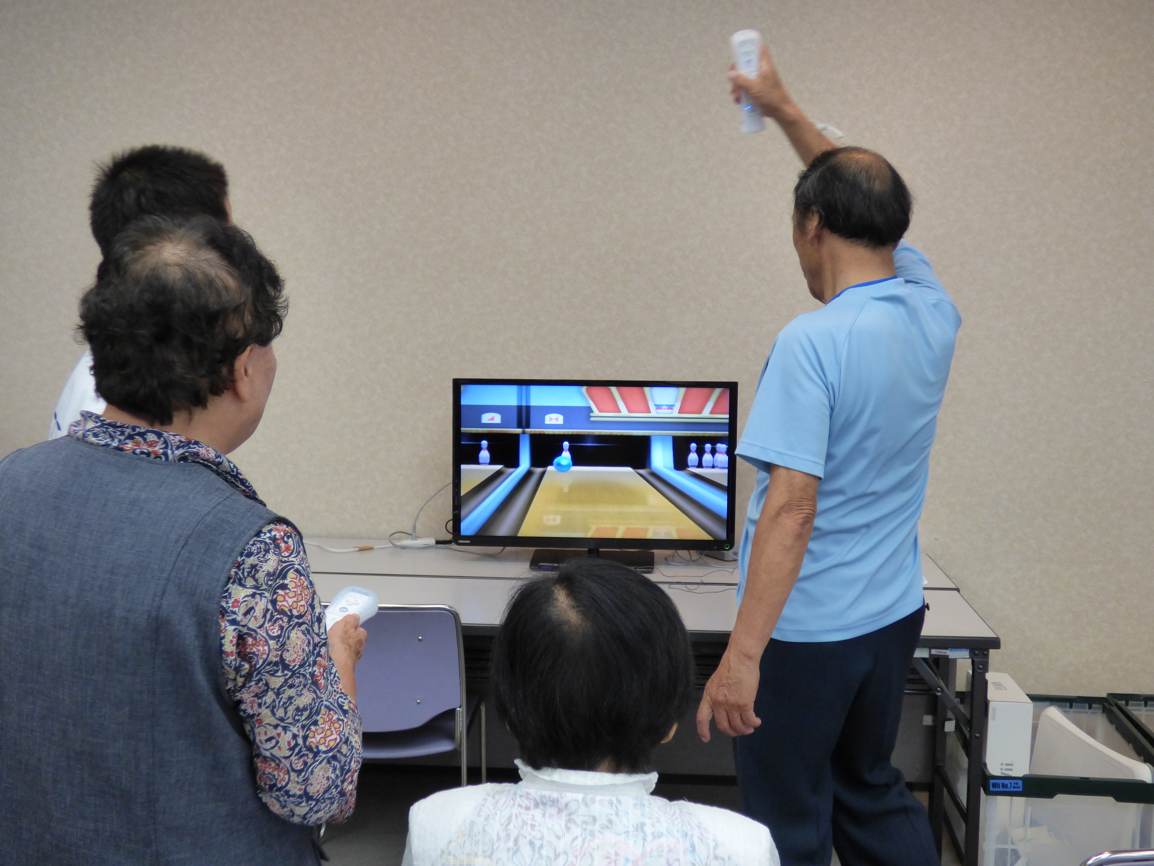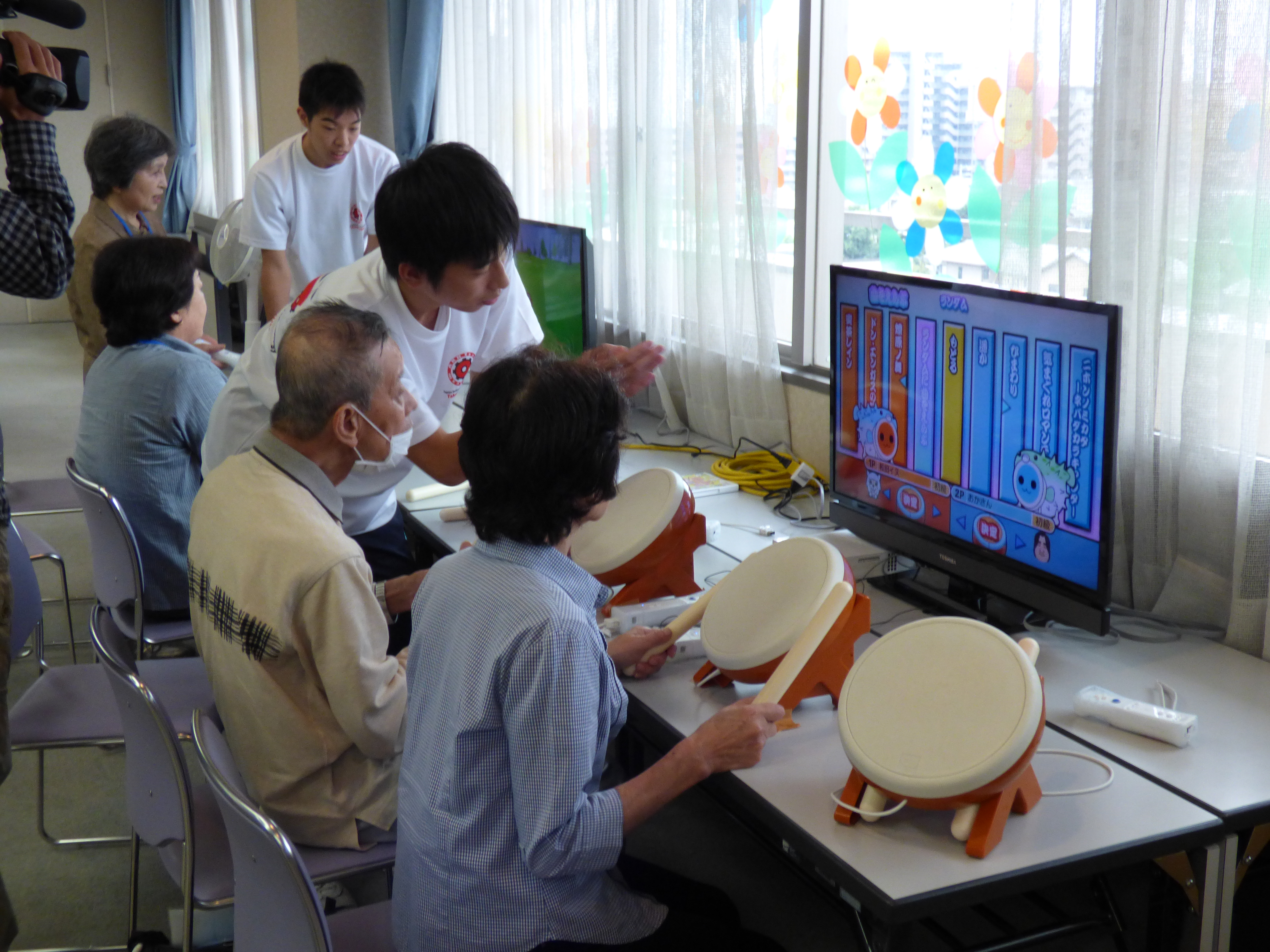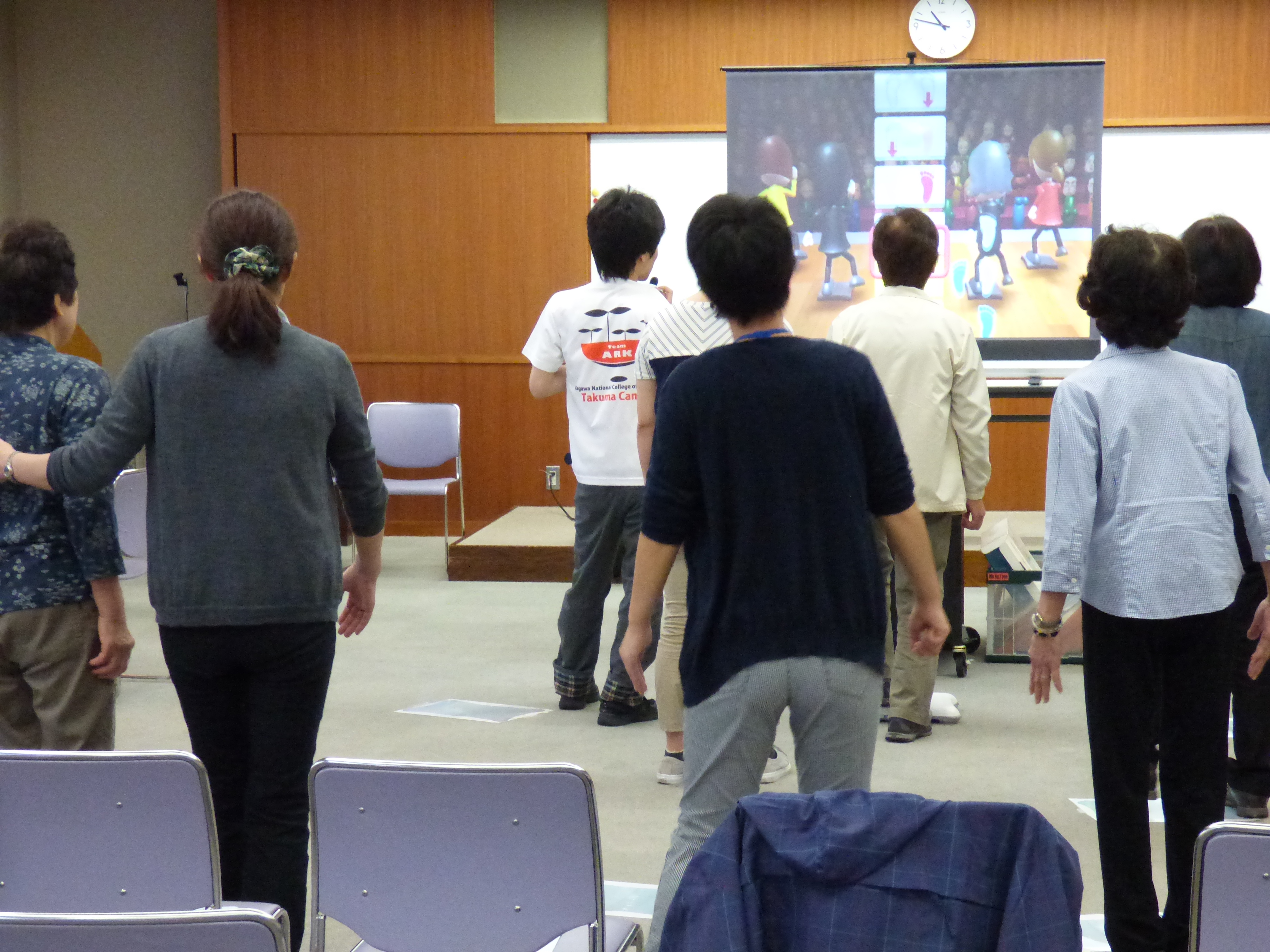 第2回目の今回は、家庭用ゲーム機Wiiを使い音楽に合わせて太鼓を叩く太鼓の達人、Wiiボードを使った有酸素運動、バランス運動などを用意しました。ゲームの順番を待つ間に後ろで練習をしたり、失敗して大きな声で笑ったりしながら、意欲的にゲームを体験いただきました。