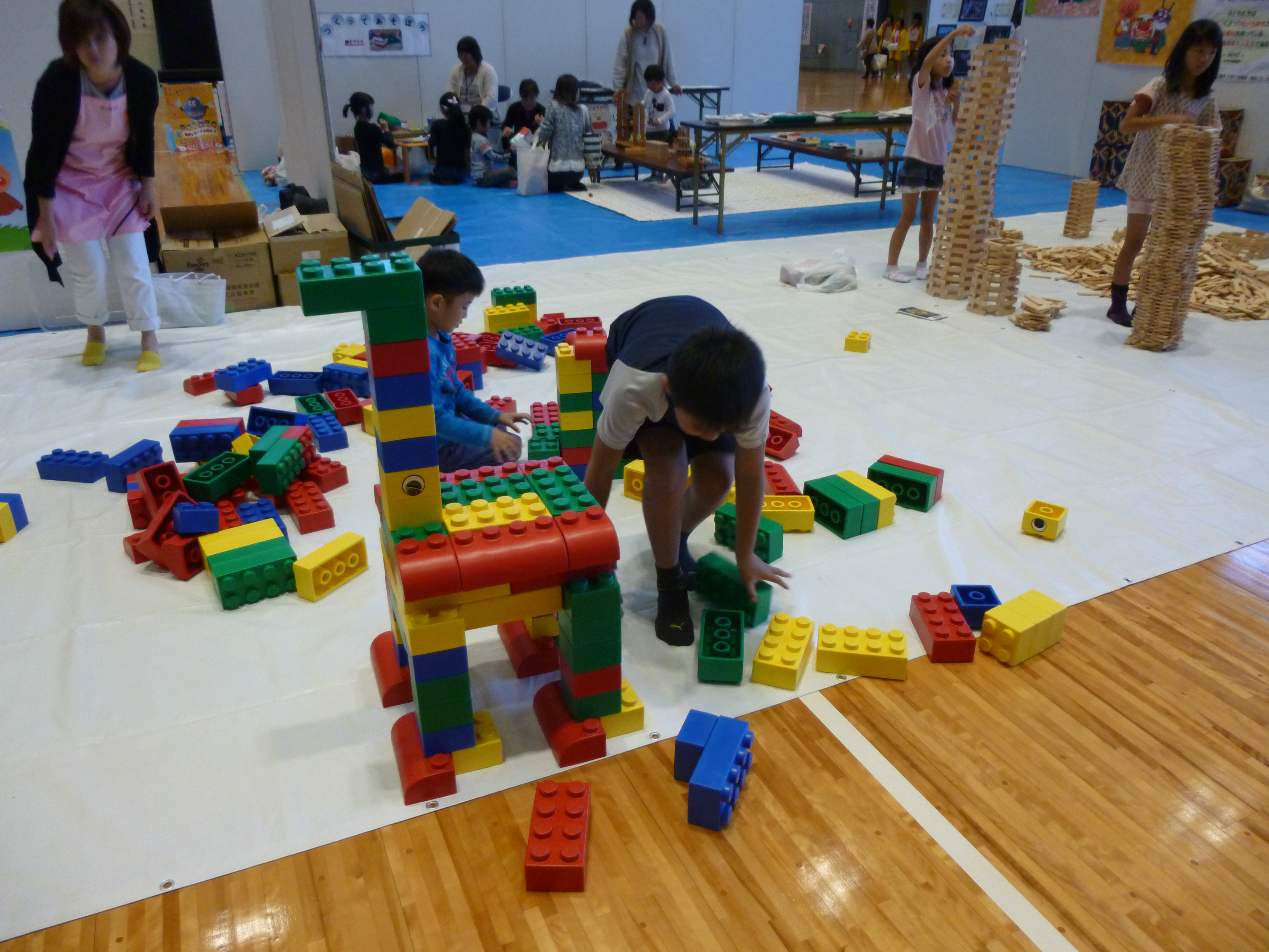 子ども達はカプラで高い塔や橋を友達と一緒に作ったり、カラフルで柔らかく安全に遊ぶことのできるソフトレゴブロックで自分よりも大きな動物を作ったり、小さなこどももお父さんやお母さんと一緒に楽しんでいました。