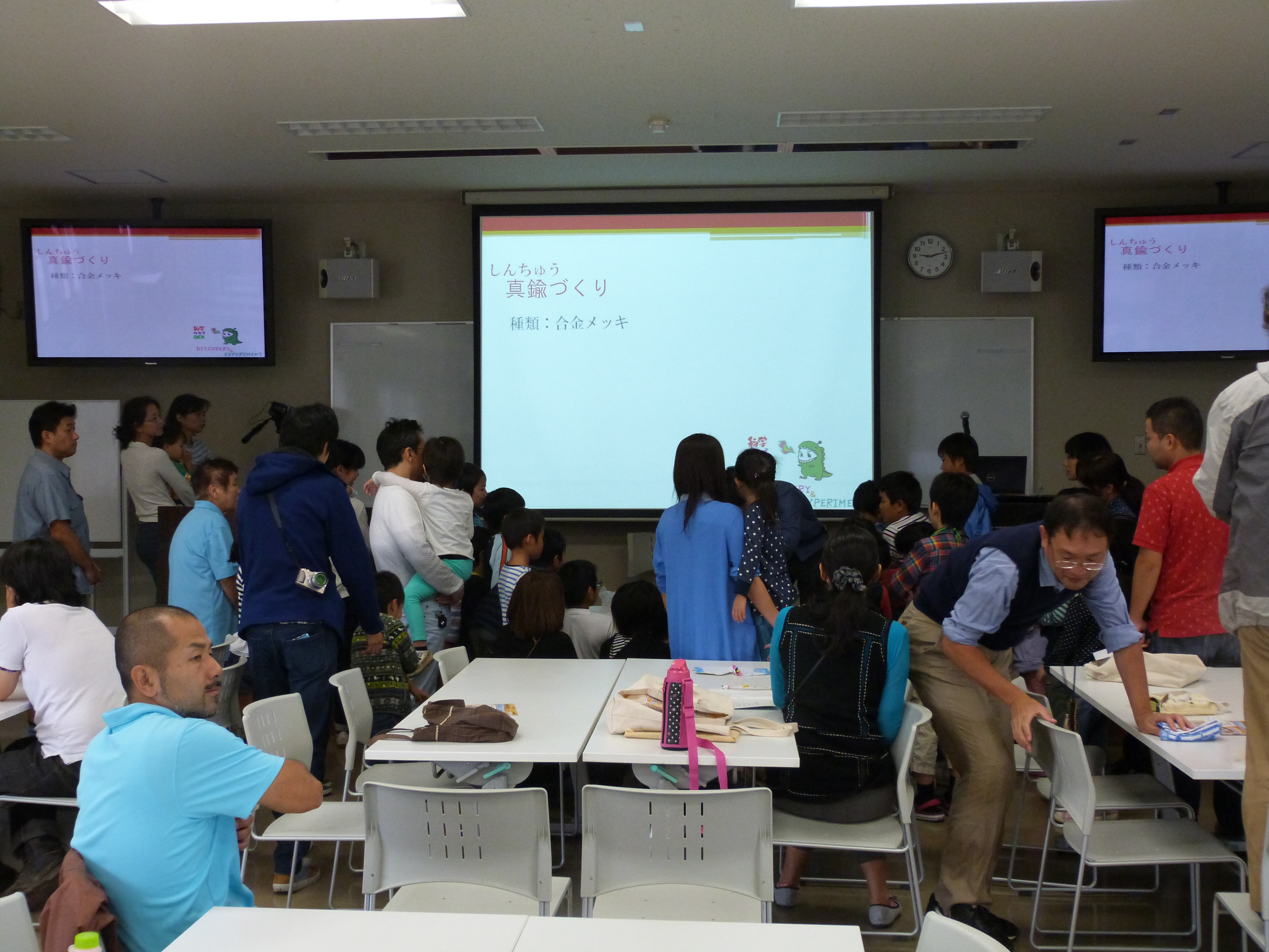 今回は“めっき”や“プラスチック”に関する実験を行いました。亜鉛めっきと真鍮づくりを演示実験で見てもらったあと、班ごとに銅めっきの実験を行いました。また、硬質発泡ポリウレンタンができる様子や発泡スチロールが溶ける様子を見てもらいました。