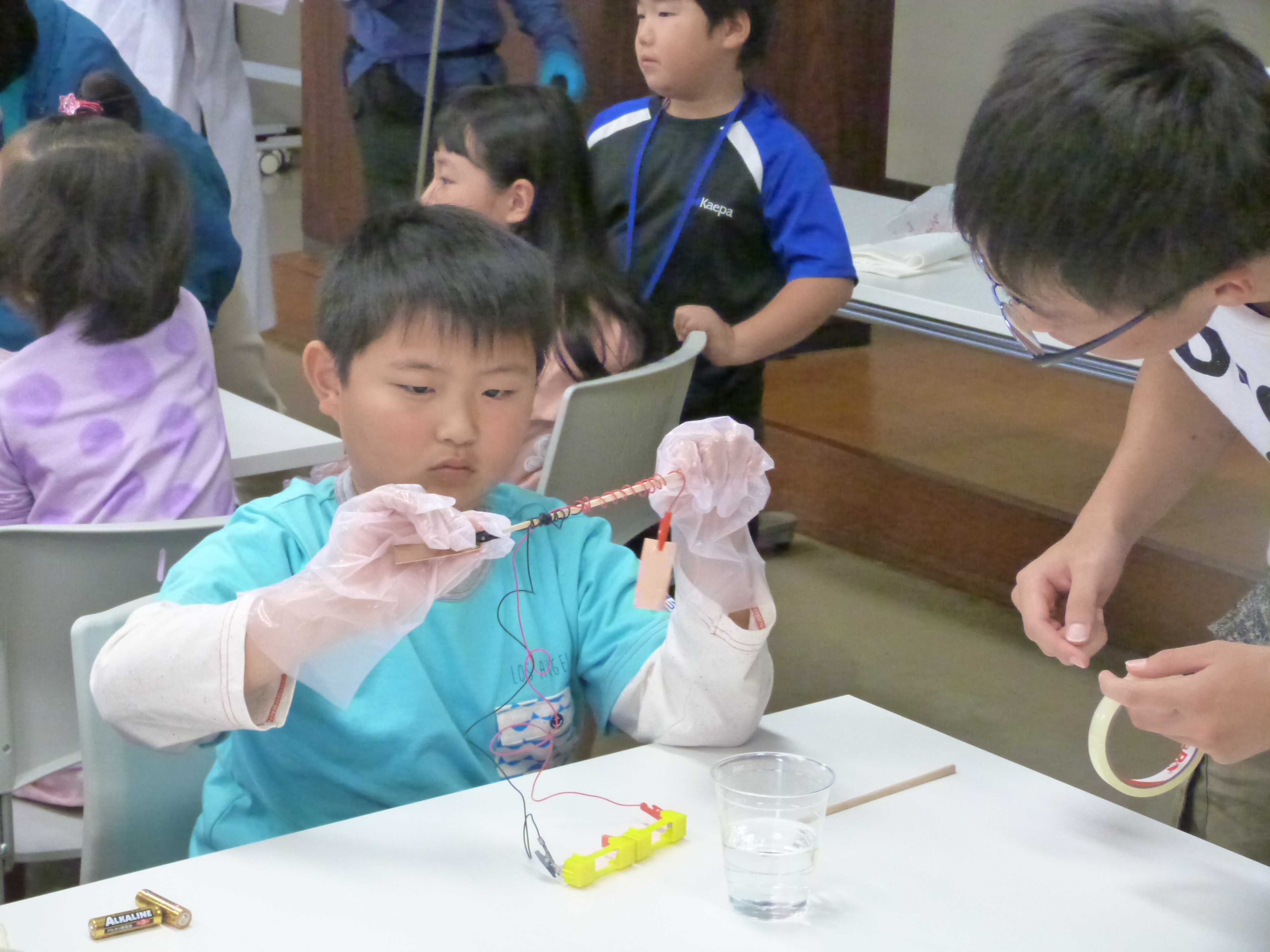 金属がめっきされて色が変わる様子や、溶液を混ぜることで膨れ上がって発泡ウレタンができる様子、逆に発泡スチロールが溶ける様子に子供達は興味をもって観察していました。