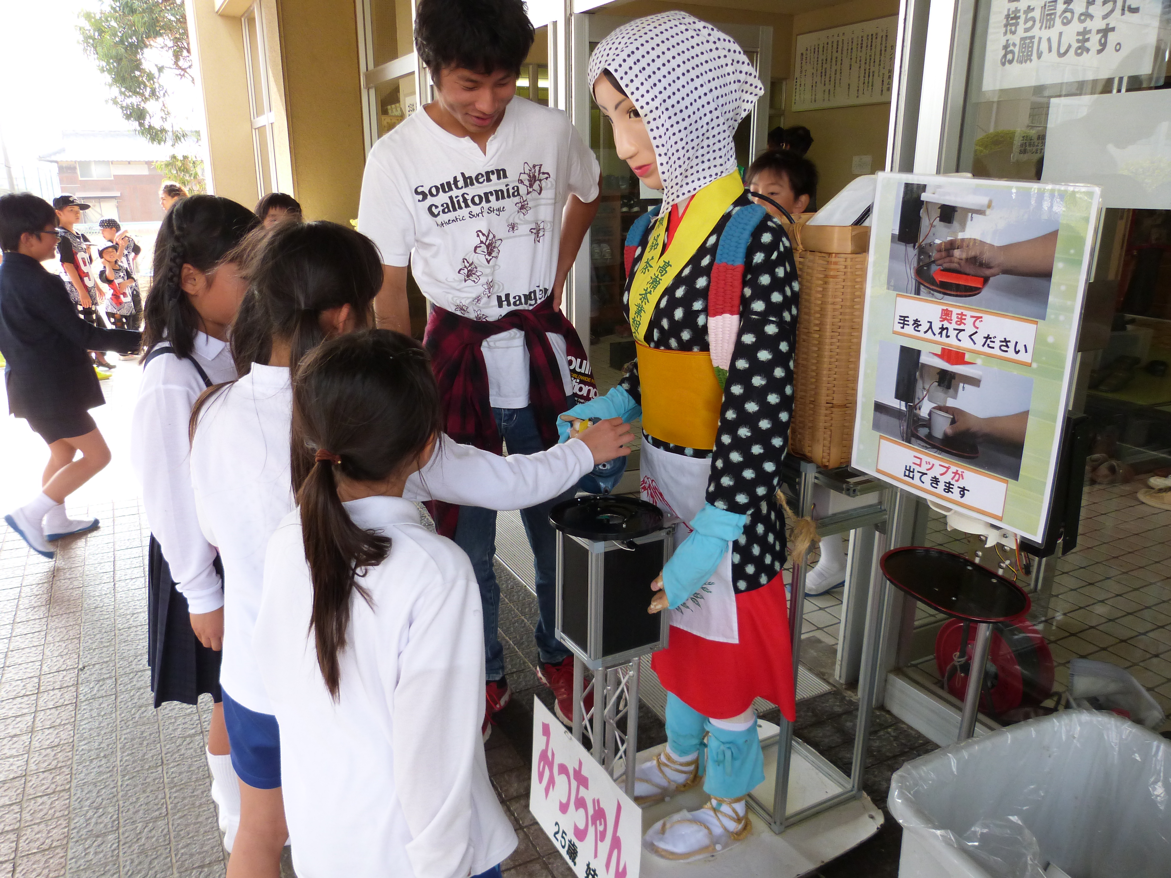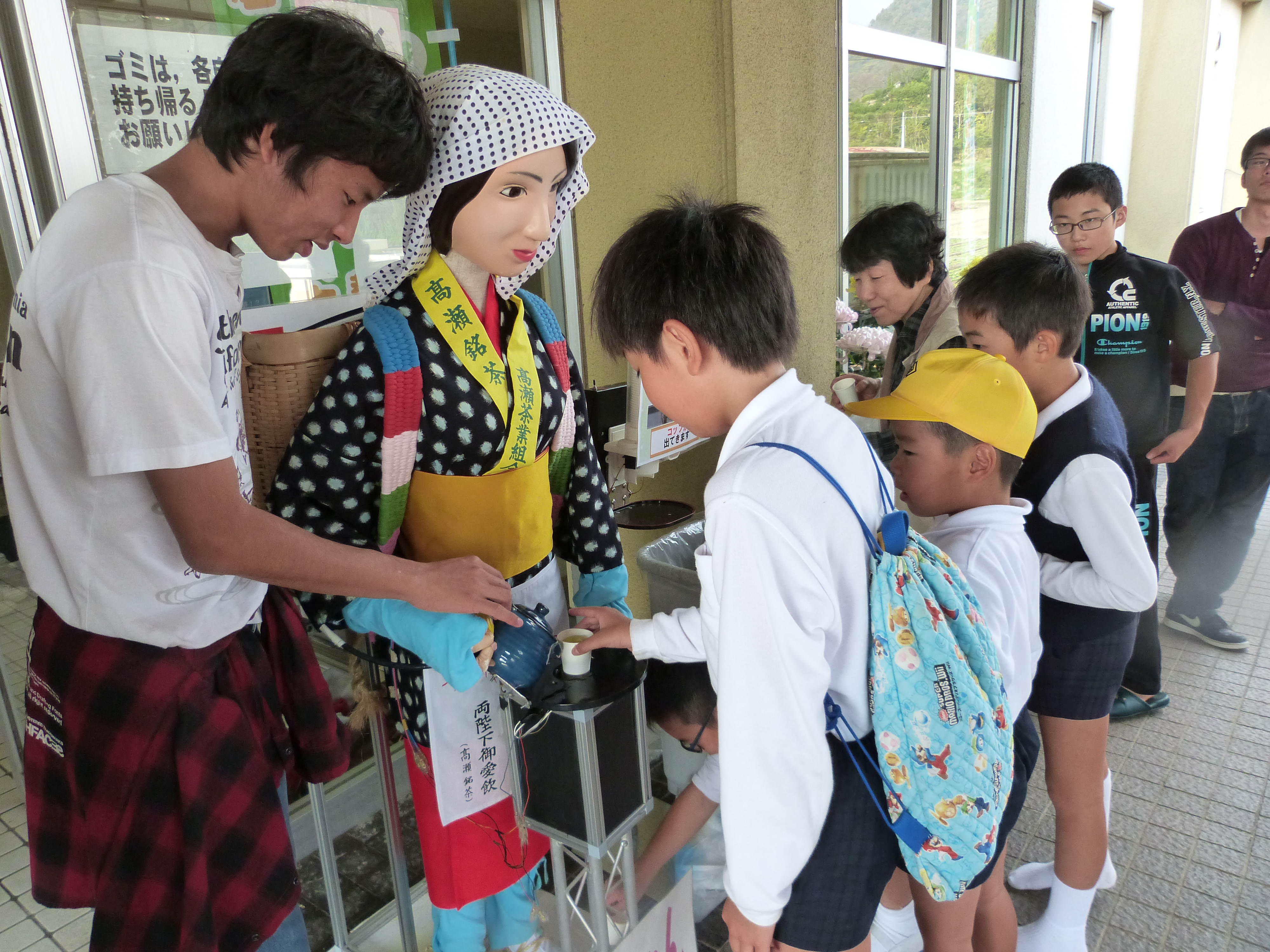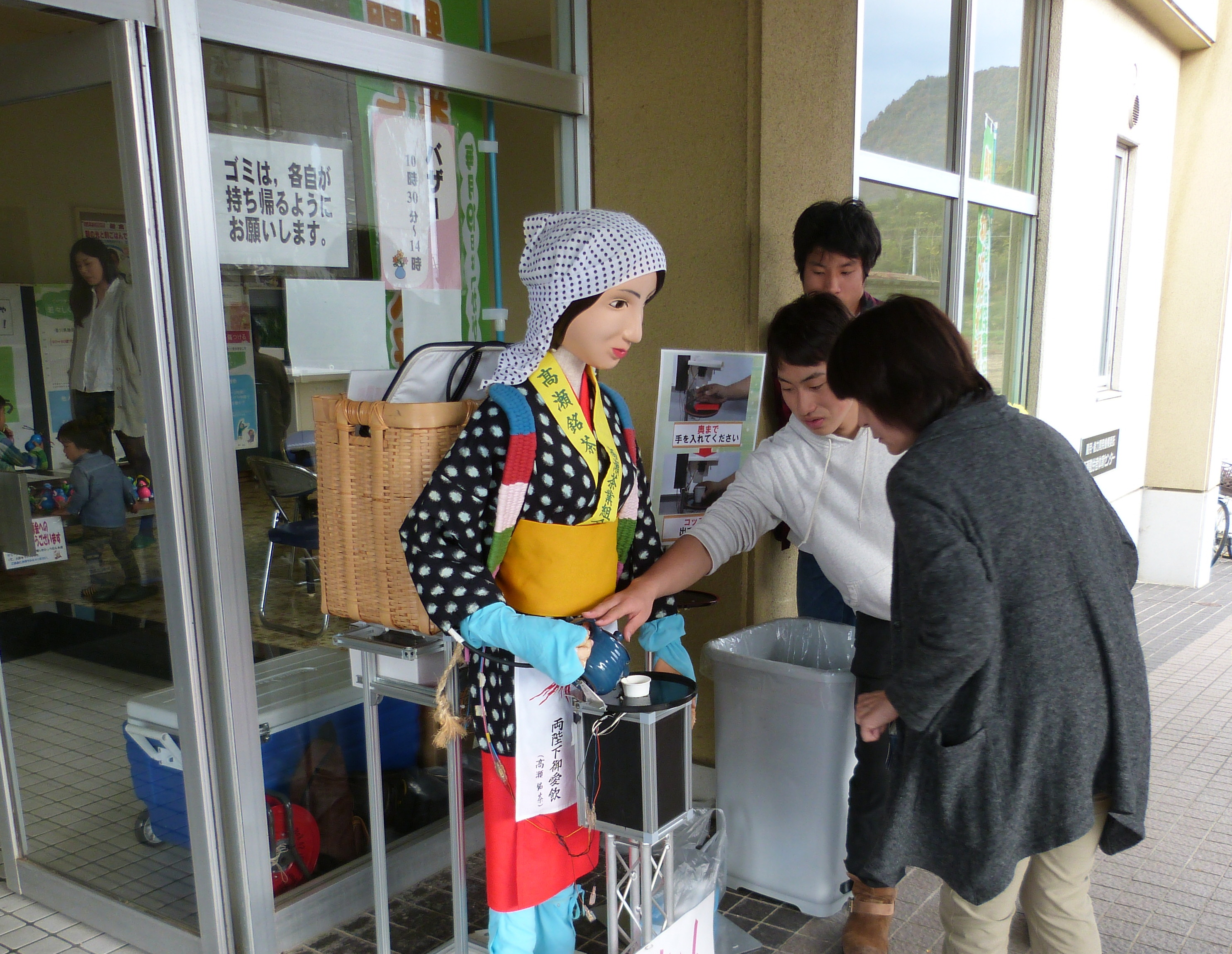 第40回比地二地区文化祭にて、お茶サービスロボット「みっちゃん」が高瀬茶接待