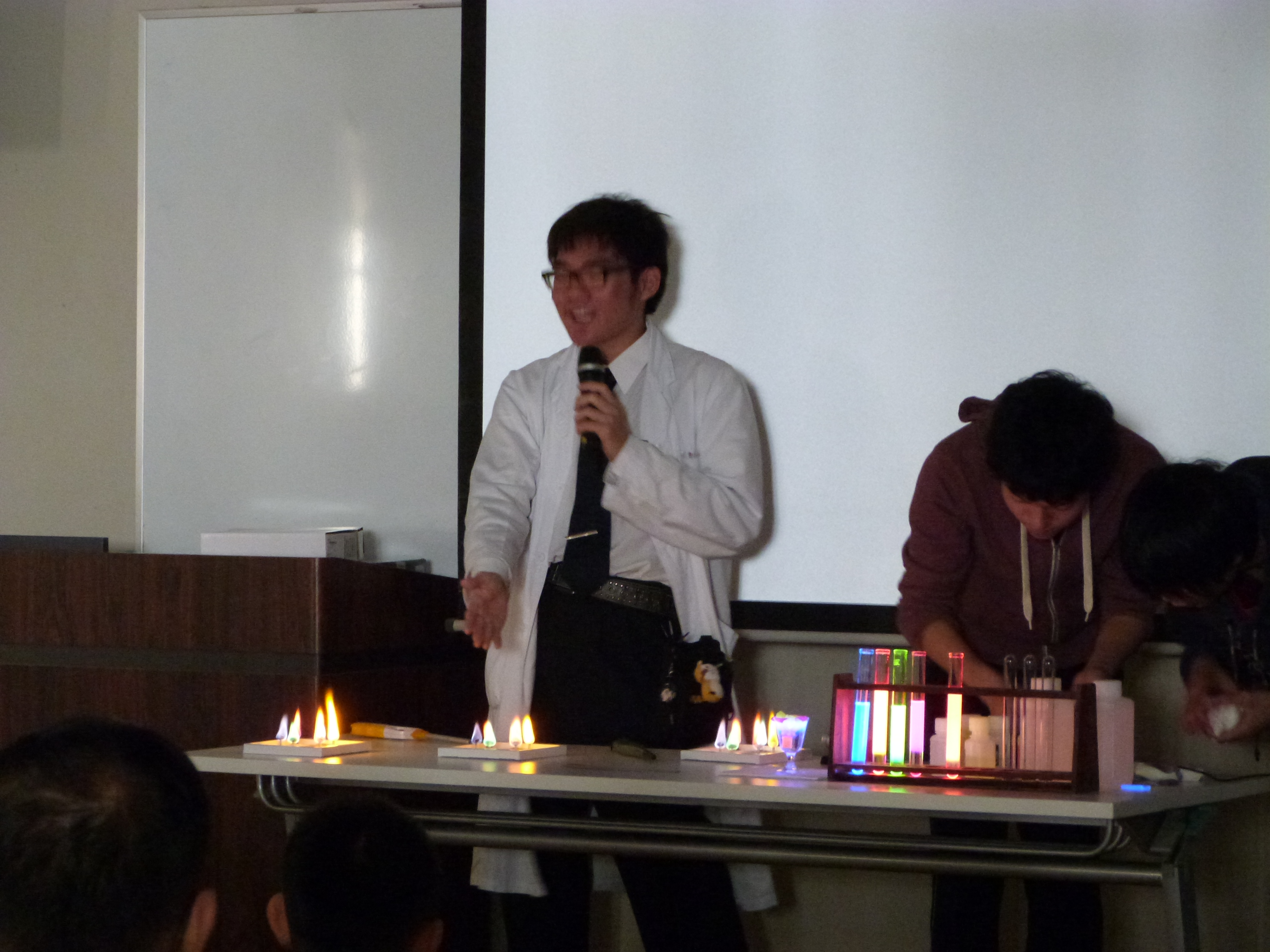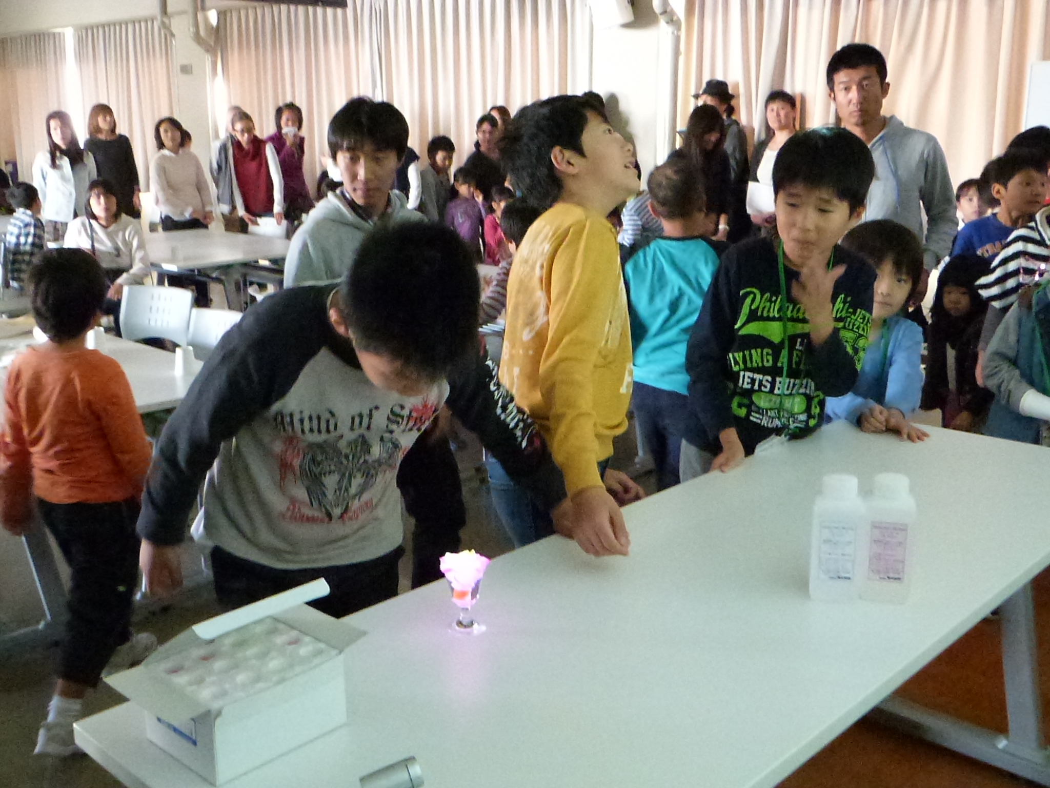 そのあと、演示最後として、アンモニアの噴水や化学発光に関する実験をみてもらいました。一瞬の変化の実験もあり、見逃してしまった子供もいましたが、化学変化で色が変化したり、光を発する現象に興味をもって見ていました。