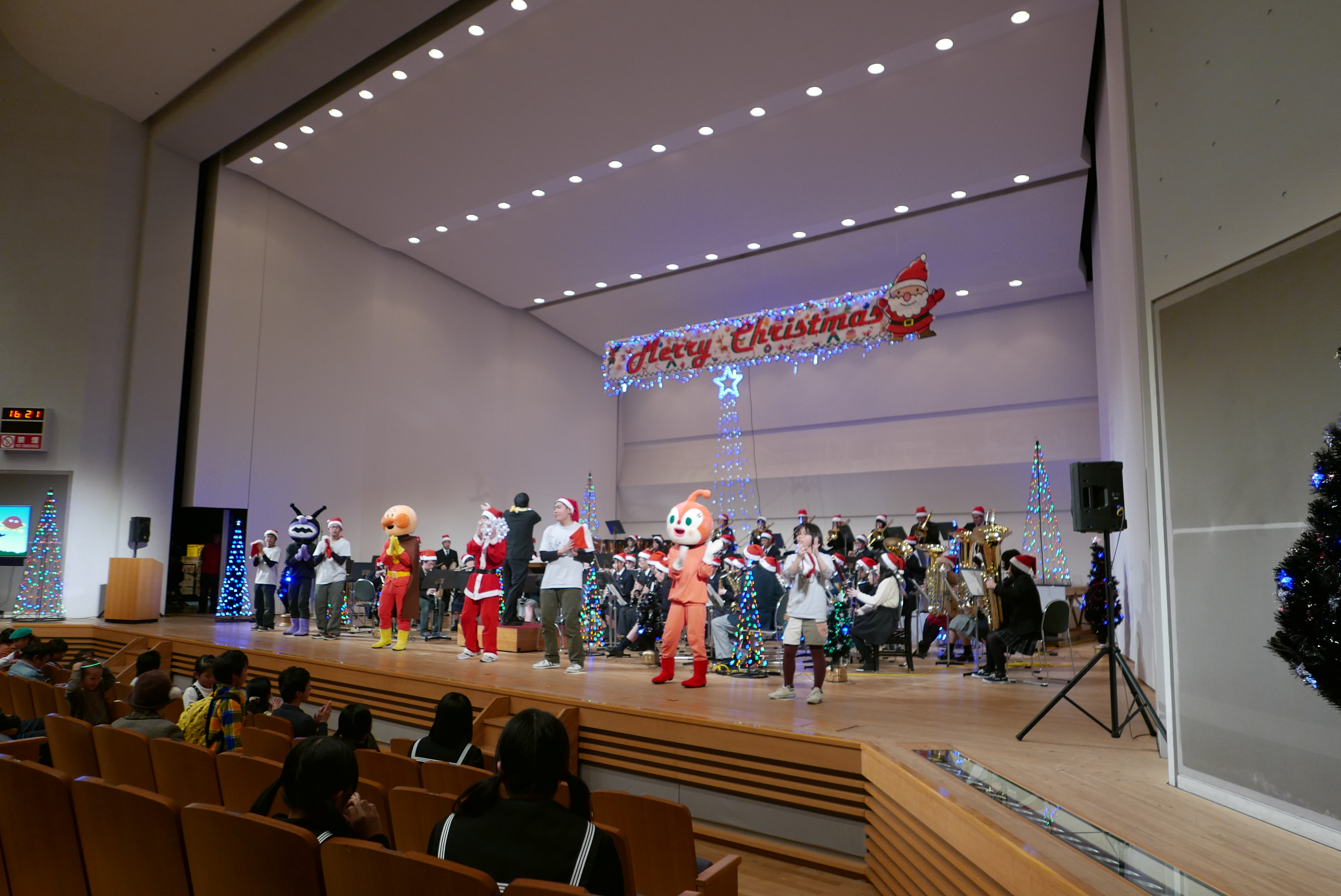 詫間キャンパス吹奏楽部は笠田高等学校、尽誠学園高等学校吹奏楽部と合同でクリスマスソングや子ども達に人気のディズニーソングなどを、サンタクロースやアンパンマン達が登場するSPOTの学生による劇や、ジャグリングパフォーマンスに合わせて演奏しました。劇のストーリーは毎年学生が考えており、一つの物語の中にうまく曲やパフォーマンスを組み込んで会場を盛り上げました。