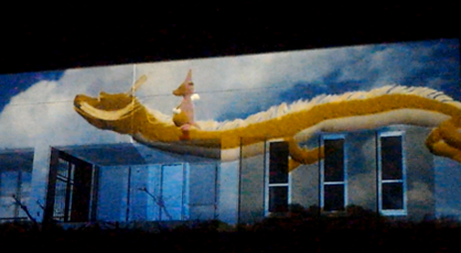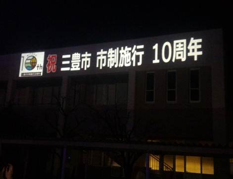当日はあいにくの天気でしたが、イルミネーションの点灯式が近づくにつれ晴れ間が見え始め、予定どおり総合福祉会館の壁面へのプロジェクションを行うことができました。明るく迫力のある映像と音声で、点灯式に華を添えることができました。