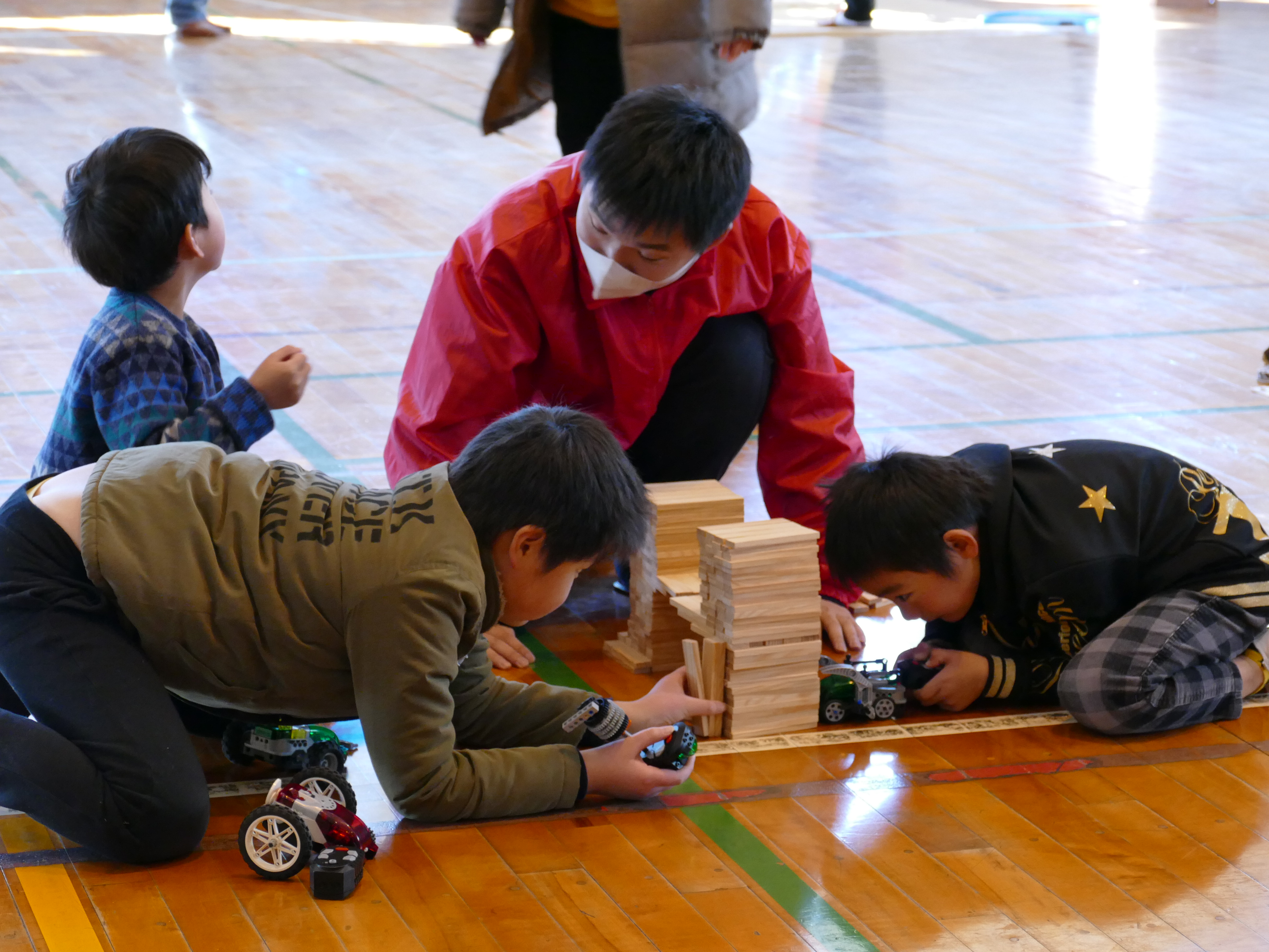 また木の積み木「カプラ」で遊ぶ子ども達もたくさんいて、高く積み上げる競争をしたり、スパイボットで作ったロボットの走行コースを作ったり、それぞれ考えて工夫して思い思いのものづくりを楽しんでいました。