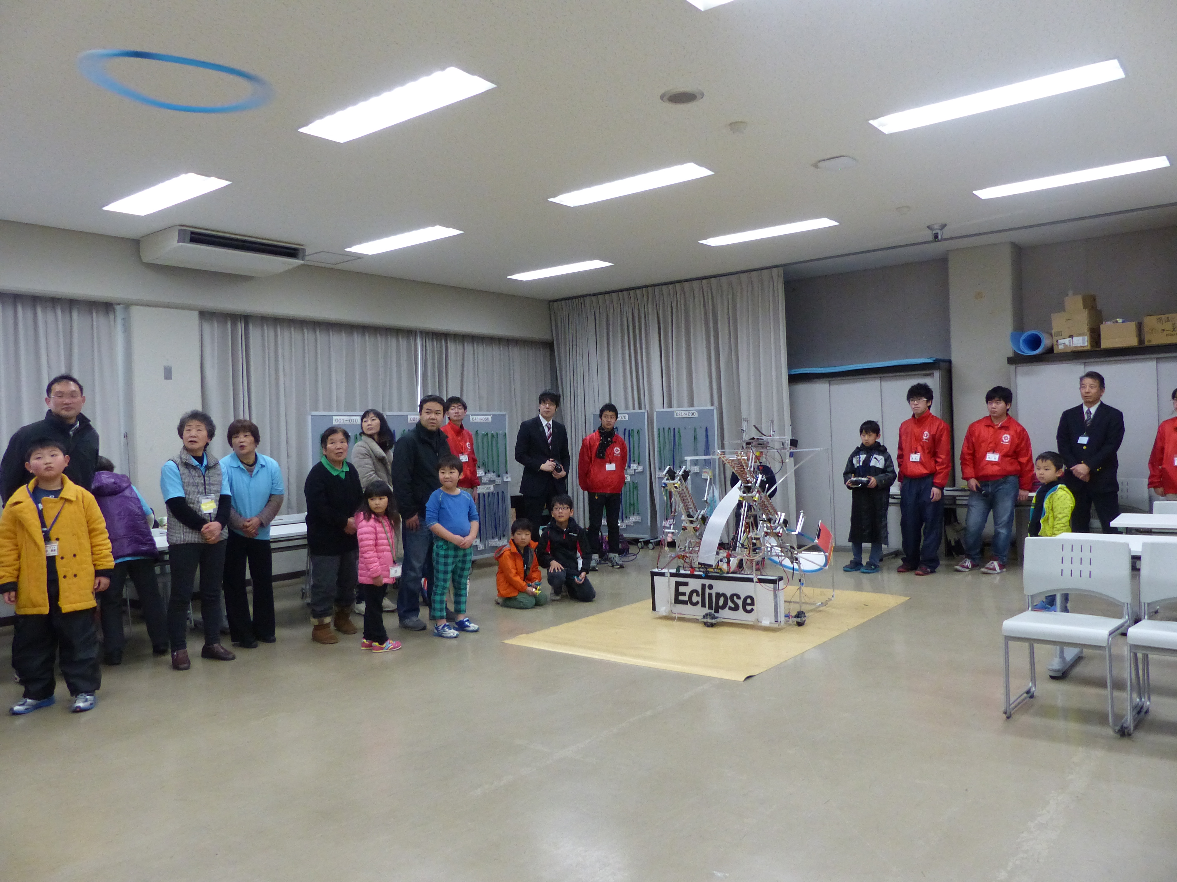 詫間キャンパスロボコンチーム「TEAM ARK」は、今年度の高専ロボコン2015に出場したロボットのデモンストレーションを行いました。子どもも保護者も、輪投げの輪が発射されるたびに歓声をあげていました。子ども達には、ロボコンロボットの操縦体験をしてもらい、実際のロボコンのセットと同じ台に向って輪を発射して、みんなで盛り上がることができました。