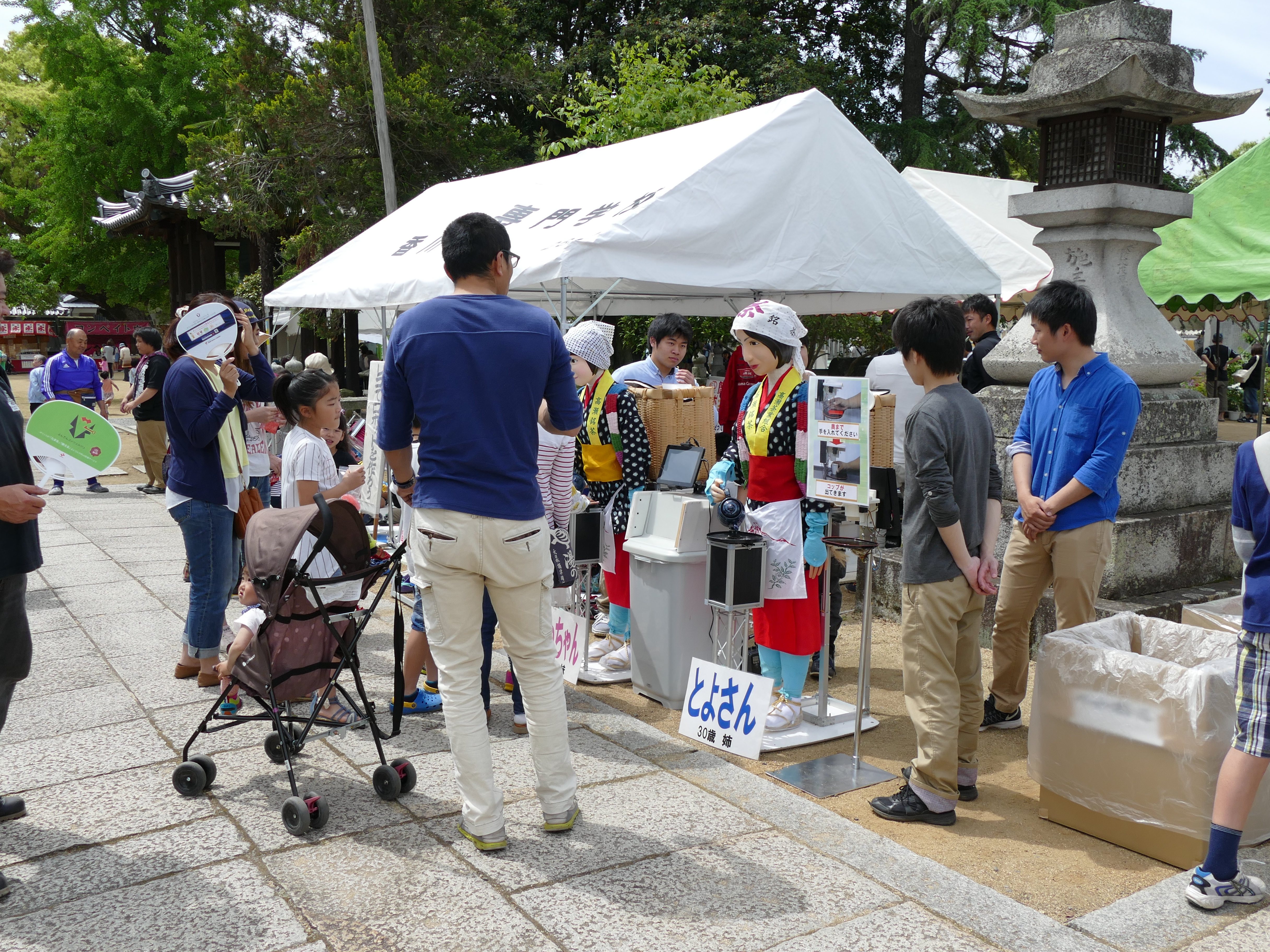 詫間キャンパスでは8日(日)に三豊市特産の高瀬茶をサービスするロボット「みっちゃん・とよさん」のお接待と三豊市の物産PRを行いました。