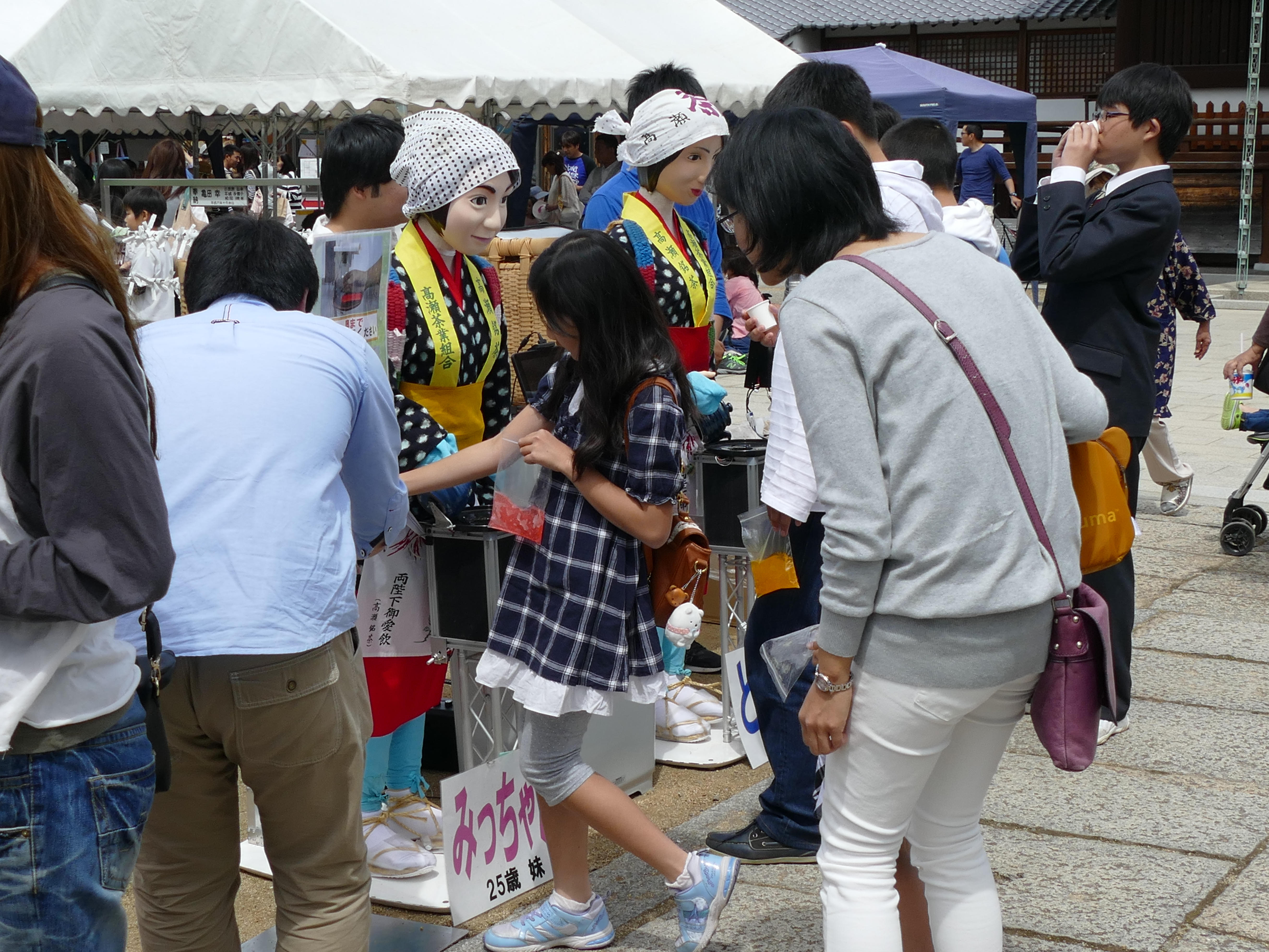 当日は暑いくらいの良い天気で、「みっちゃん・とよさん」の冷茶接待が子供から大人まで大人気でした。手をかざすとコップが出る装置、お茶娘の姉妹ロボット「みっちゃん・とよさん」の持つ急須から自動でお茶が注がれる装置で、たくさんの方に高瀬のおいしい新茶を味わっていただけました。