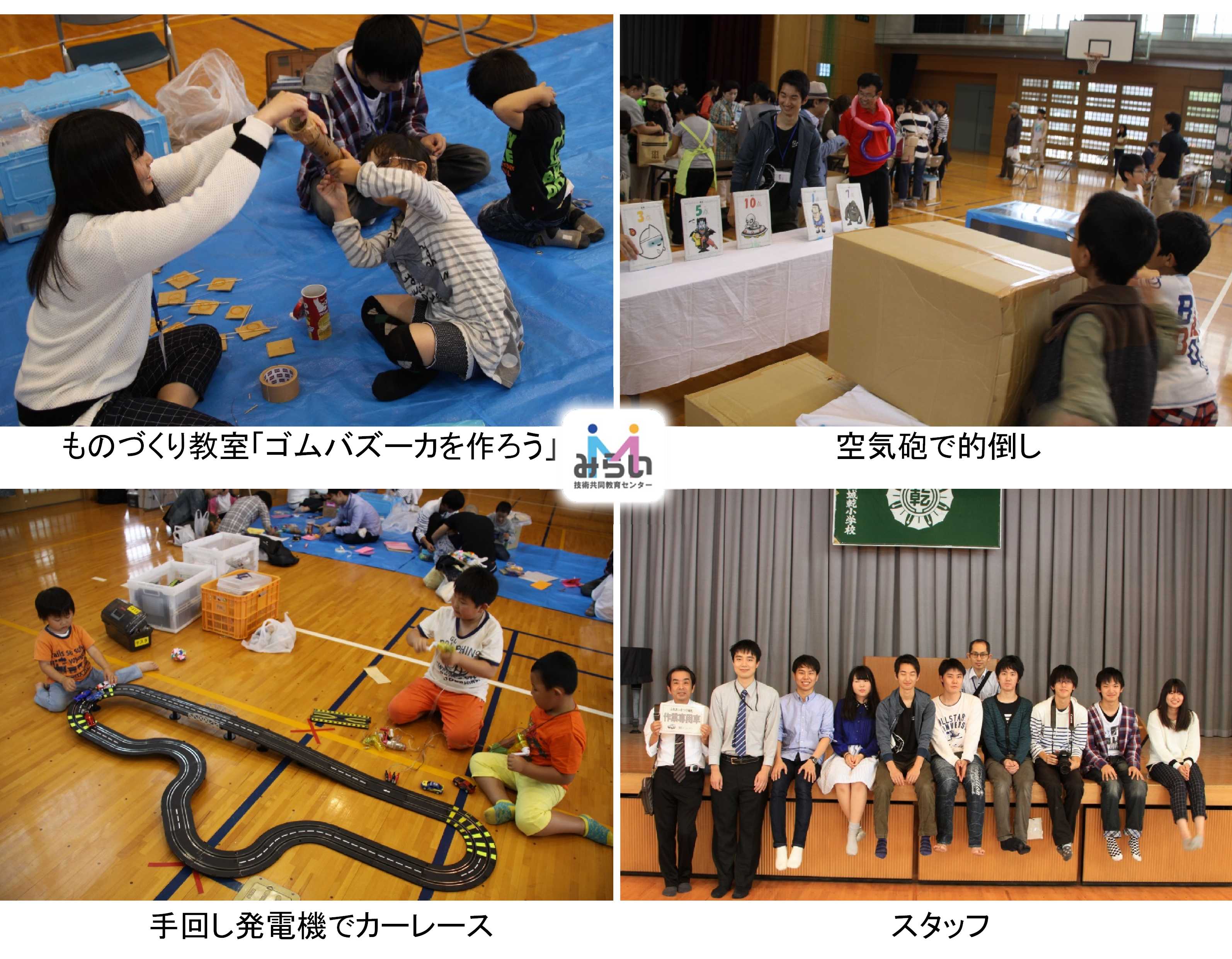 雨天の中、大勢の方々にご参加いただき誠にありがとうございました。当日、展示コーナーでは無限に回り続ける無限ゴマや空気砲での的倒し、手回し発電機を用いたカーレースなど、子どもたちに楽しんでいただける催し物を数多くご用意しました。また、ものづくりコーナーではゴムバズーカの製作教室を開き、多くの子ども達に参加していただきました。