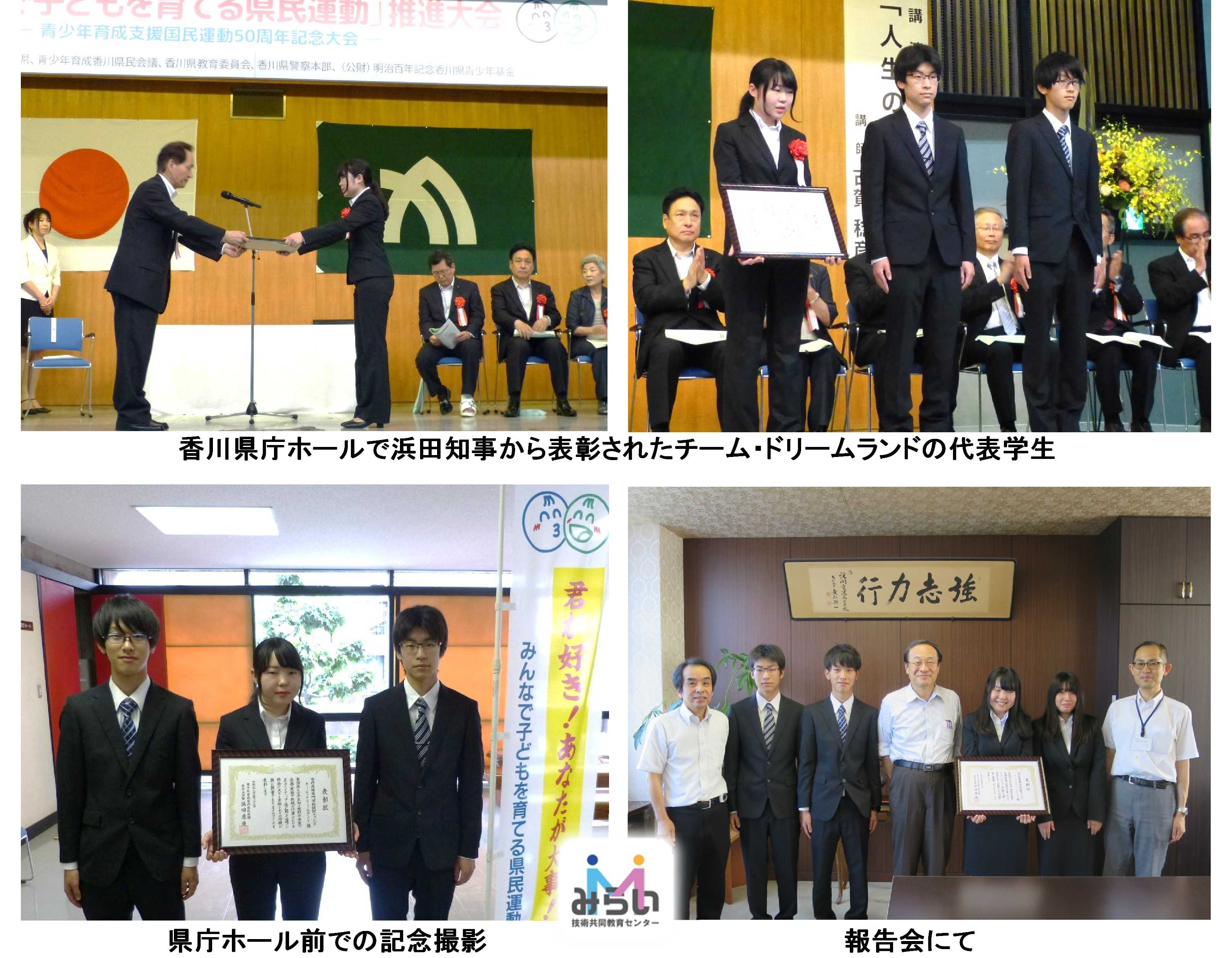 5日26日(木),本校詫間キャンパスチーム・ドリームランドが,香川県庁ホールにおいて,『平成28年度青少年育成香川県民会議青少年善行者表彰』を受賞しました。