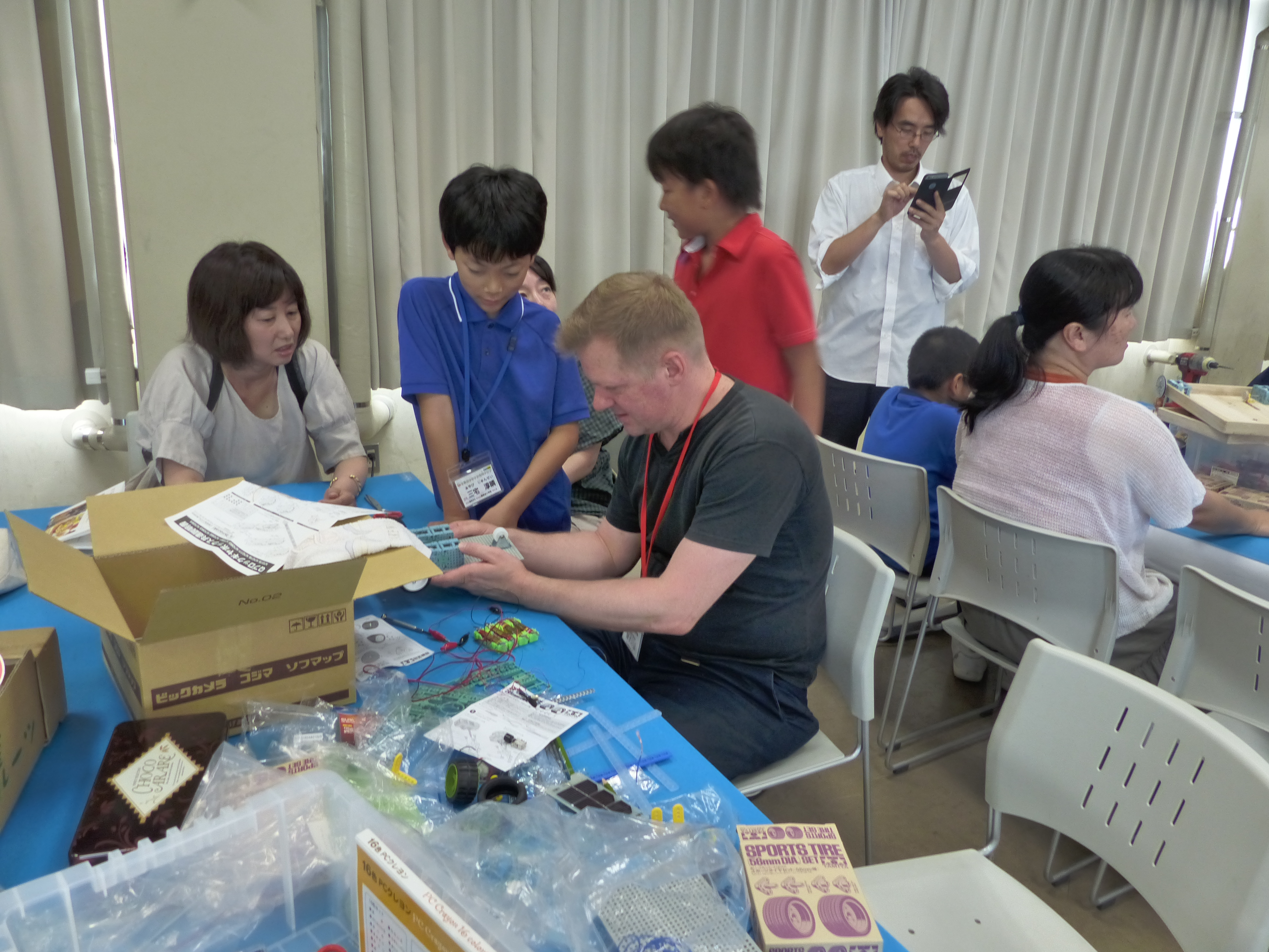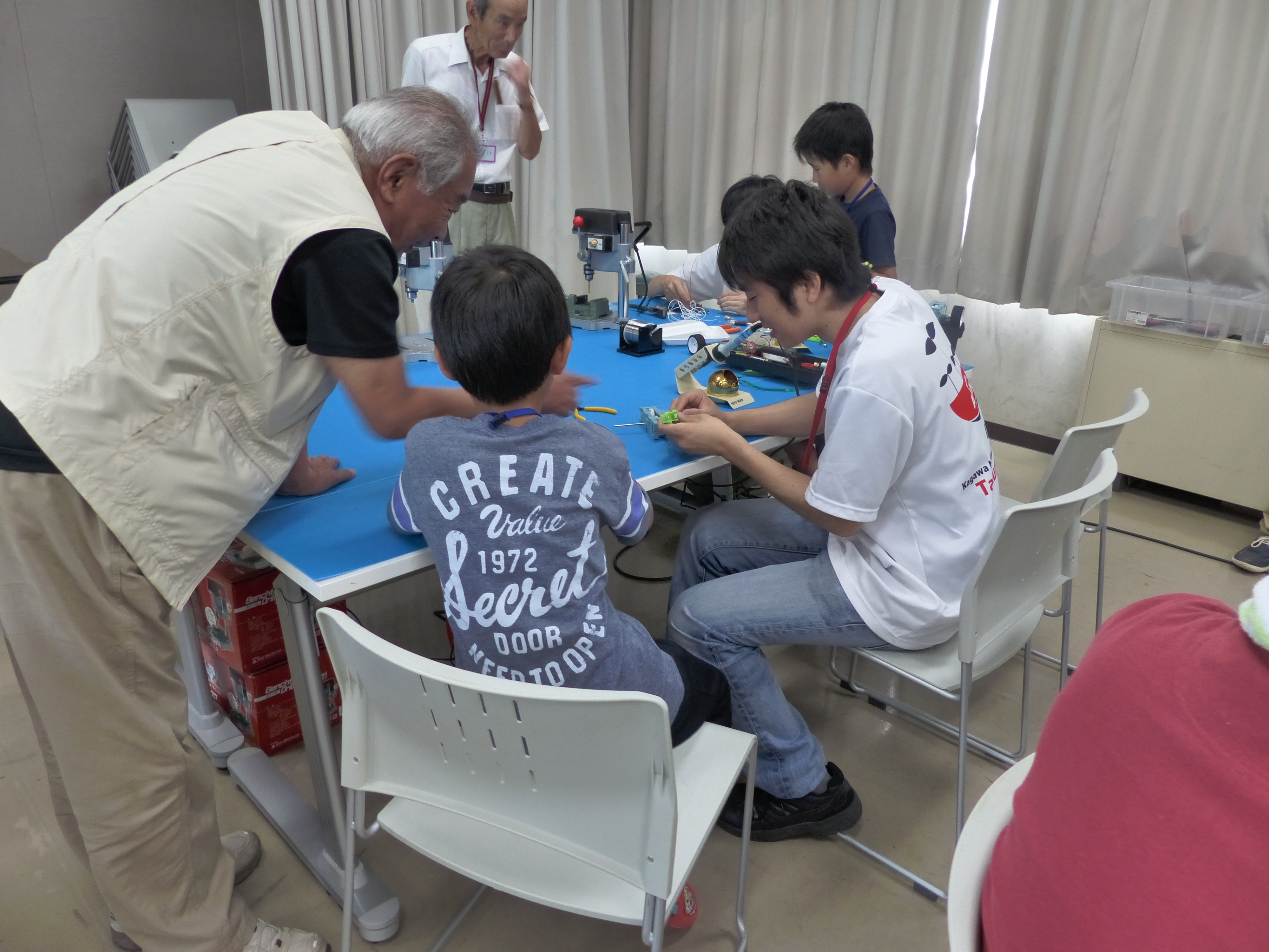 チャレコンの「からくりパフォーマンスカー」作りでは、子ども達はTEAM ARKの学生と一緒にボール盤や半田ごてを使ったりして、少し難しい作業にも挑戦していました。