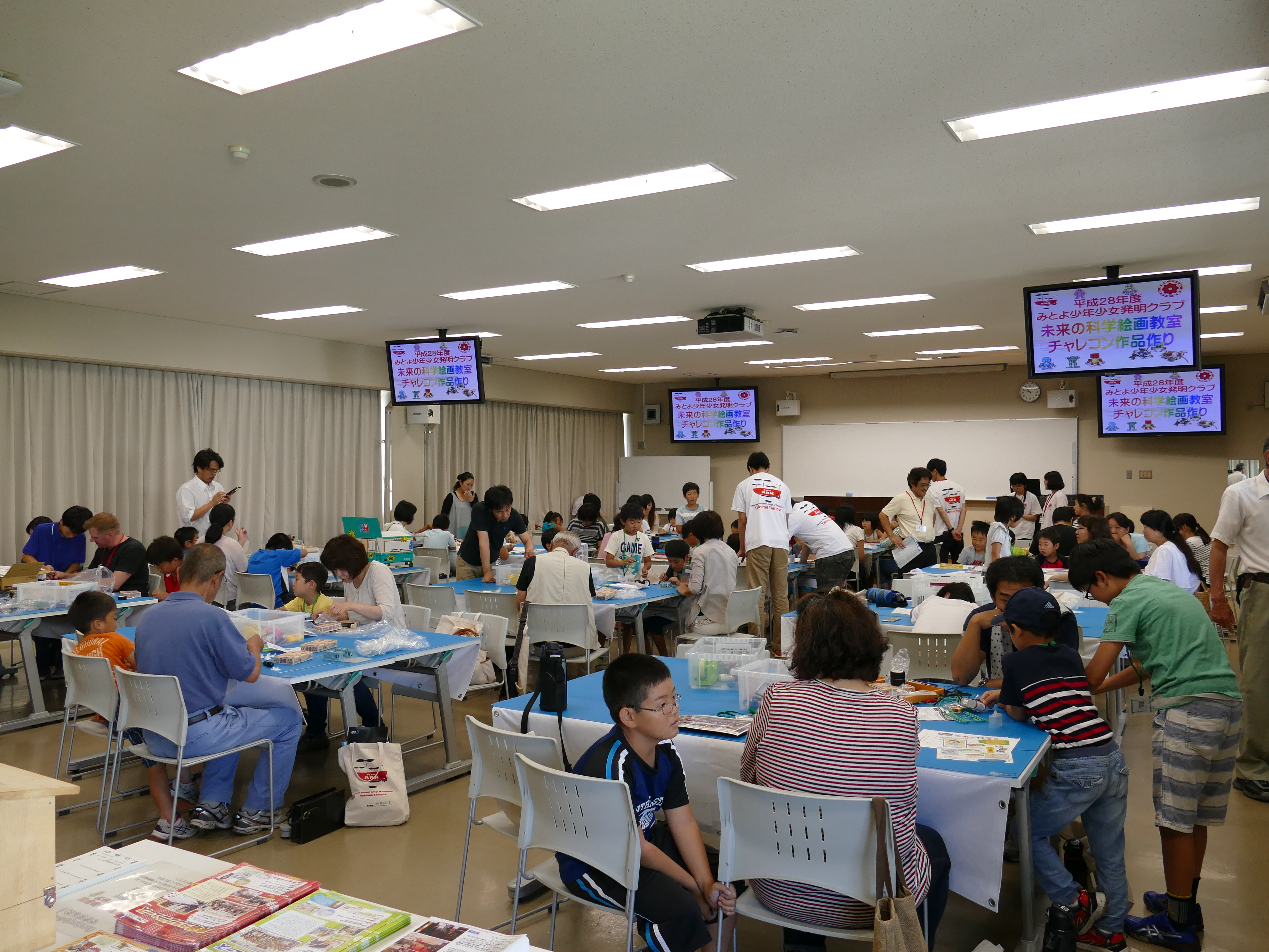 前回に引き続き、「未来の科学の夢絵画展」の絵画教室と、「全国少年少女チャレンジ創造コンテスト(チャレコン)」地区予選会に向けての「からくりパフォーマンスカー」作りを行いました。