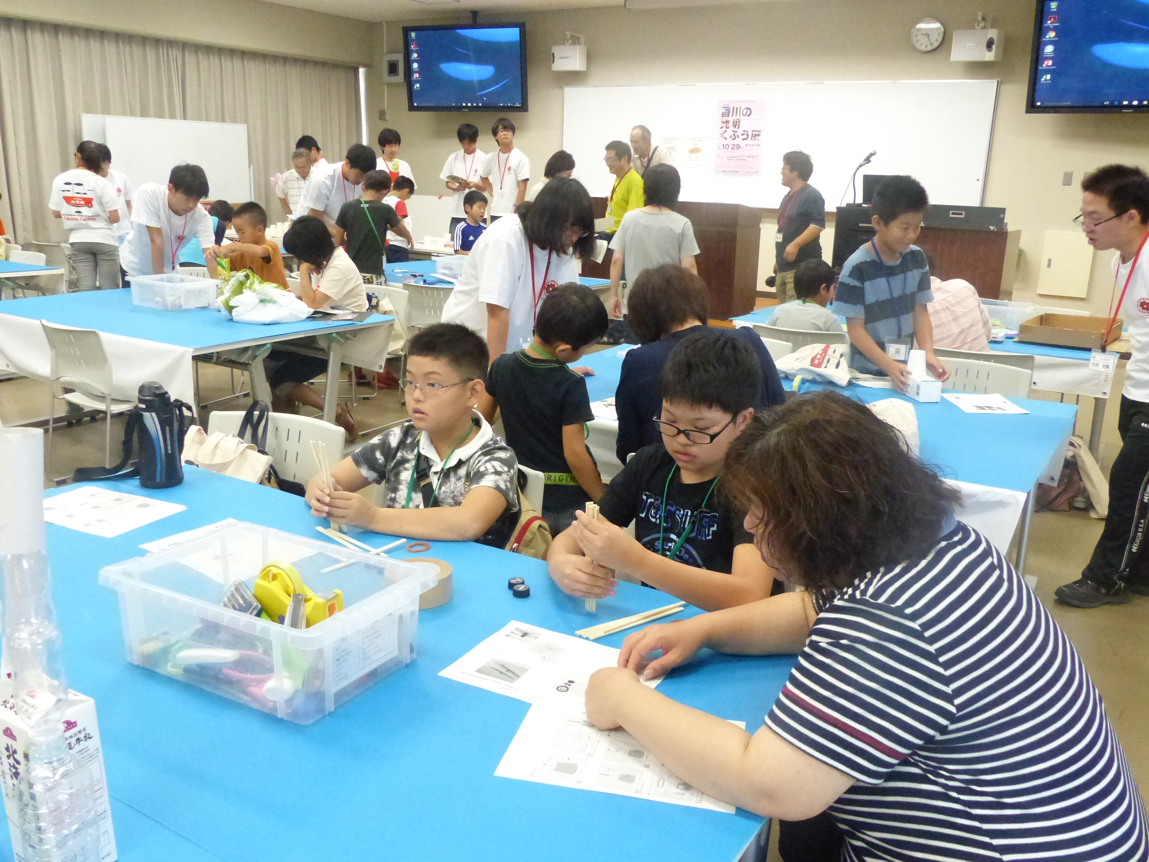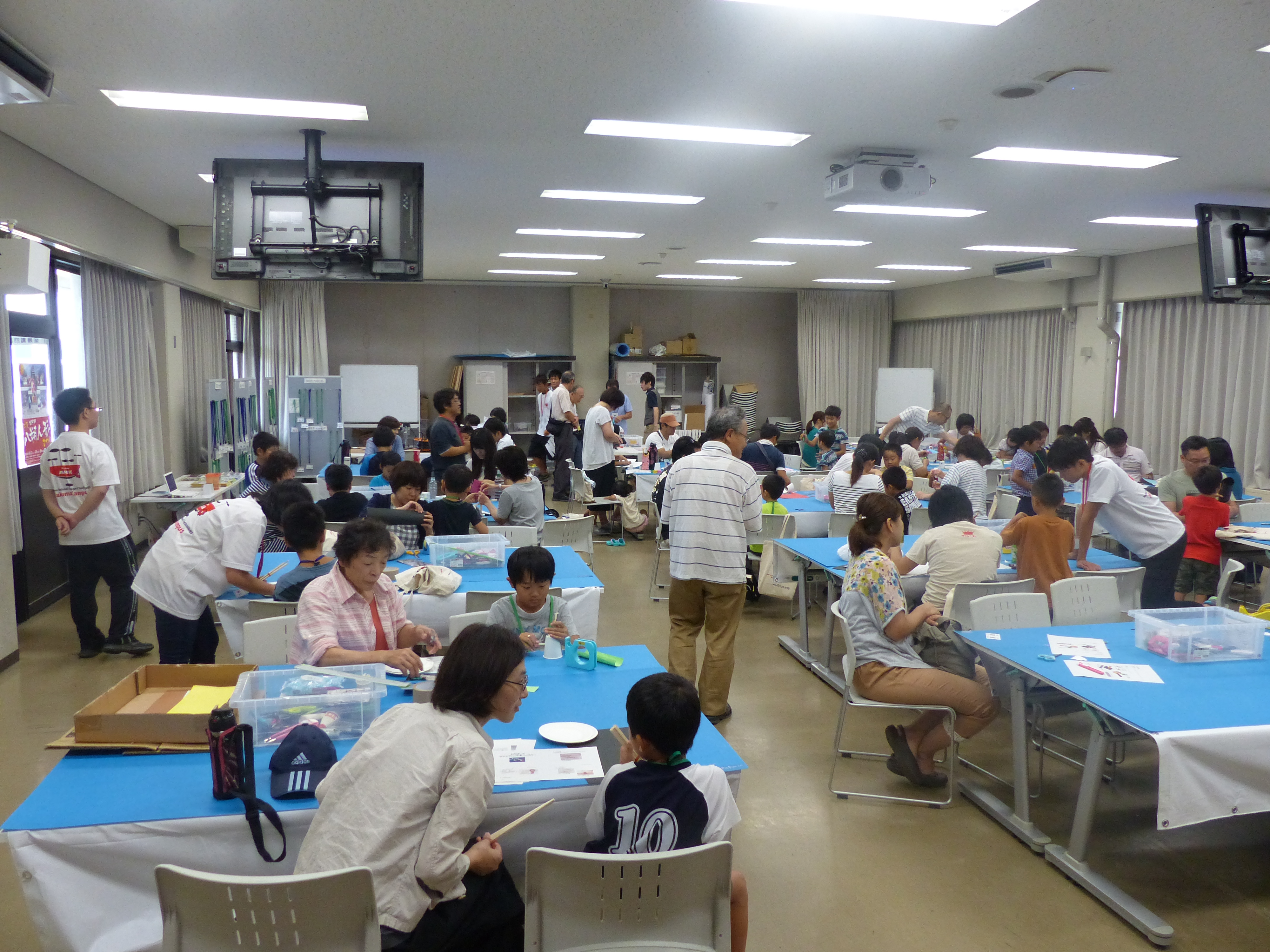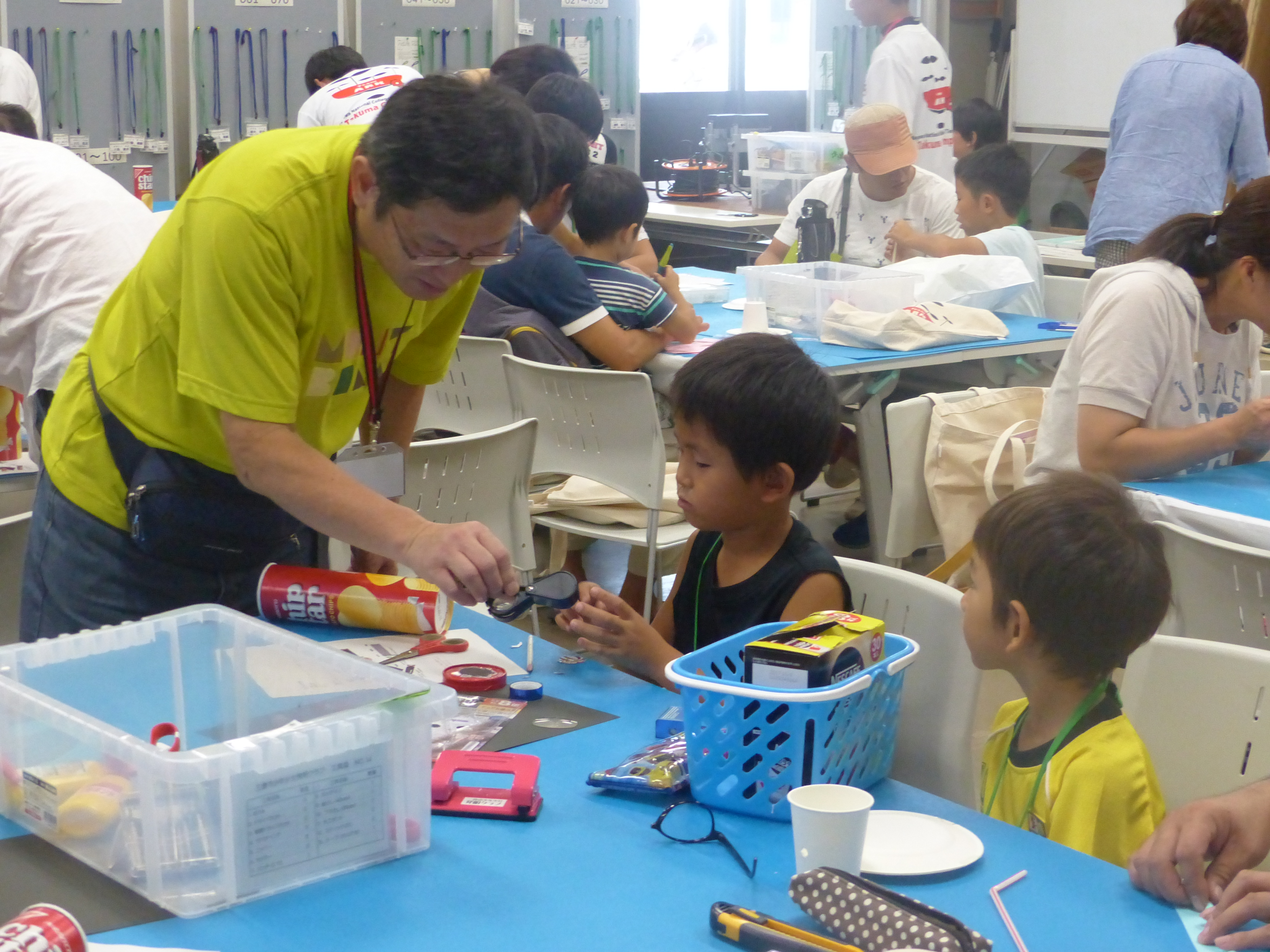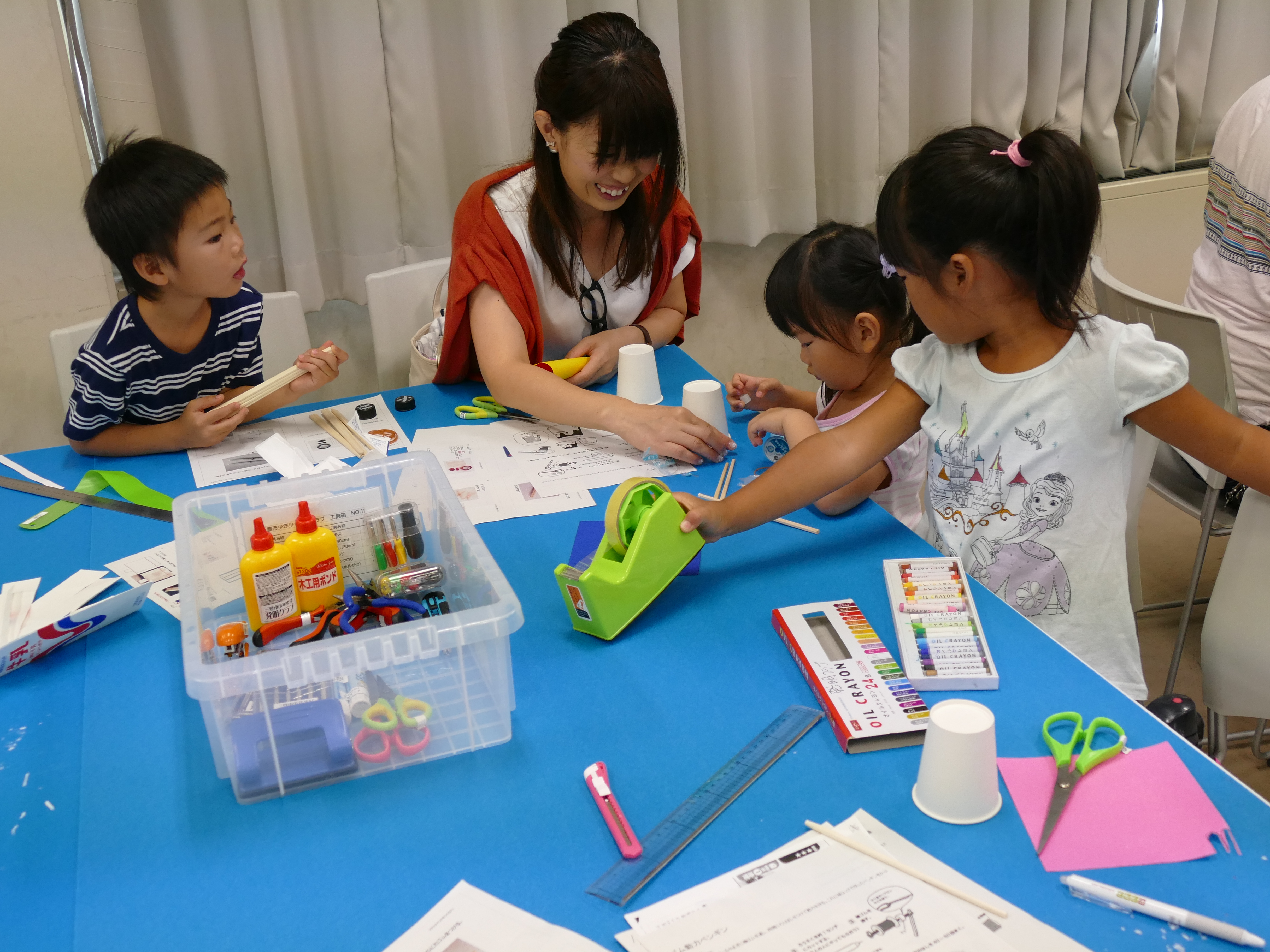 7/22の第1回、8/9の第2回に引き続き、「めがね望遠鏡」「ゴム動力ペンギン」「空中ブランコ」「パタパタかえる」「牛乳パックせんす」「マジックハンド」など、簡単な作業で取り組める工作に挑戦しました。