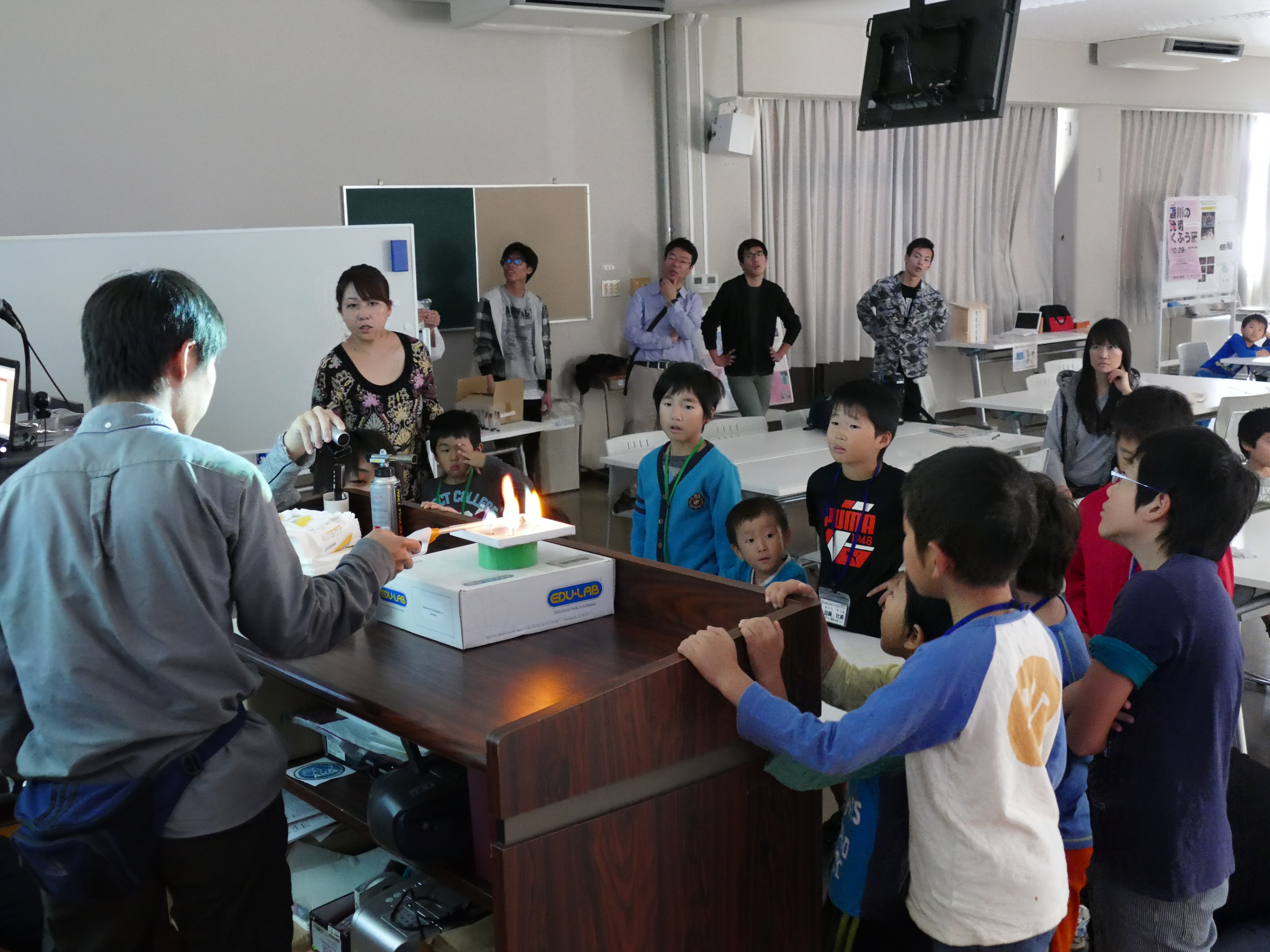 10月29日(土)、詫間キャンパスにて三豊市少年少女発明クラブの活動「おもしろ科学実験教室(2)」を開催しました。今回の活動も前回に引き続き、詫間キャンパス「科学クラブDEX」のみなさんが協力してくれました。